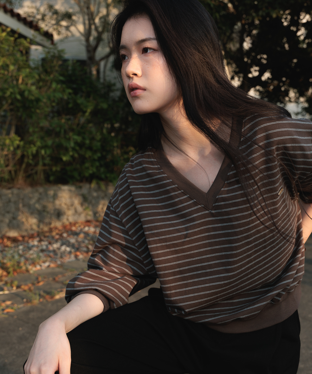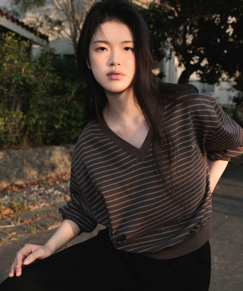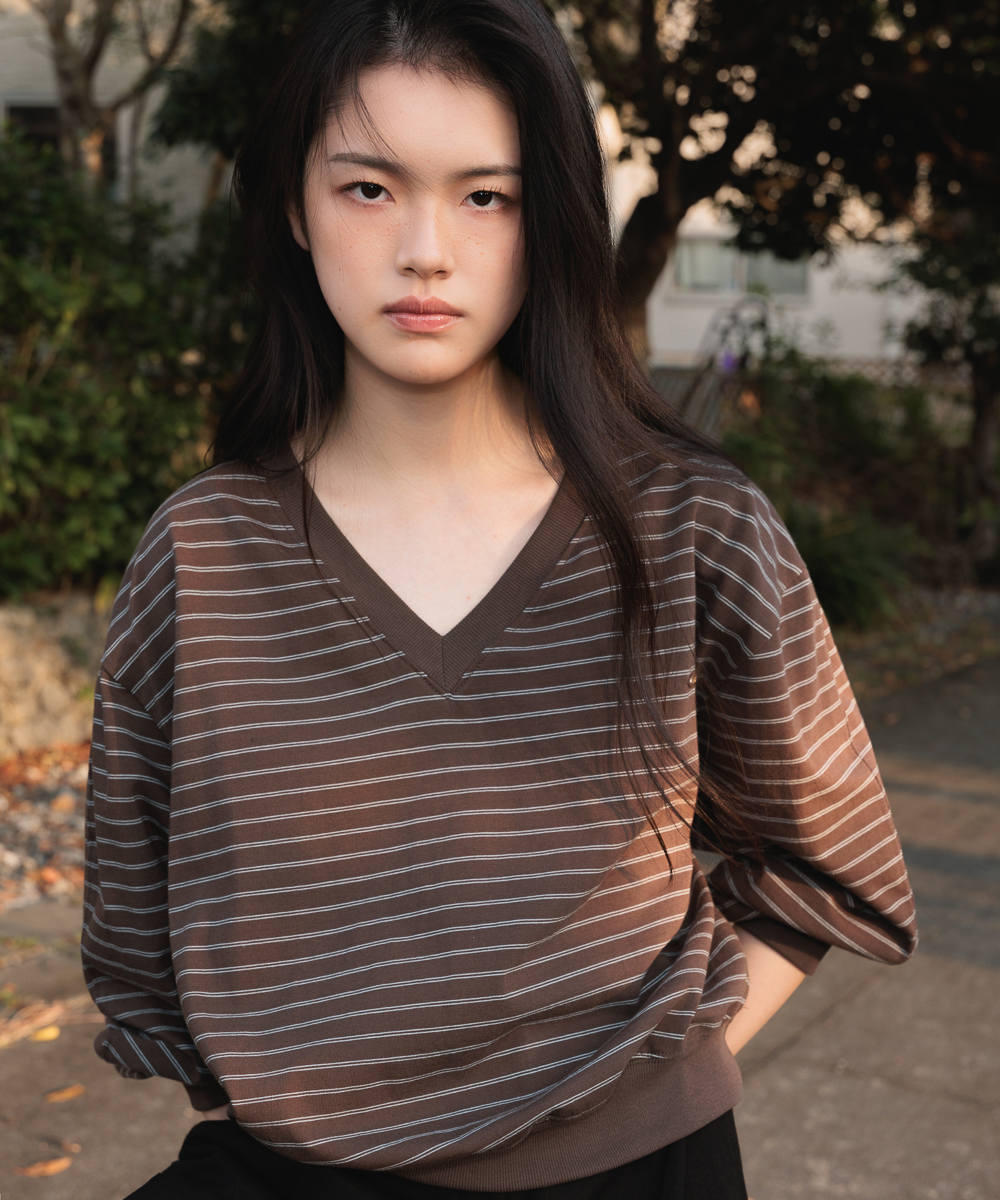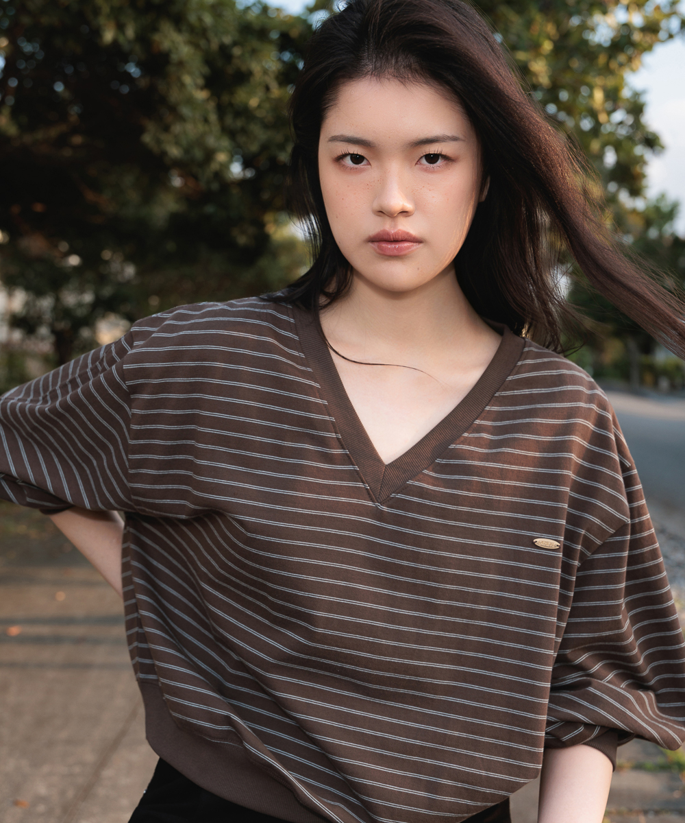 快適さとディテールを兼ね備えたVネックストライプボリュームスウェットシャツです。
