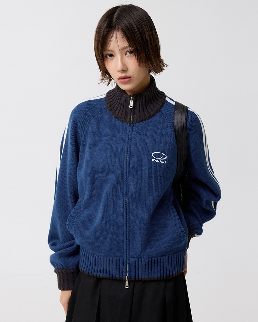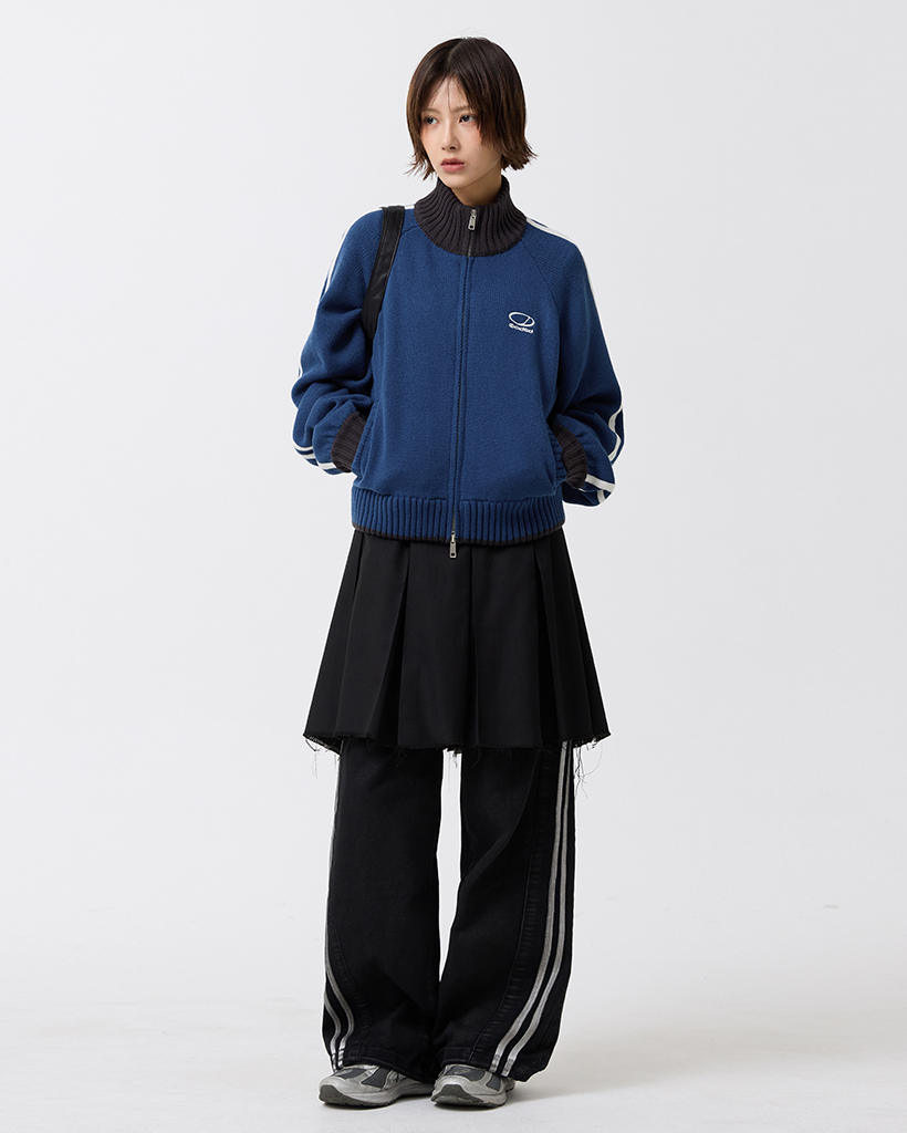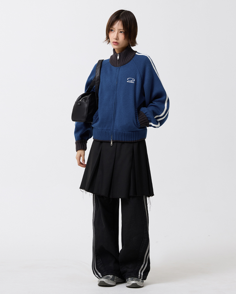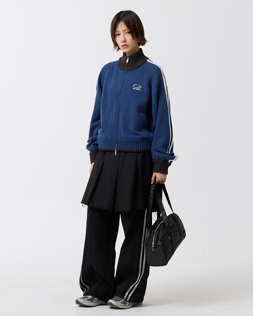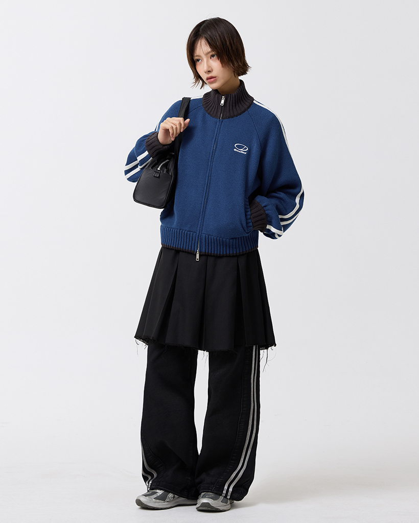 [K-POPアイドル着用] Sporty Track Semi Crop Knit Zip-Up - BLUE