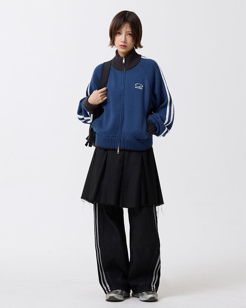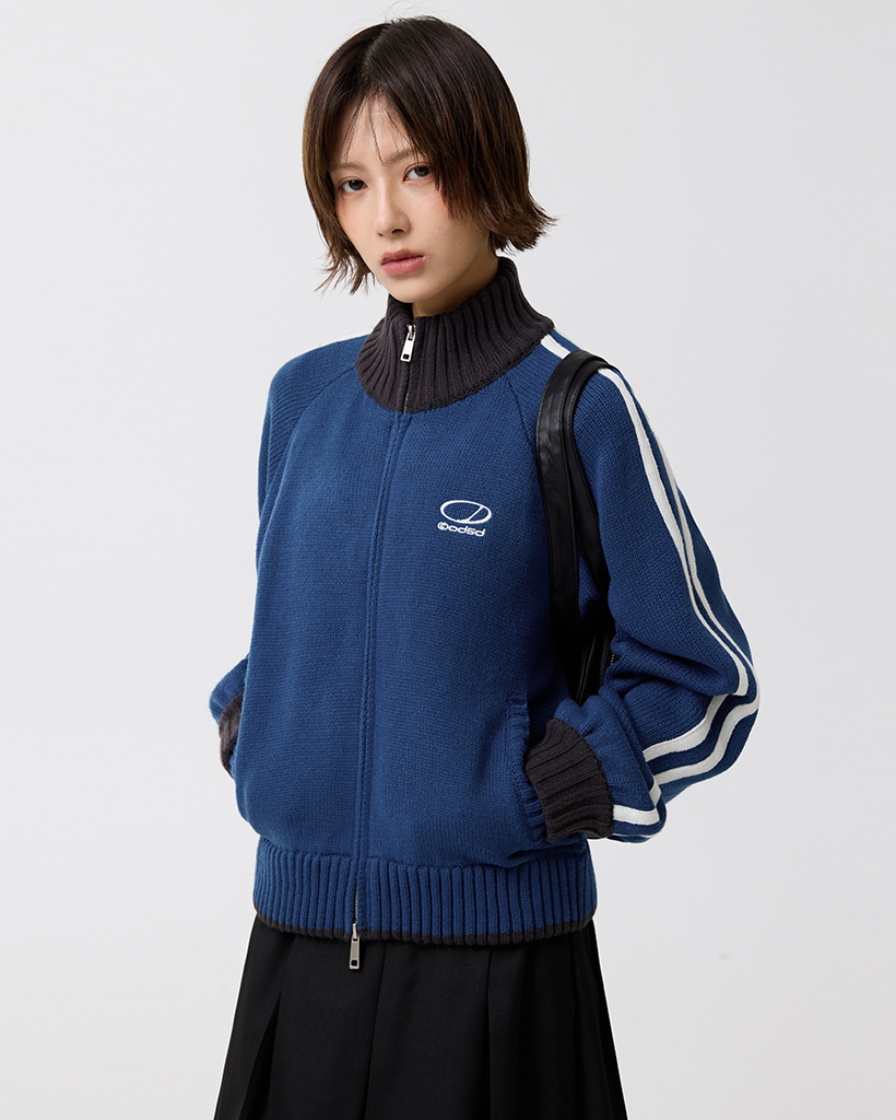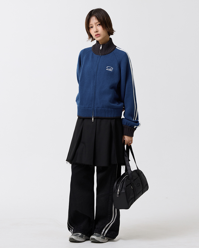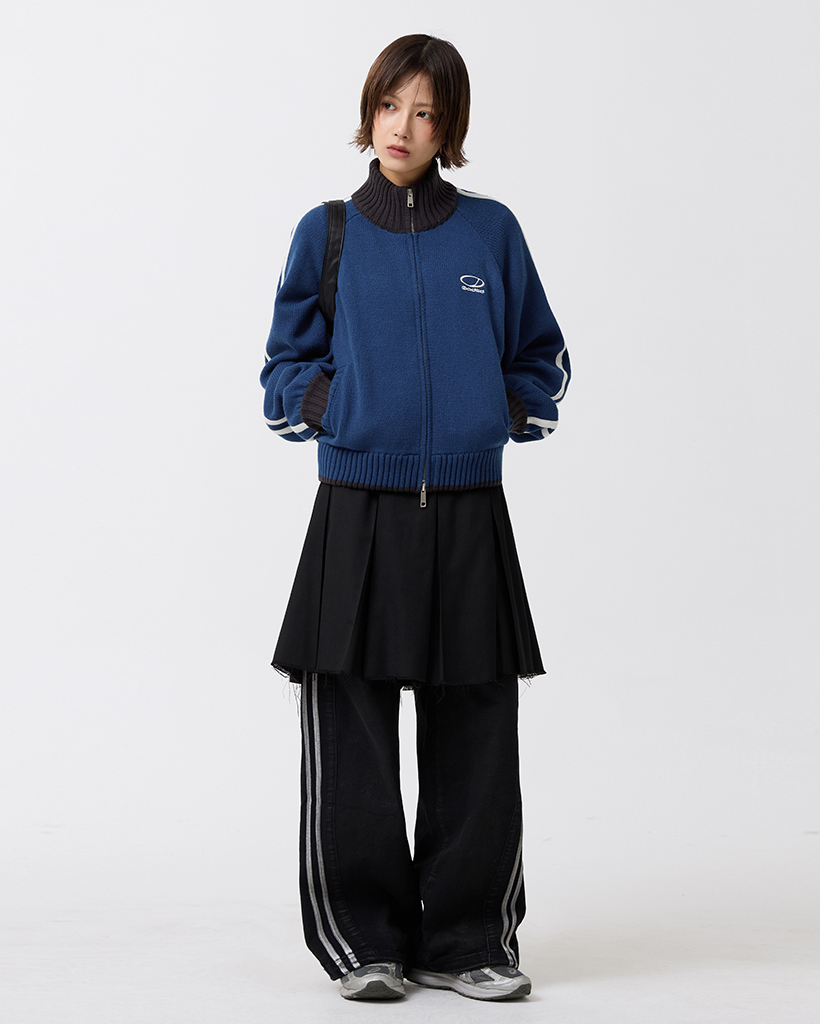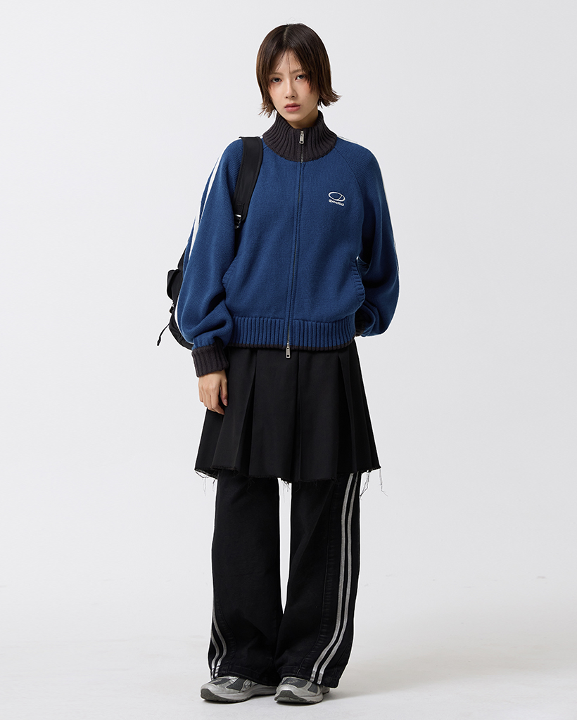 [K-POPアイドル着用] Sporty Track Semi Crop Knit Zip-Up - BLUE