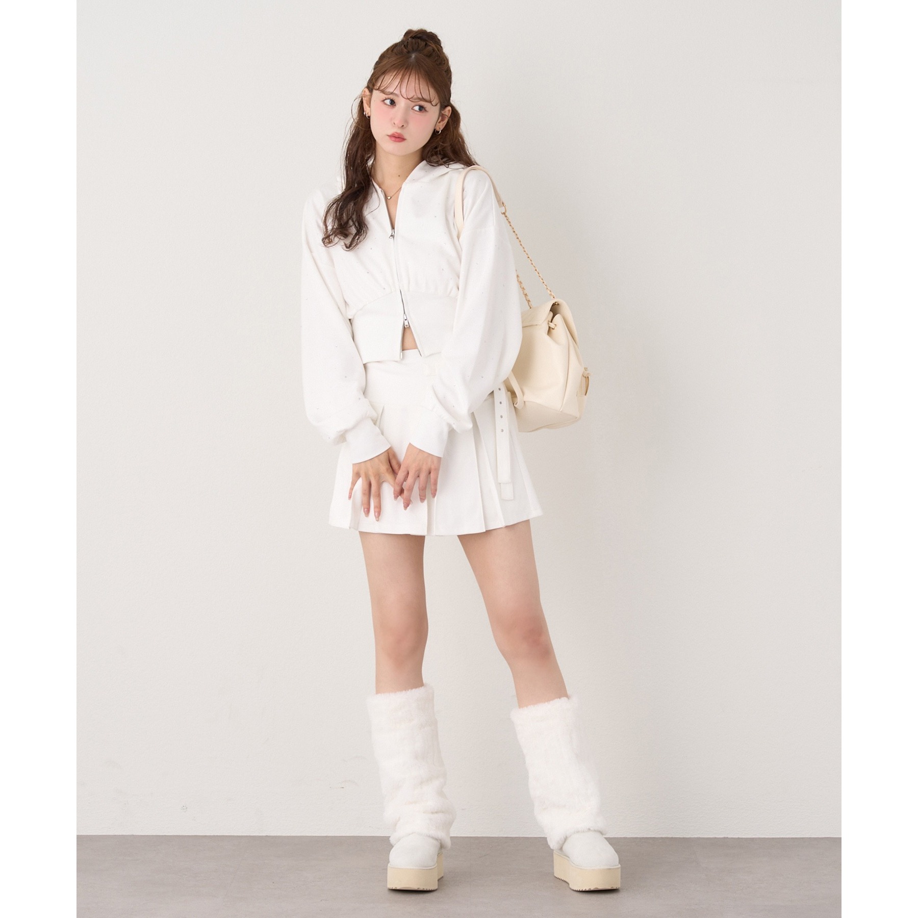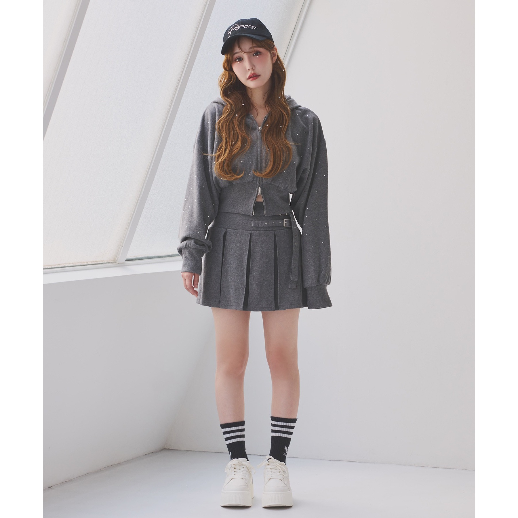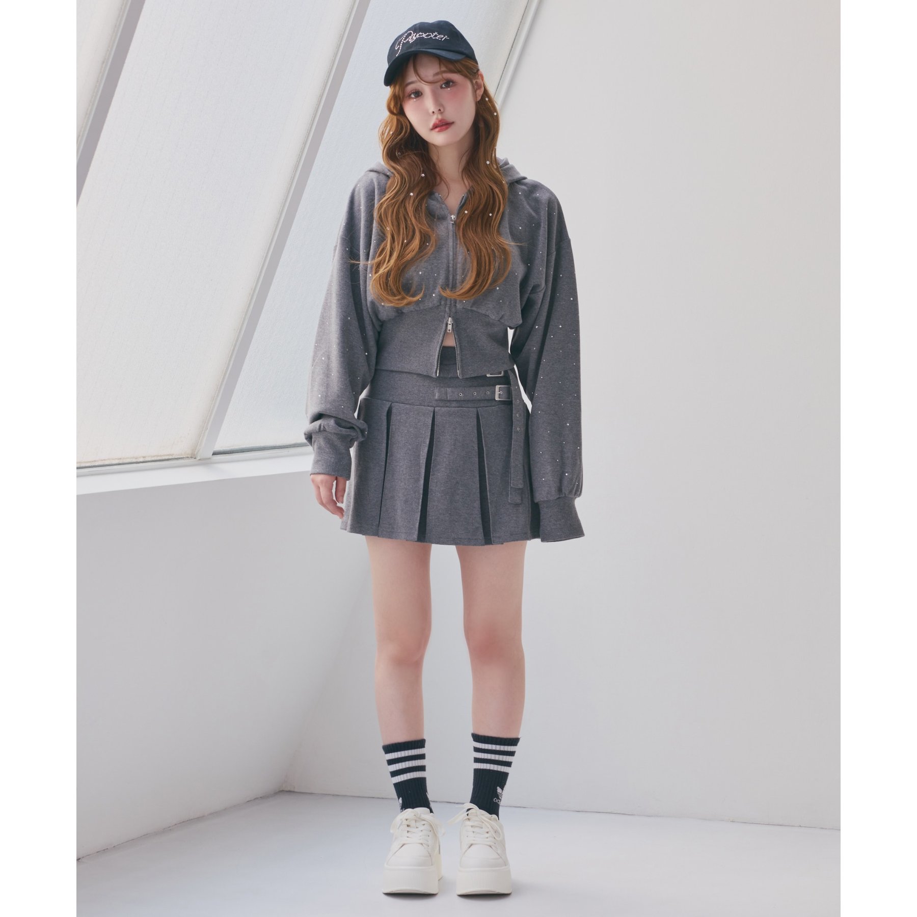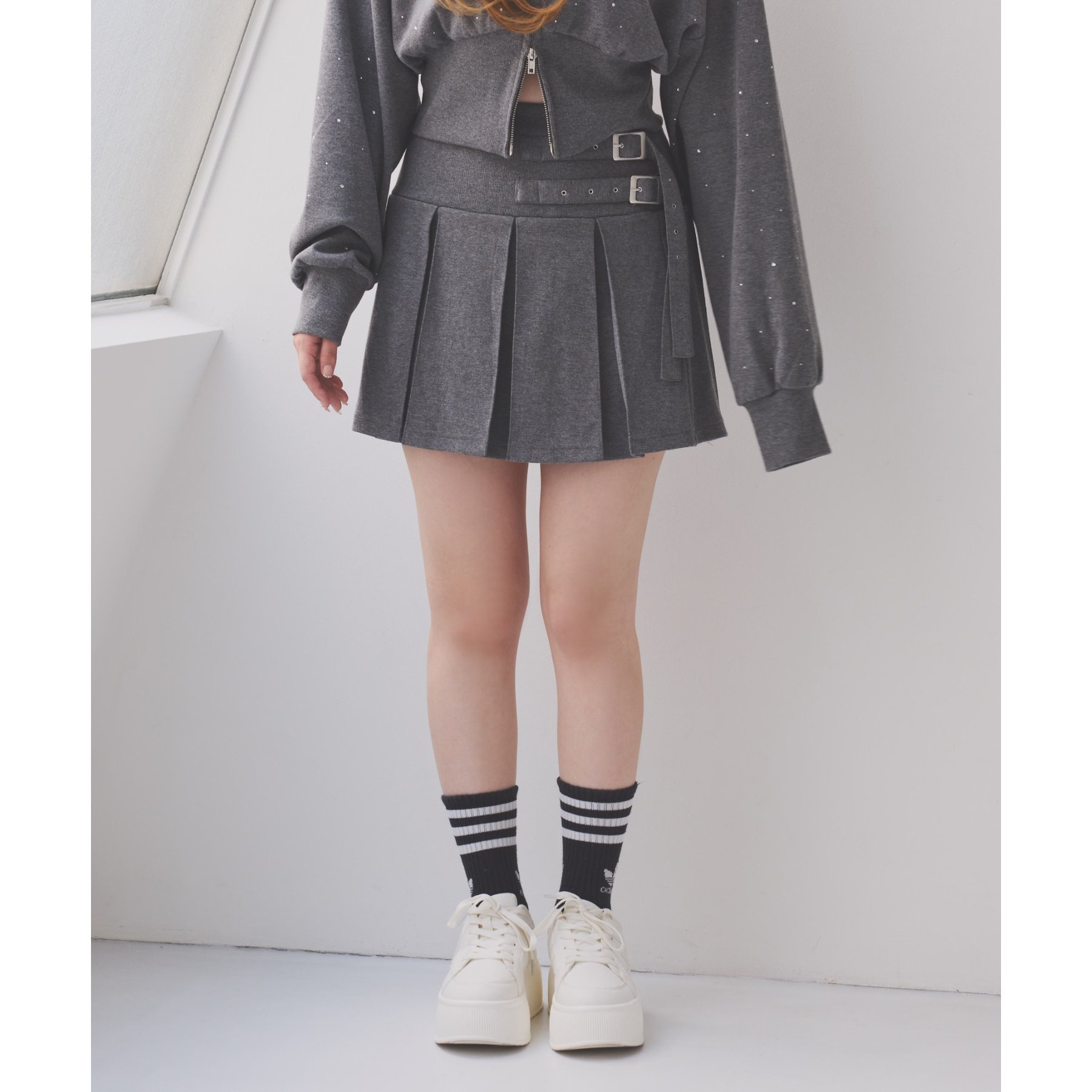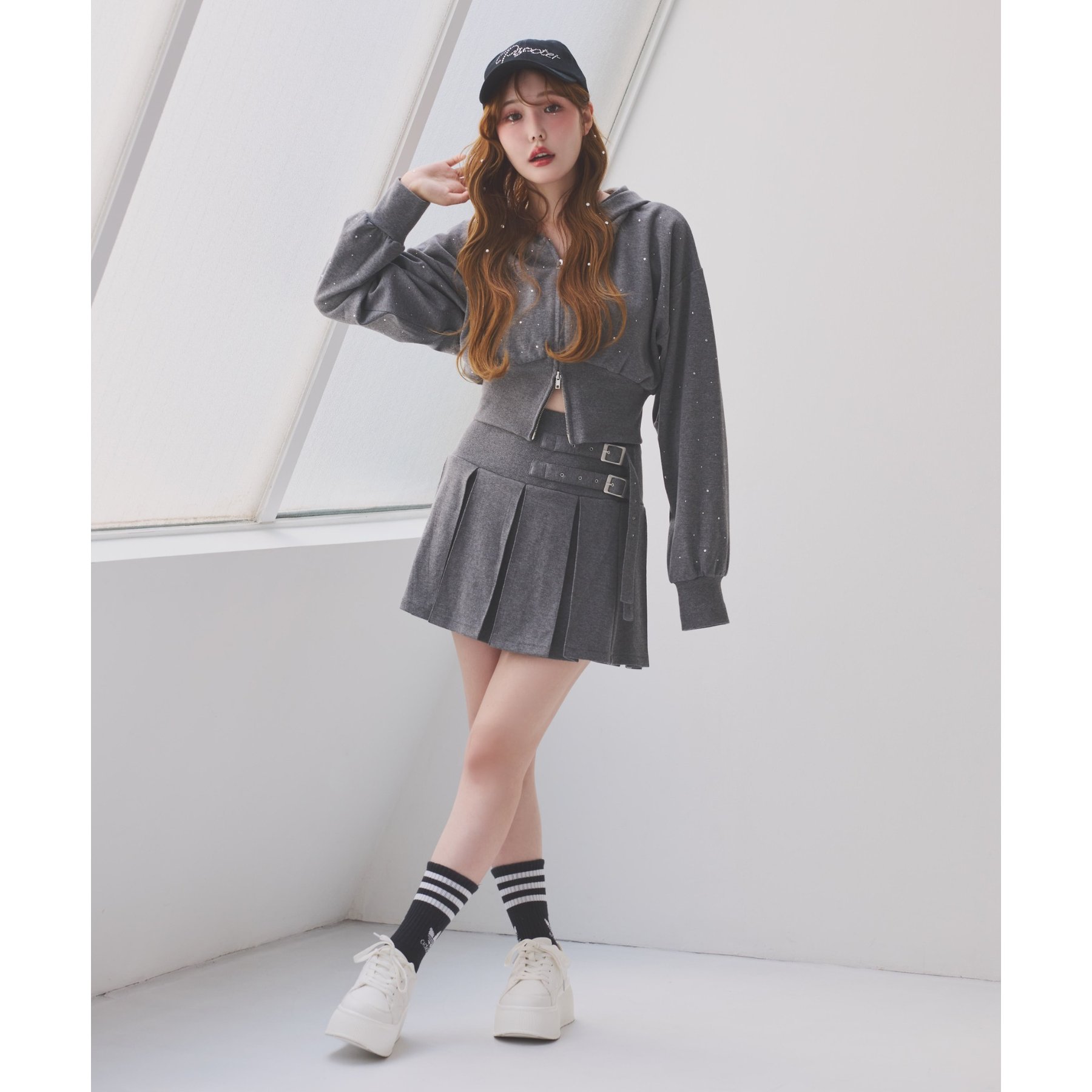 足元はハイソックス×スニーカーで、トレンド感溢れるスタイルに。