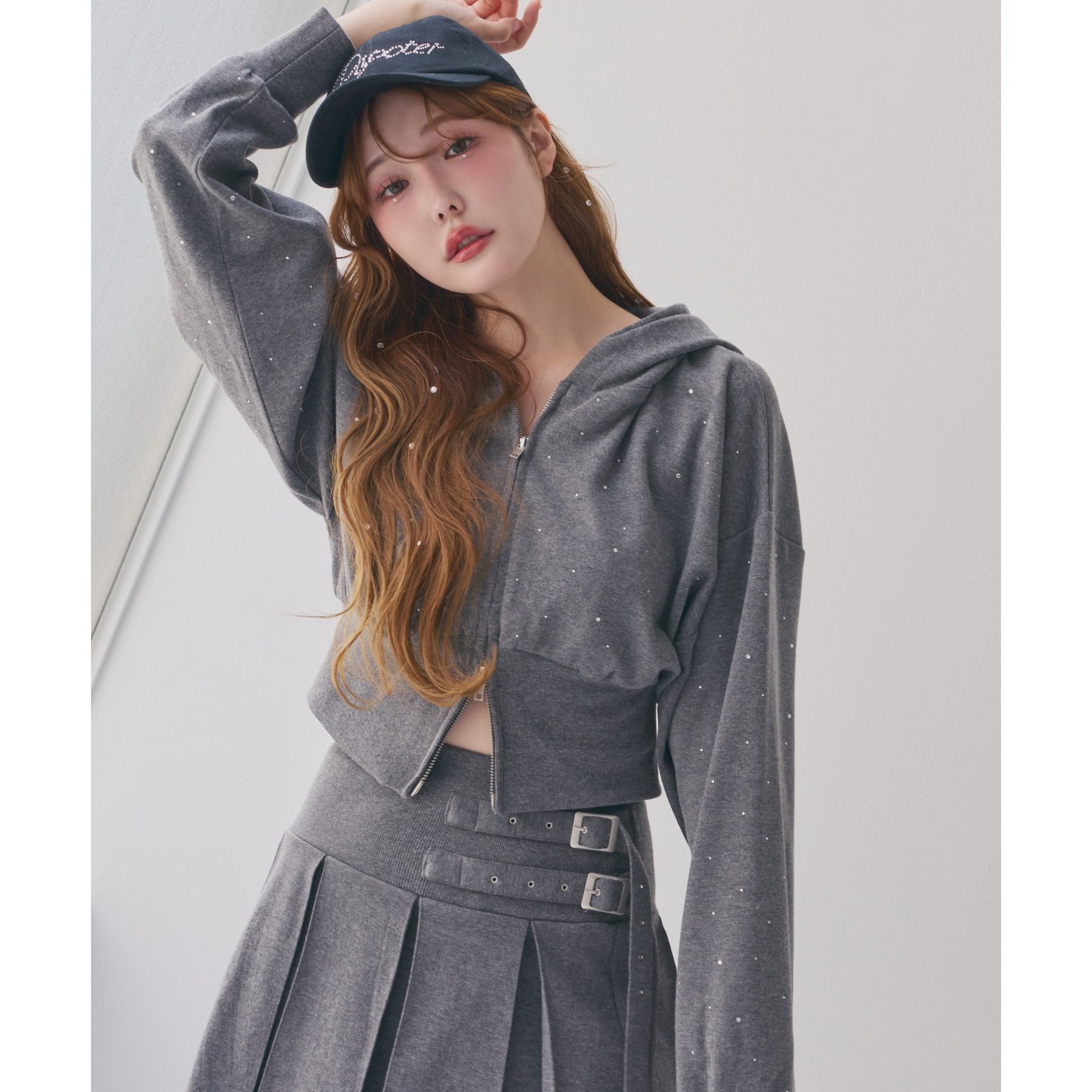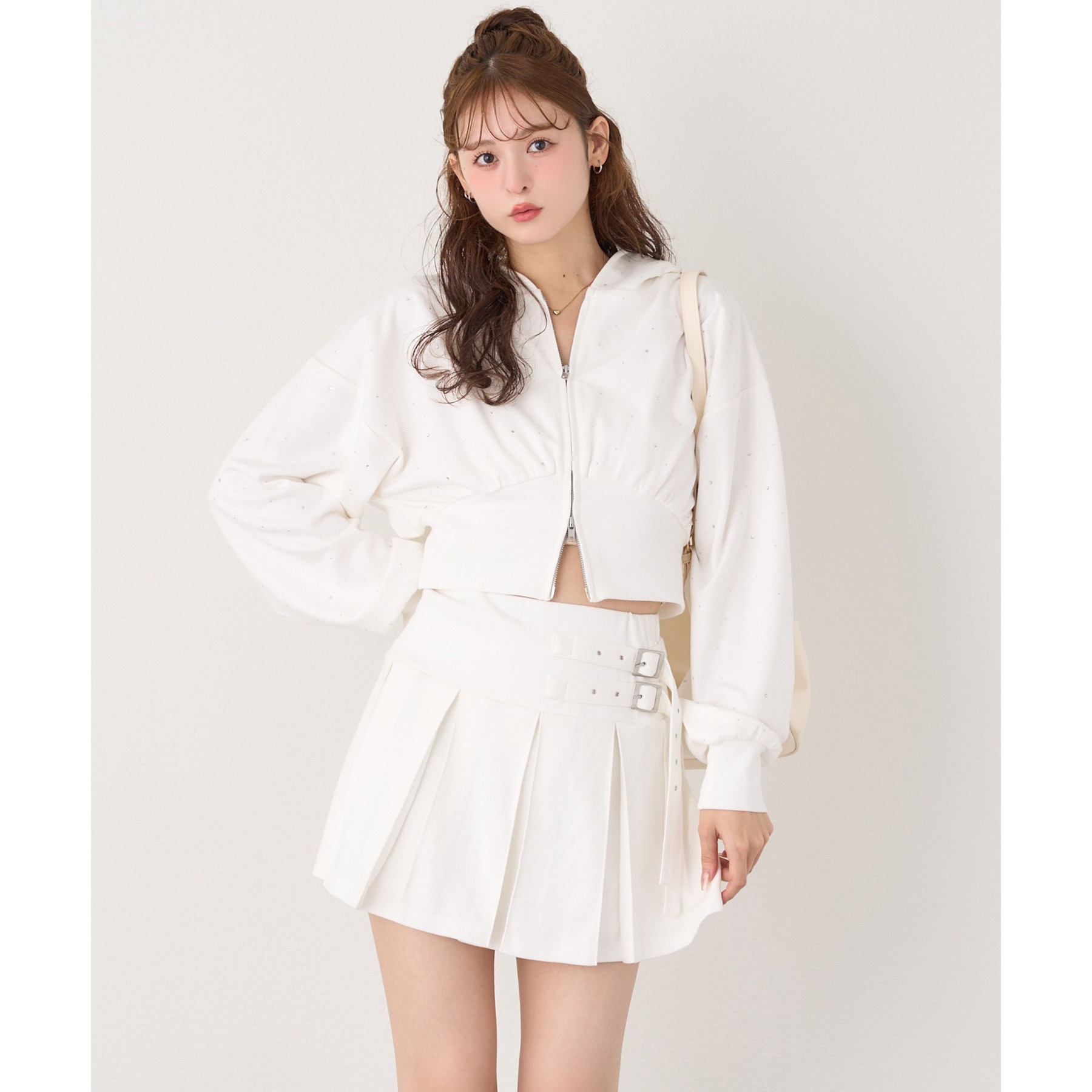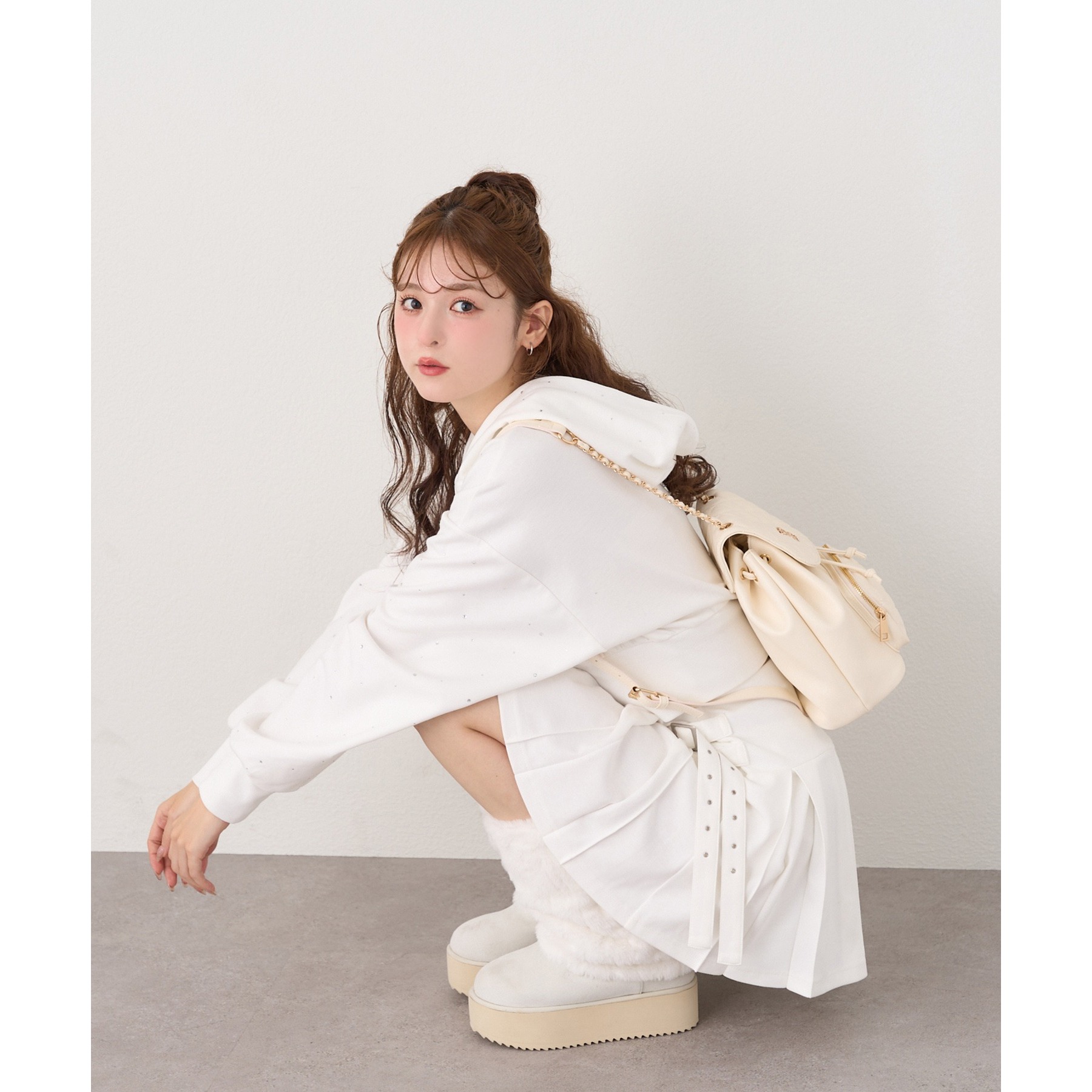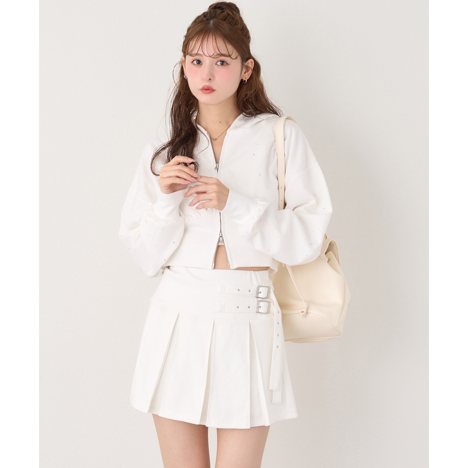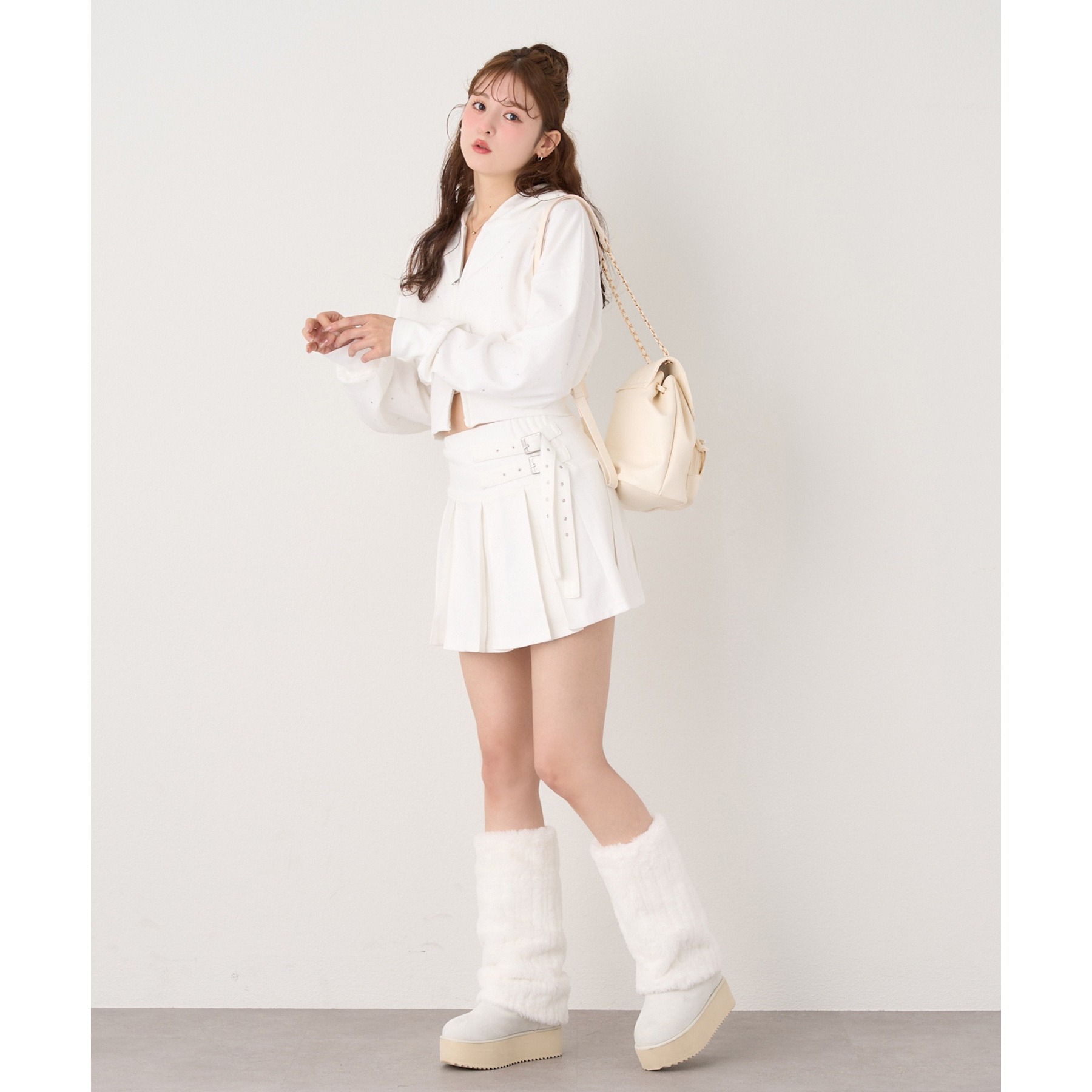 足元はハイソックス×スニーカーで、トレンド感溢れるスタイルに。