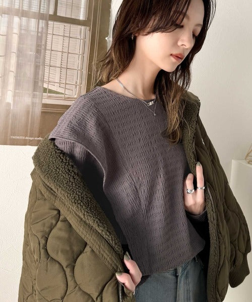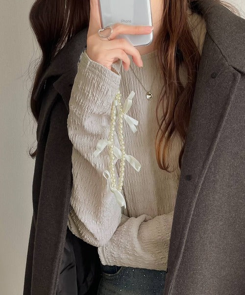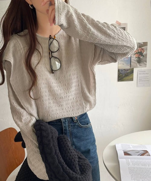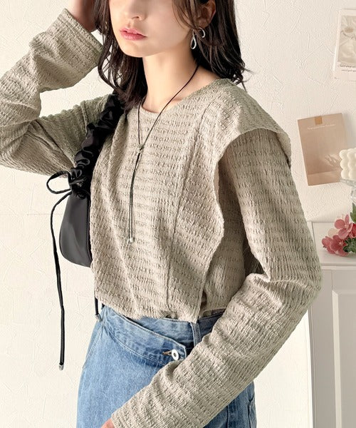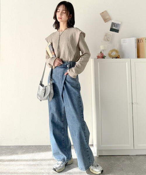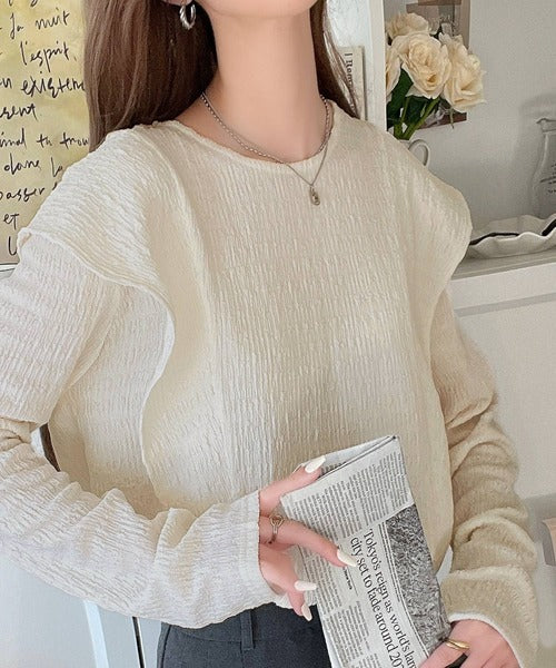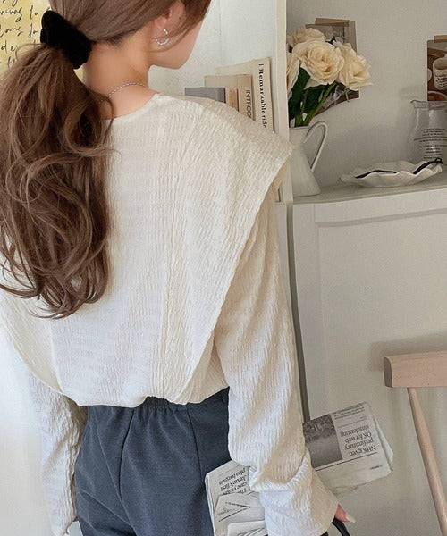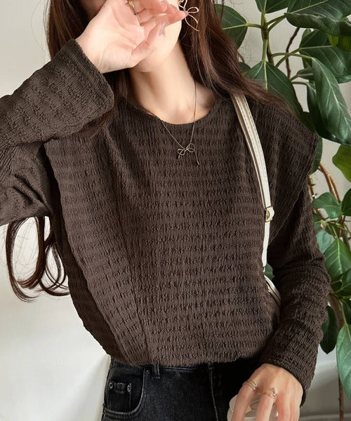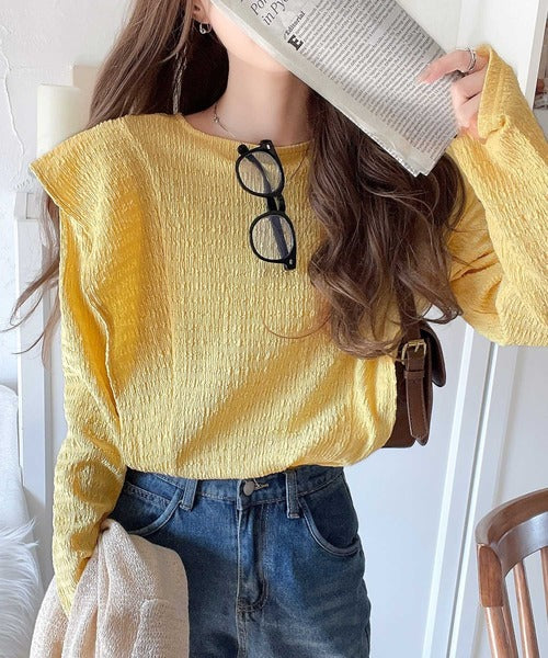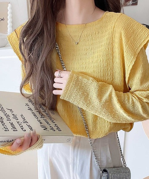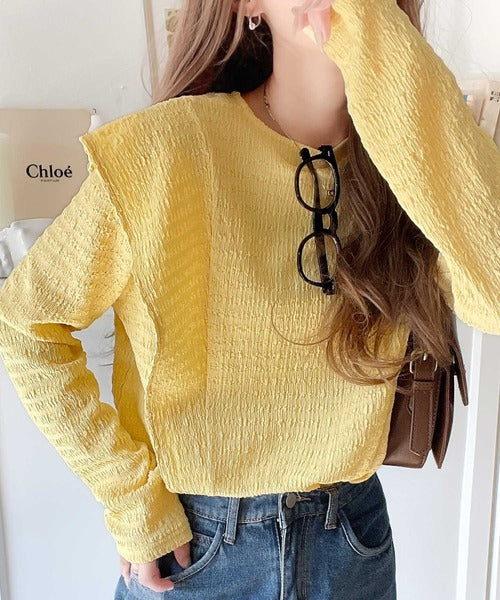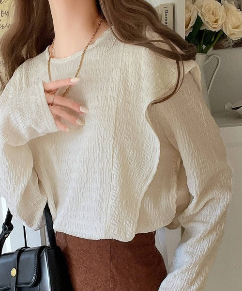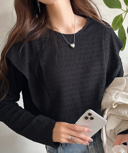 シンプルながらも、どこかワンポイントで華やかさを添えるフリルが魅力のトップス。