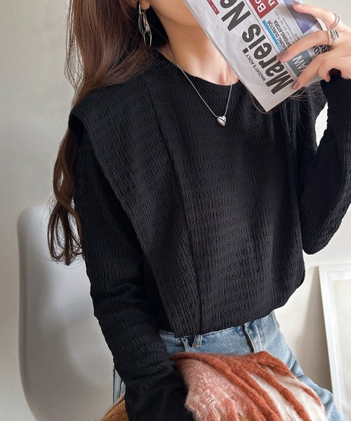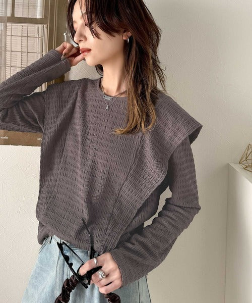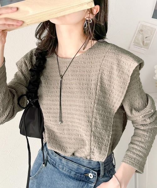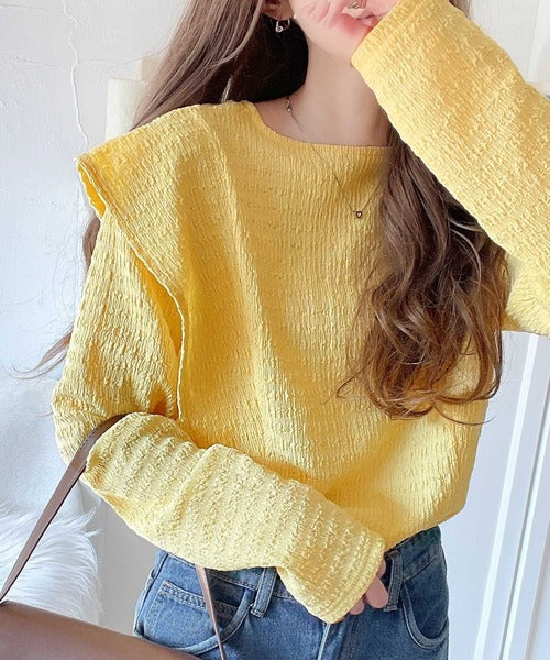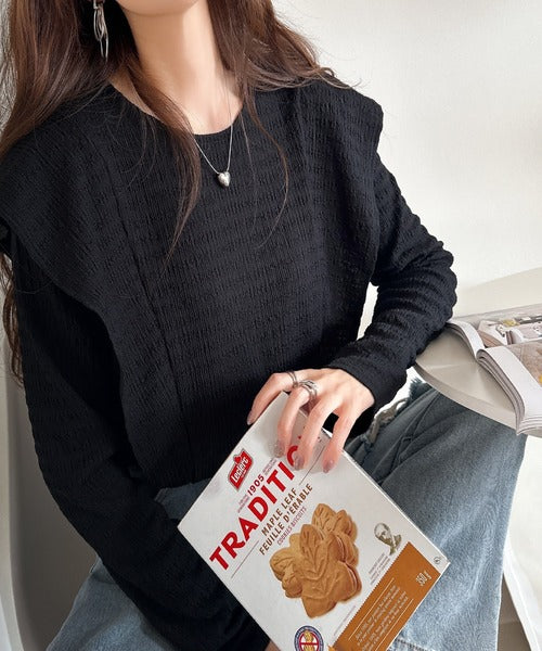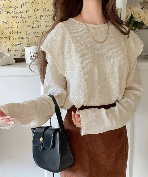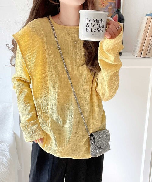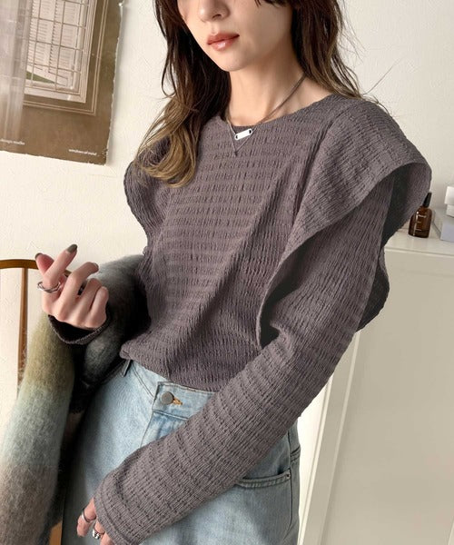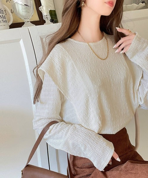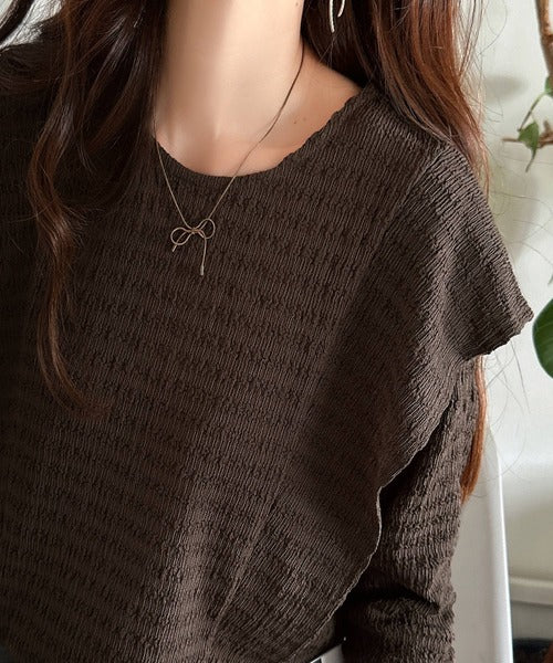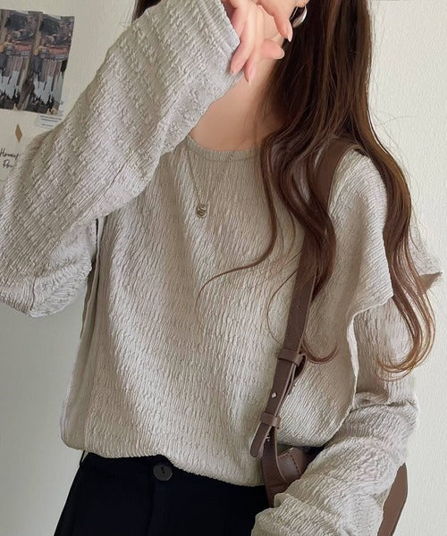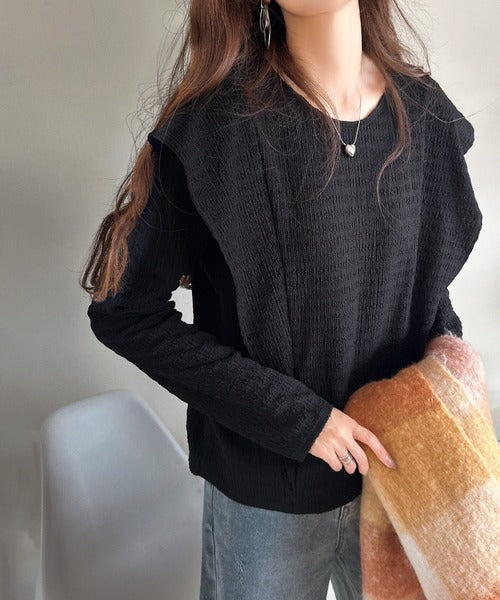 女性らしさとスタイリッシュさを演出する、ジャガード素材ラッフルフリルショルダープルオーバー ce1010347