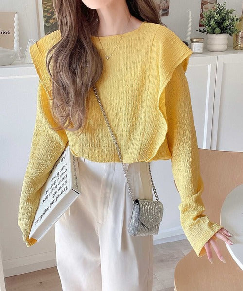 肩にラッフルフリルをあしらった、エレガントなトップス。
