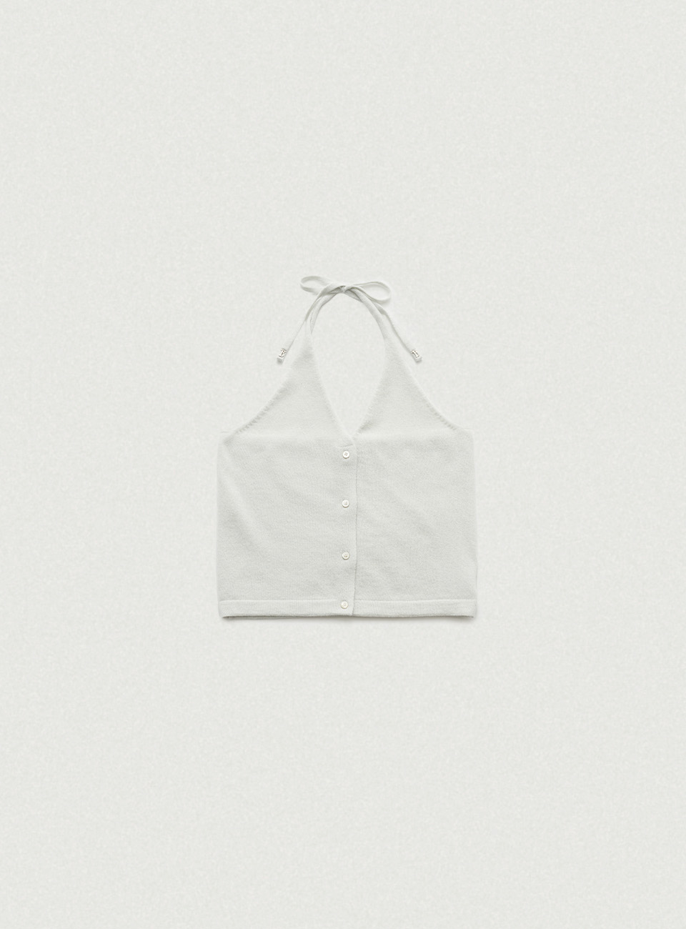 ホルターネックラインと、シングルブレストのボタン開閉仕様のカーディガンタイプ。