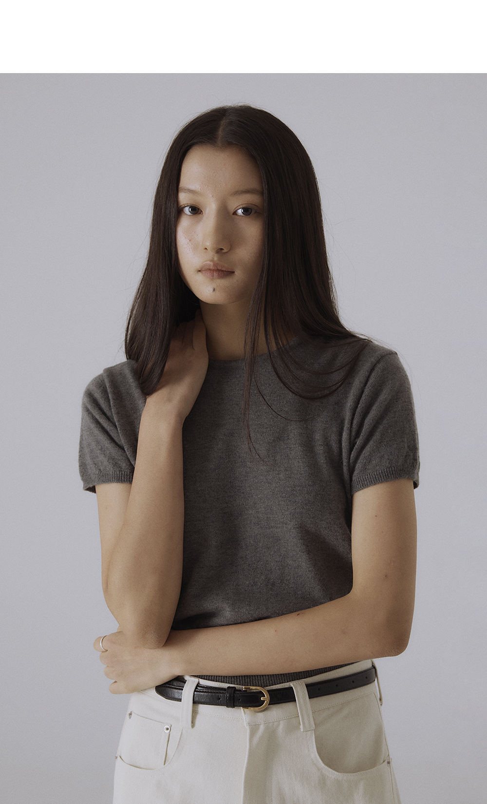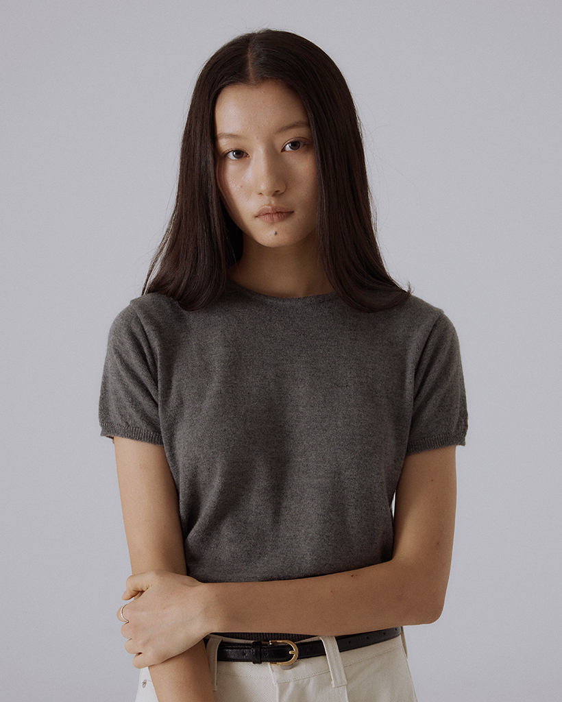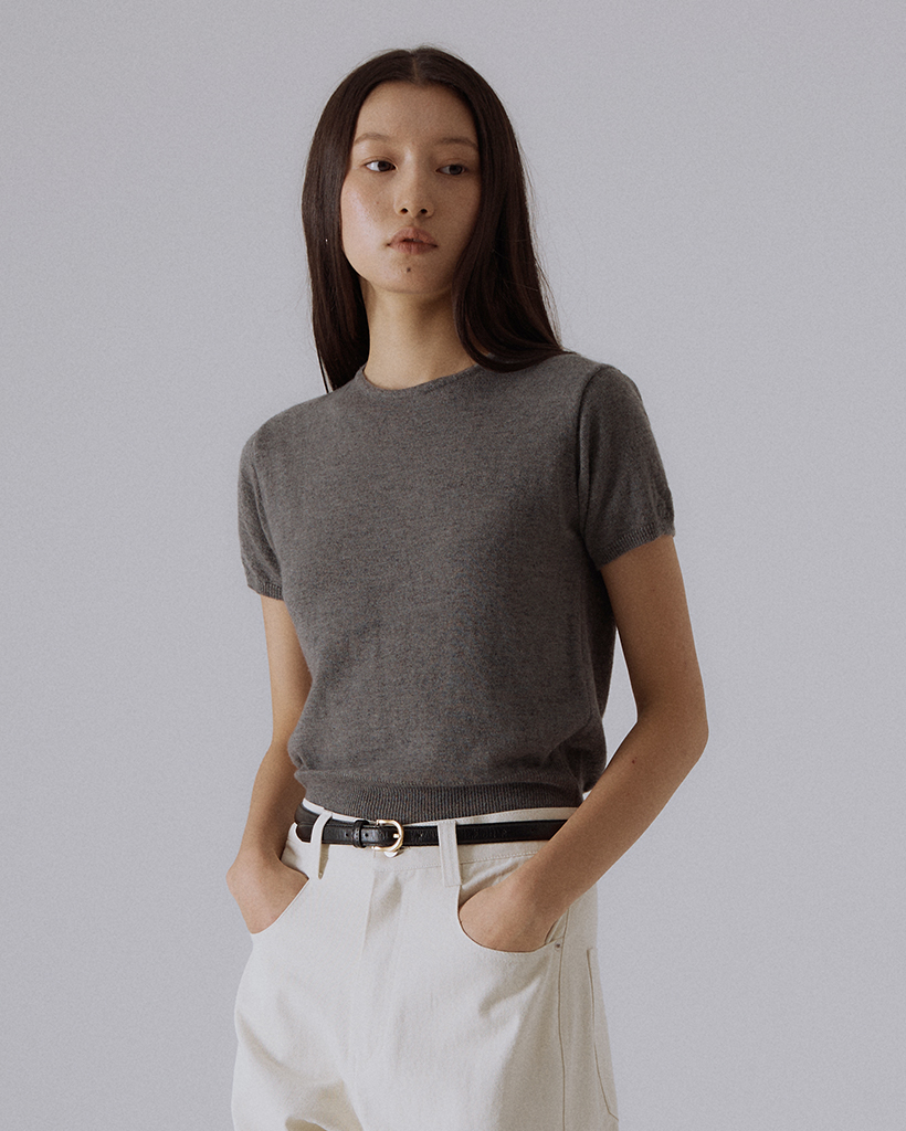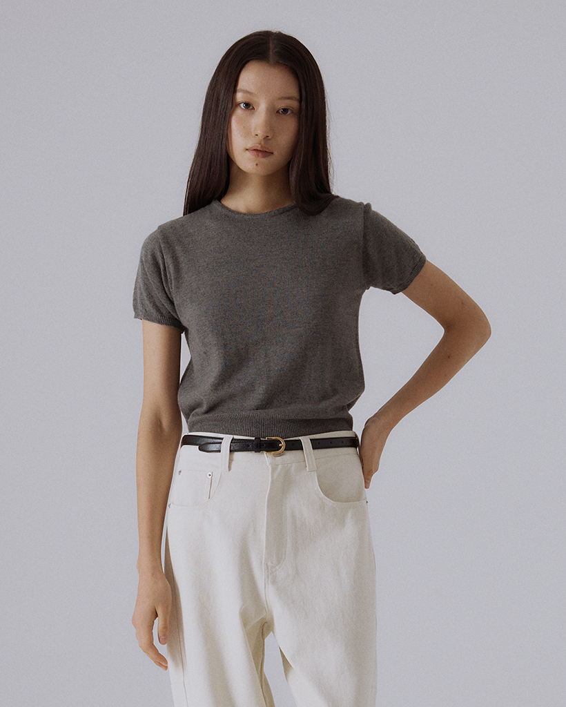 無駄のないラウンドネックラインと、すっきりと落ちるシルエットが特徴のニット半袖トップスです。