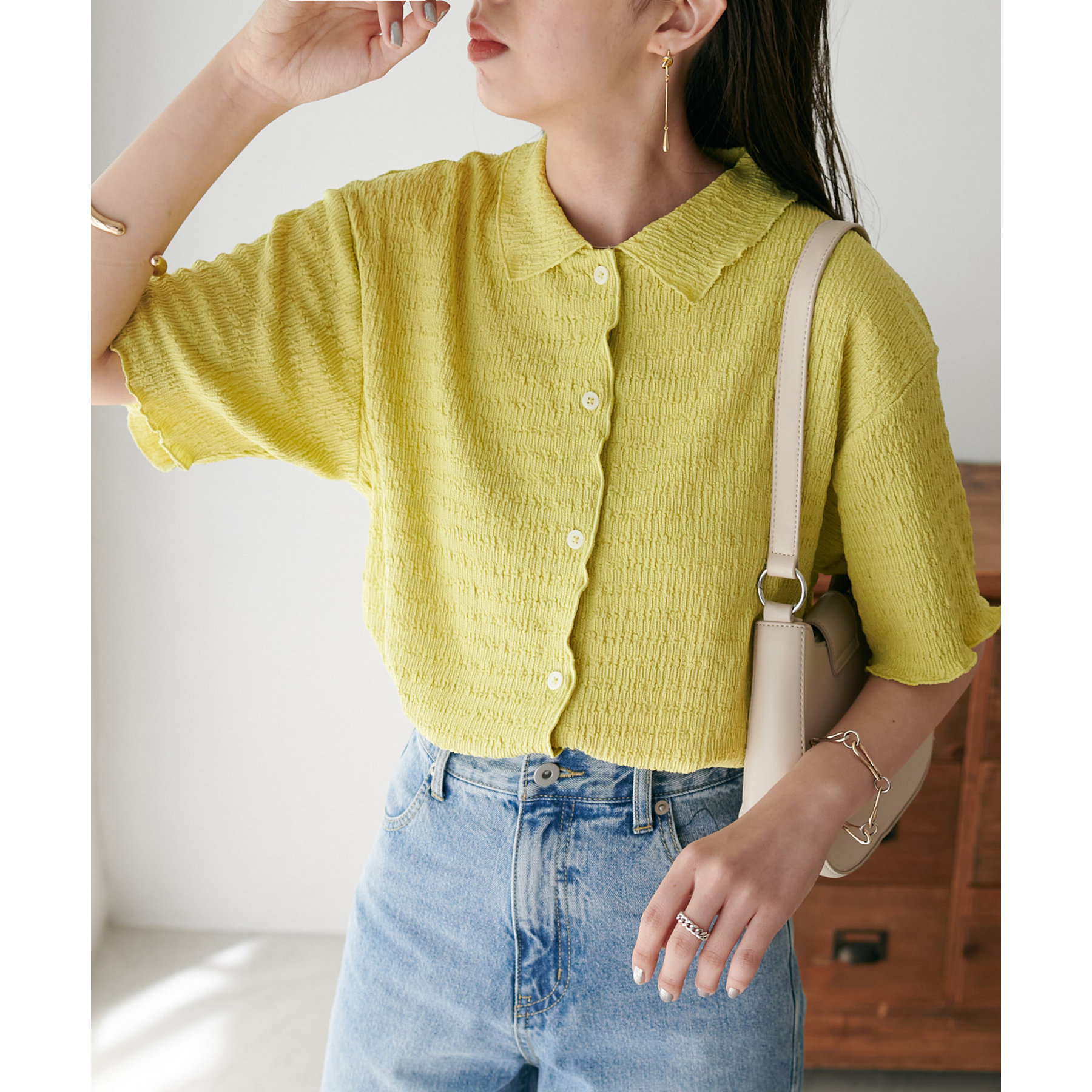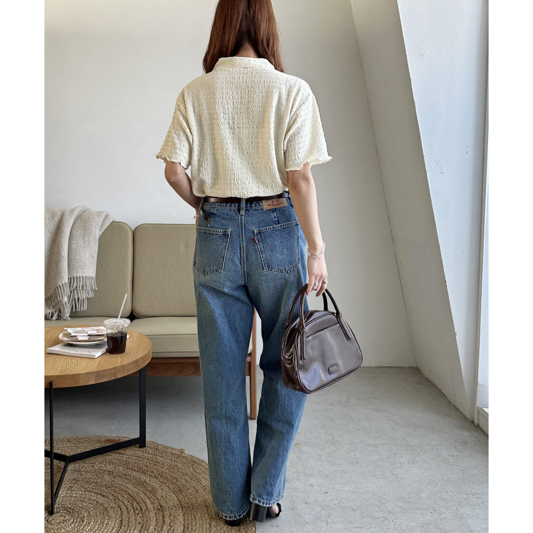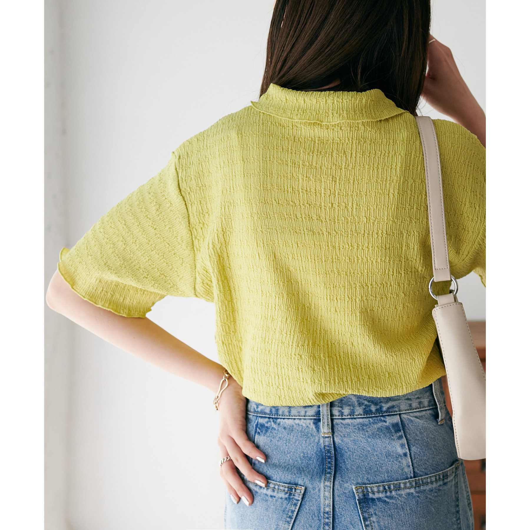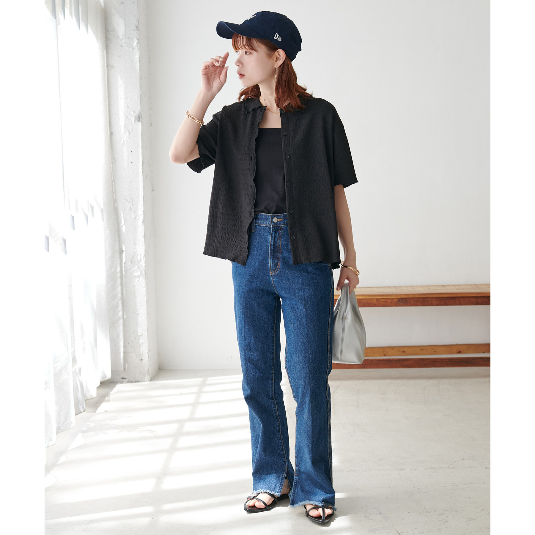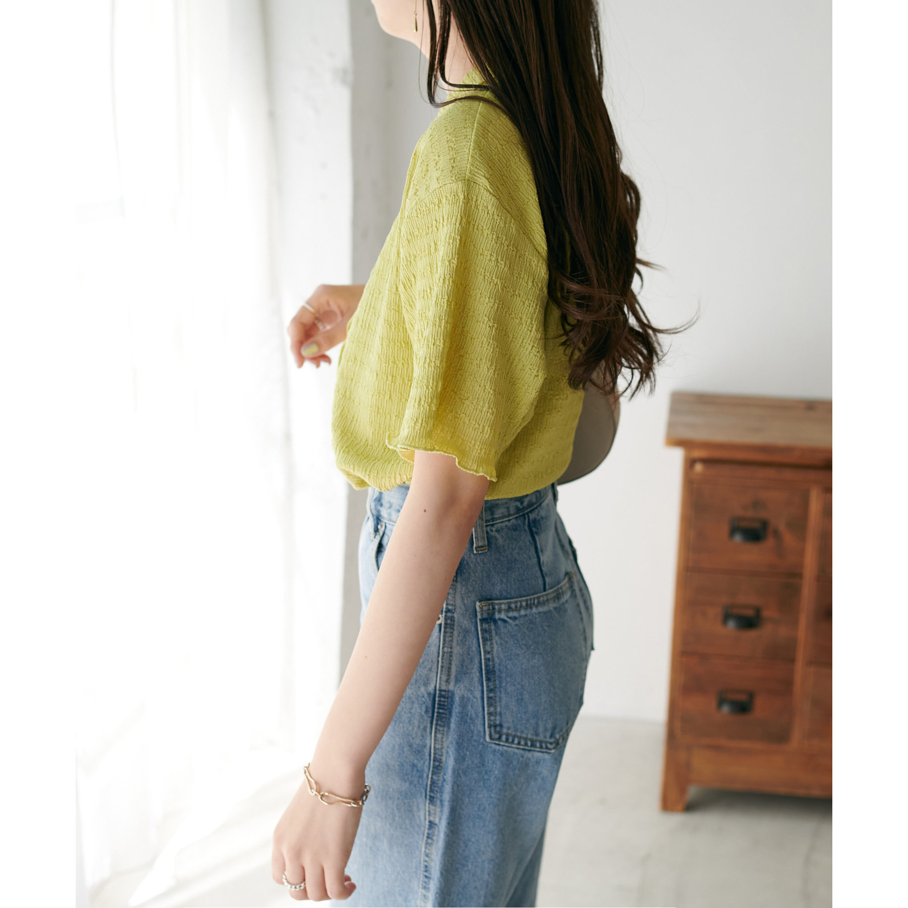 160cmスタッフ(Fサイズ着用):ジャーガード素材は見た目より軽く、真夏でもさらっと着られそうです♡コンパクトめの丈感なので、ハイウエストボトムとの相性も抜群でした♪