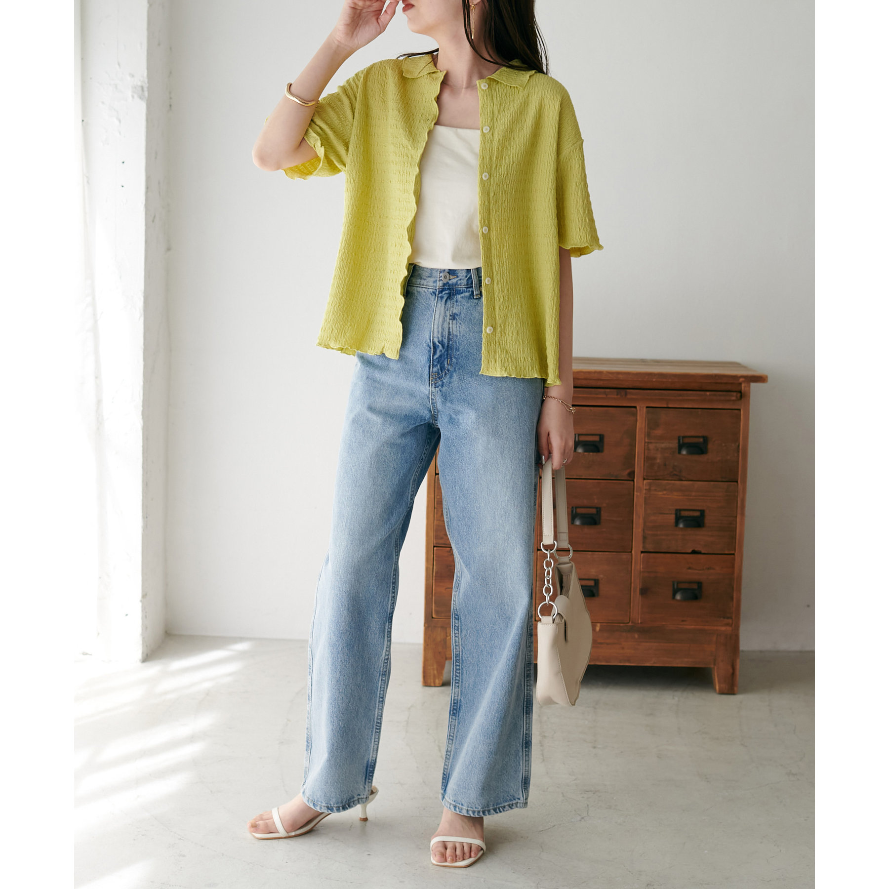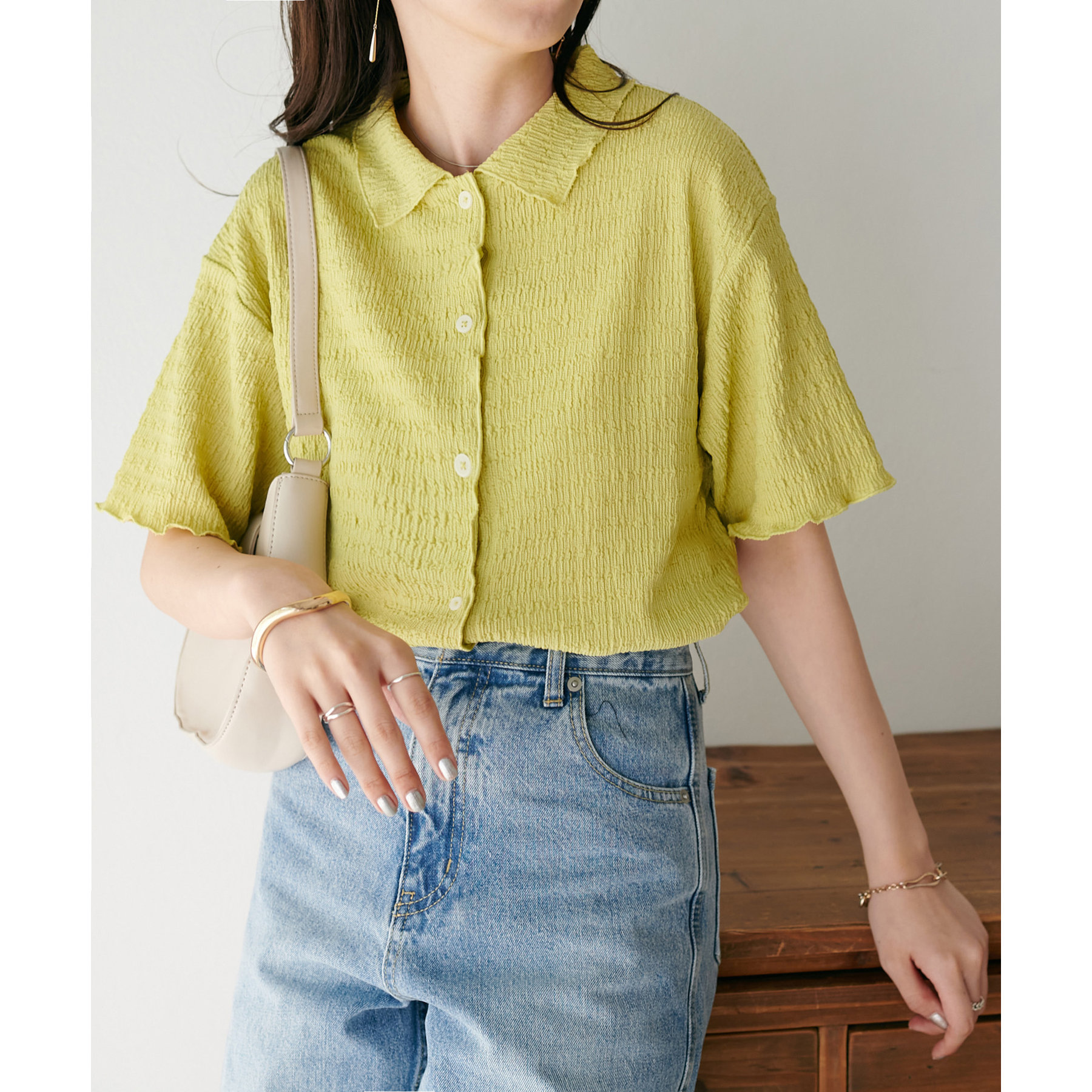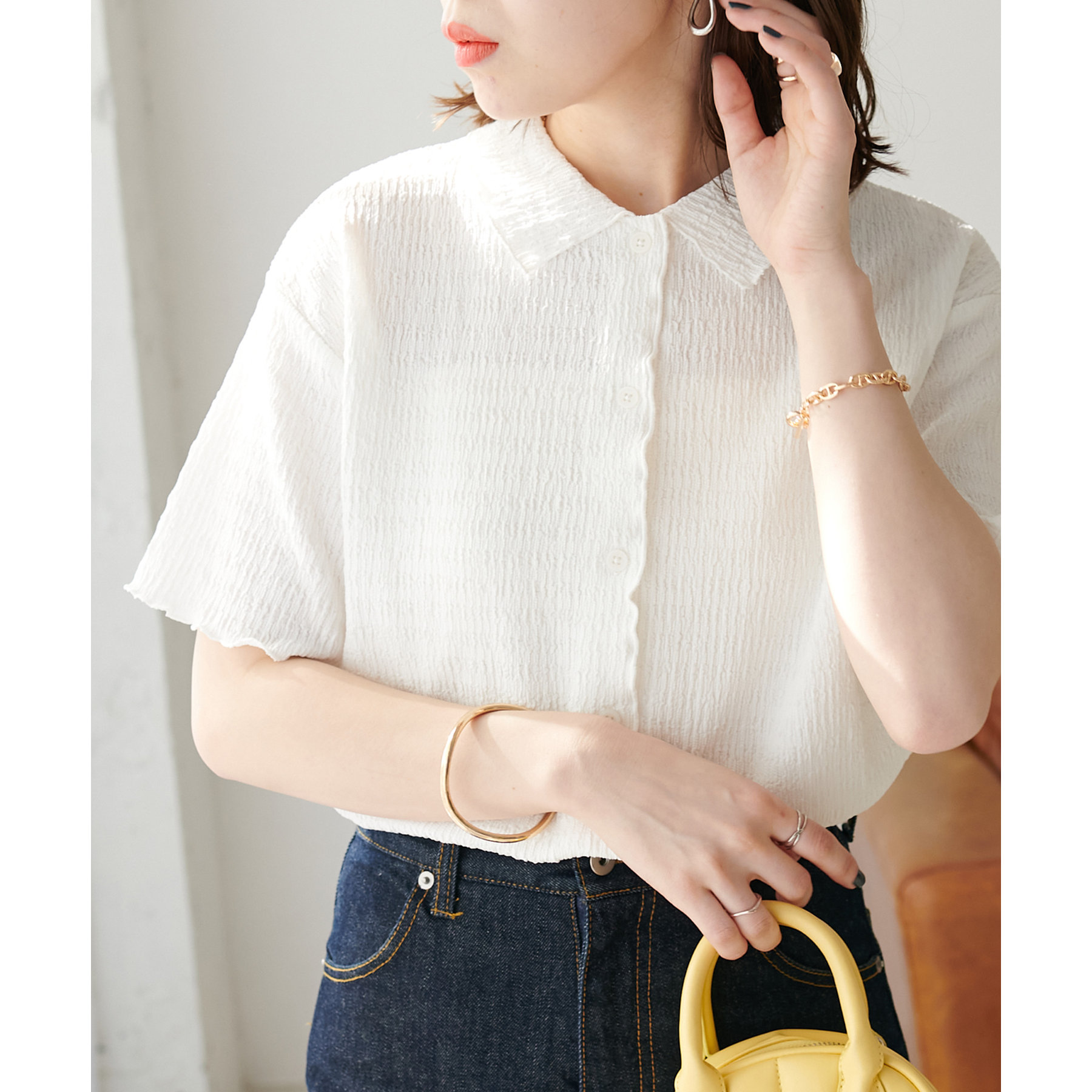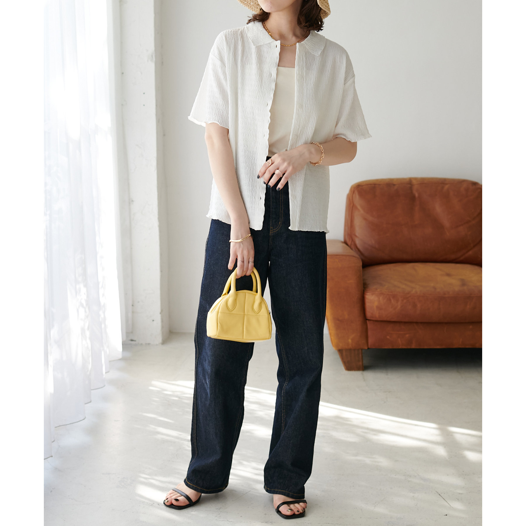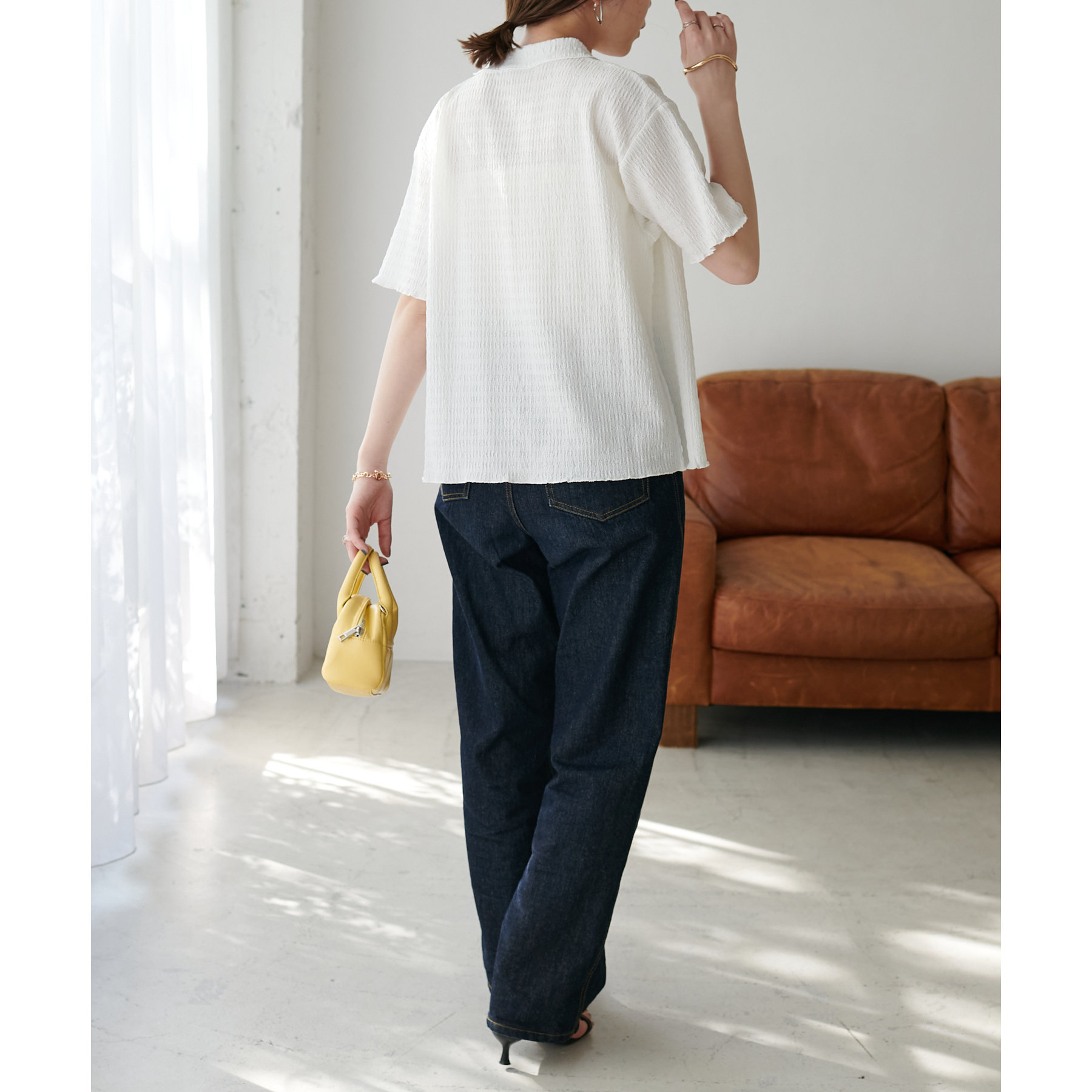 160cmスタッフ(Fサイズ着用):ジャーガード素材は見た目より軽く、真夏でもさらっと着られそうです♡コンパクトめの丈感なので、ハイウエストボトムとの相性も抜群でした♪