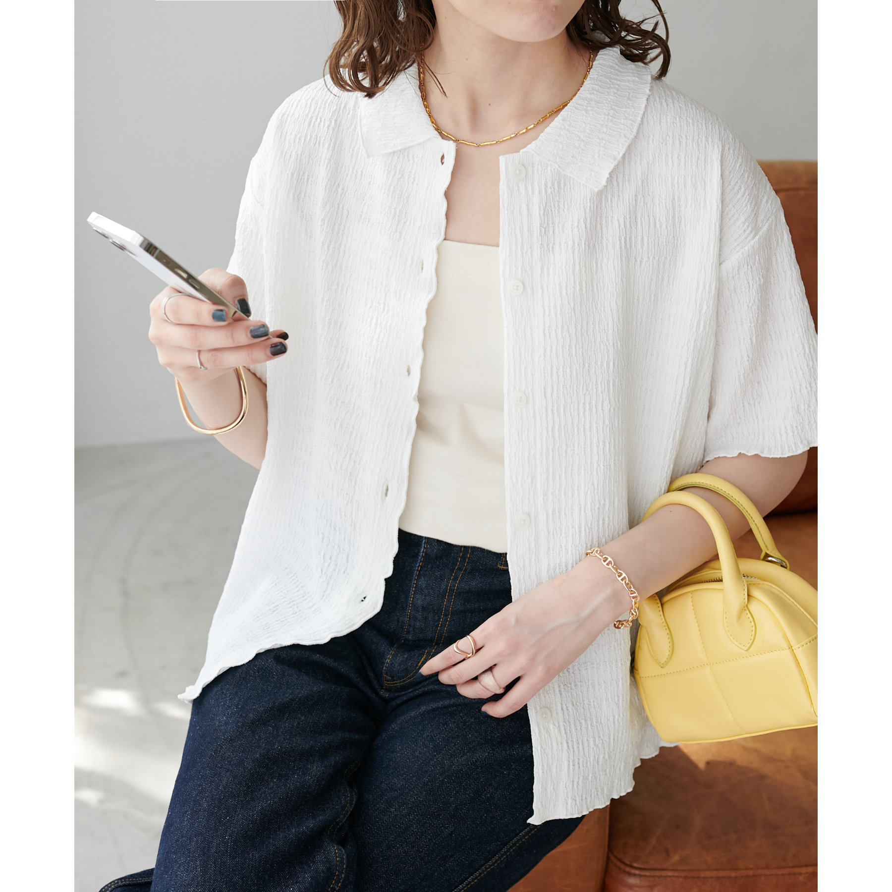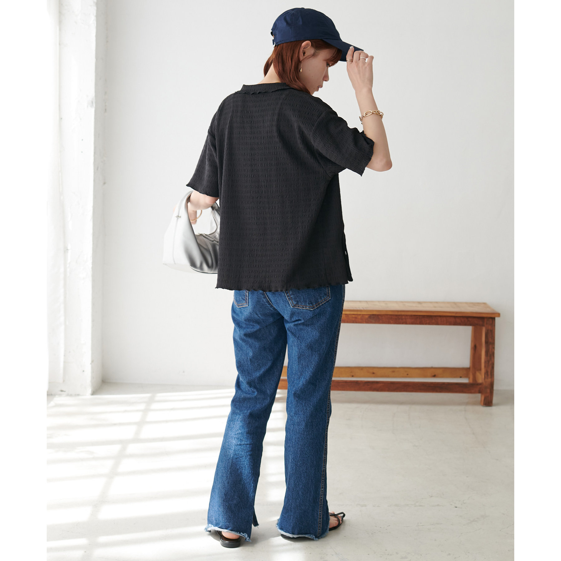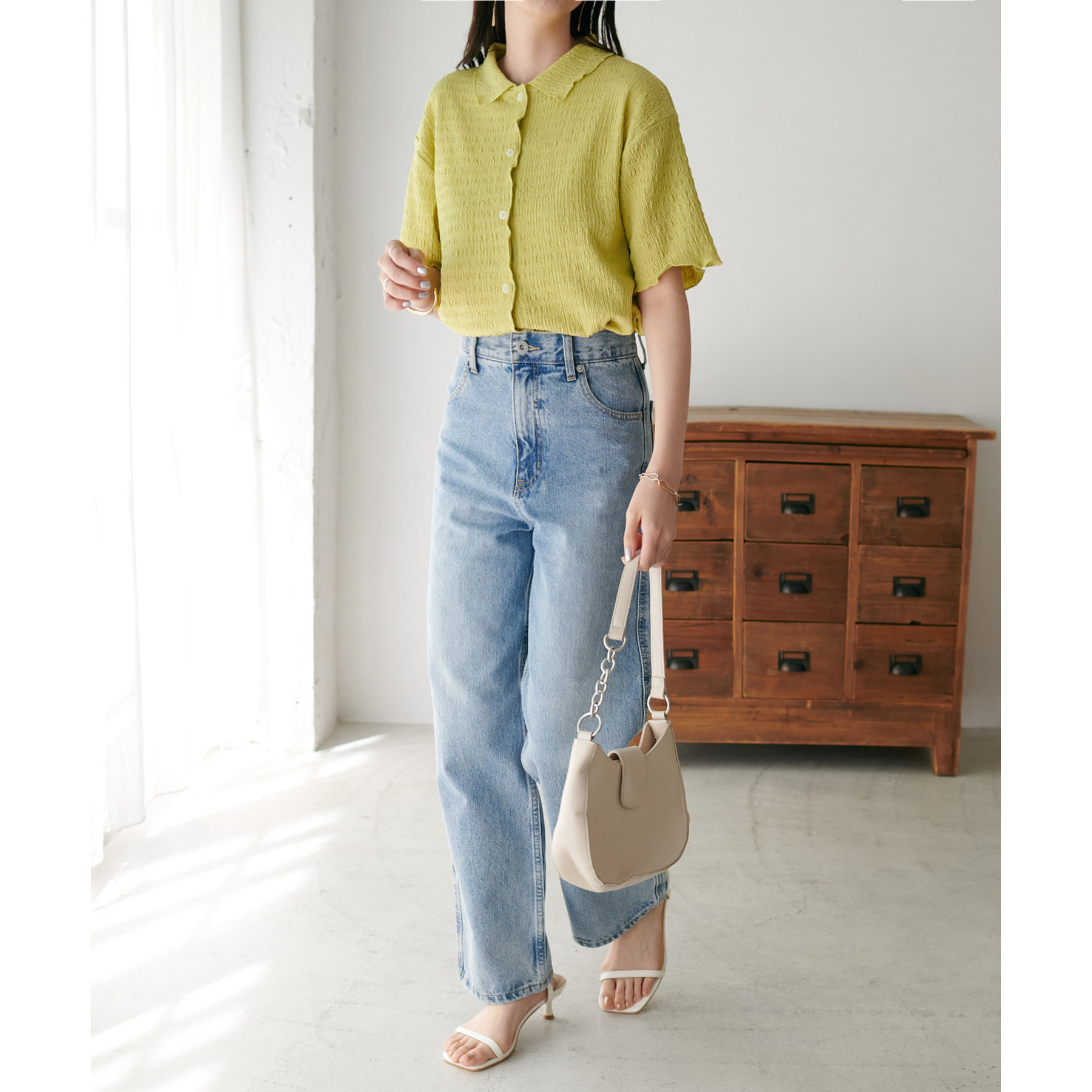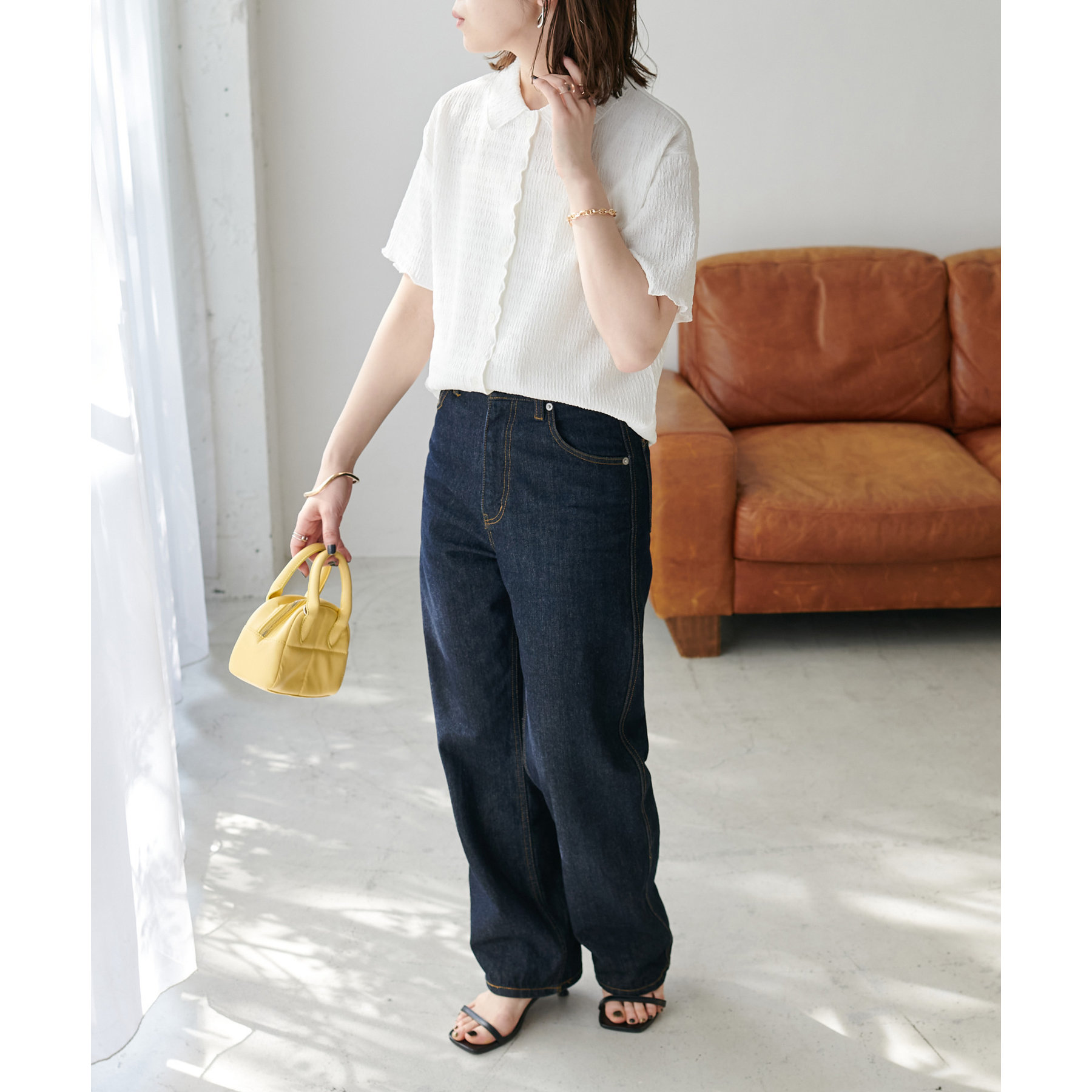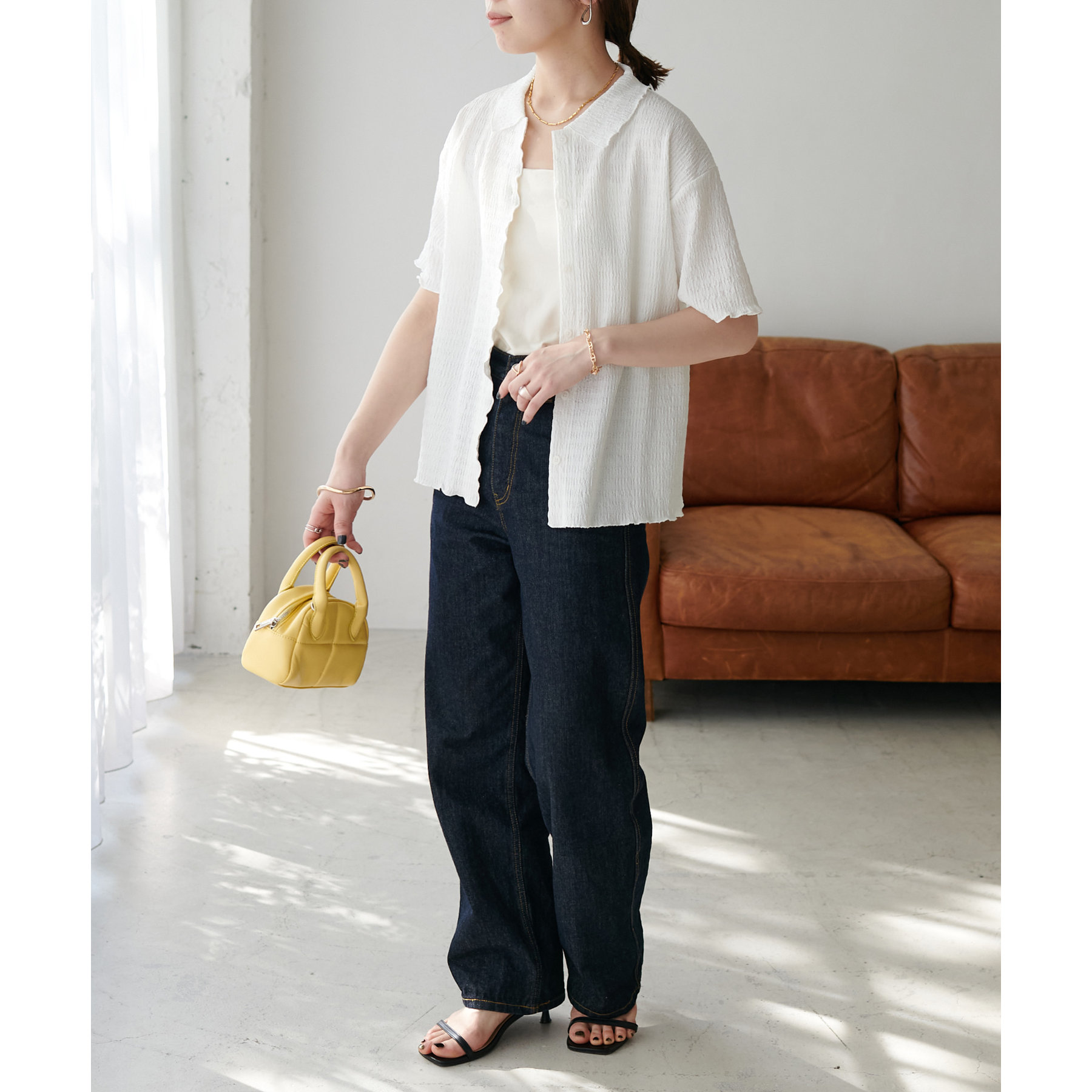 160cmスタッフ(Fサイズ着用):ジャーガード素材は見た目より軽く、真夏でもさらっと着られそうです♡コンパクトめの丈感なので、ハイウエストボトムとの相性も抜群でした♪