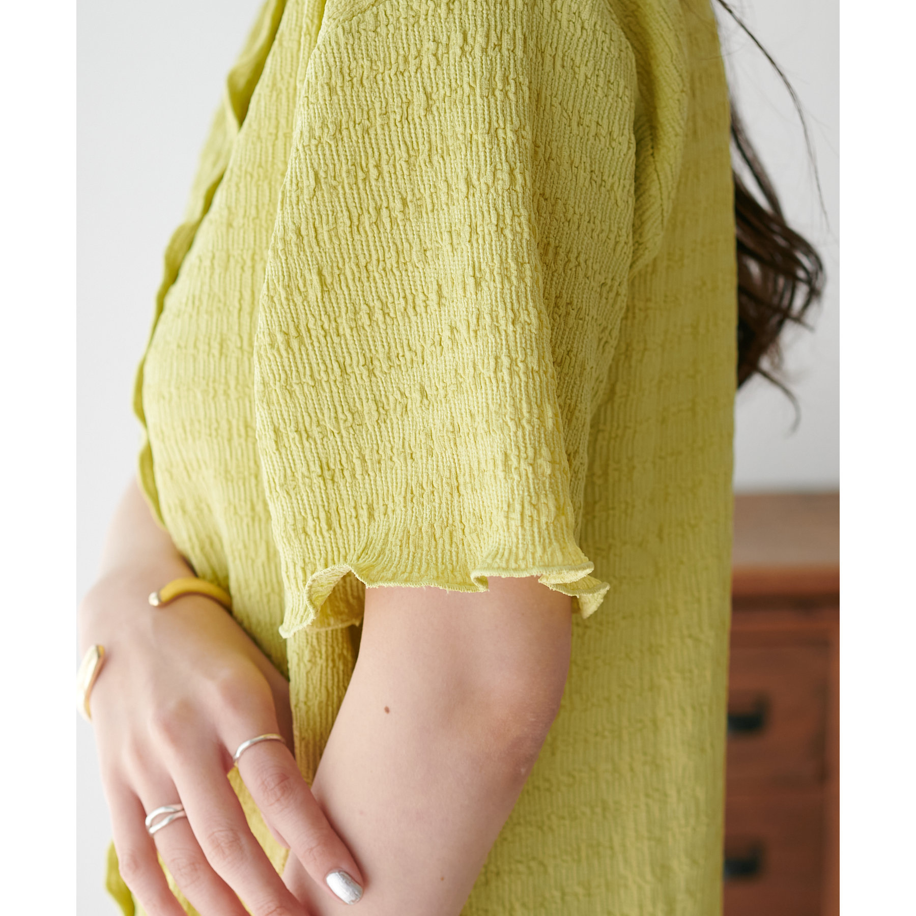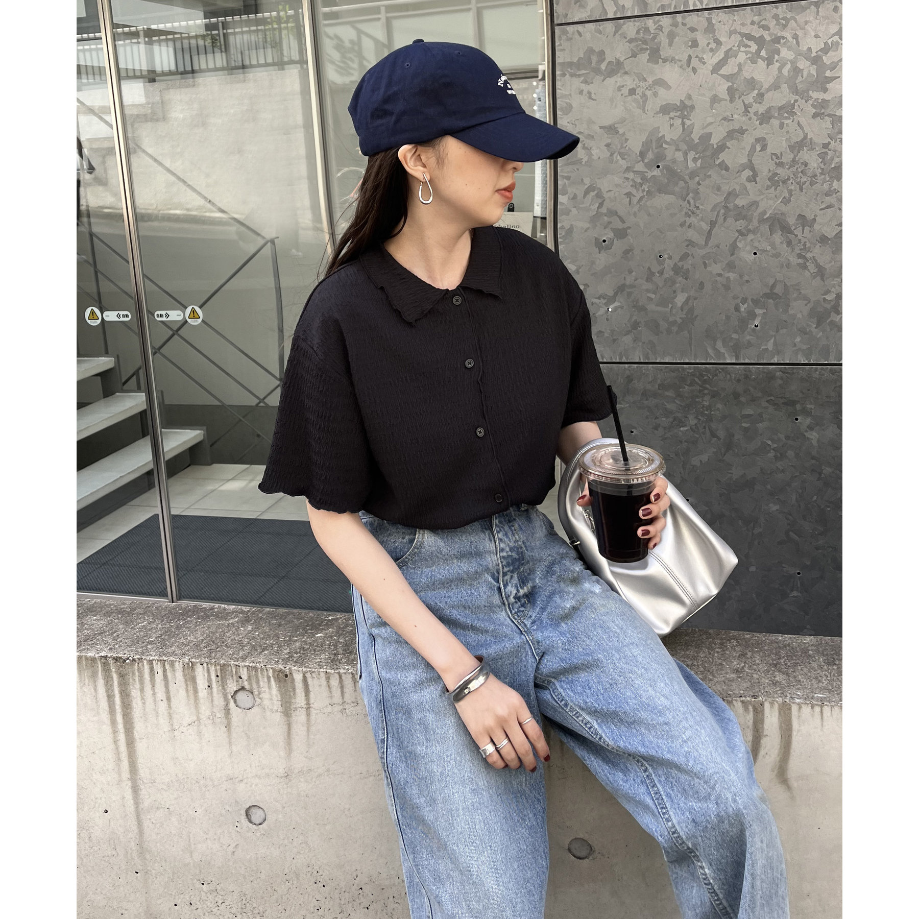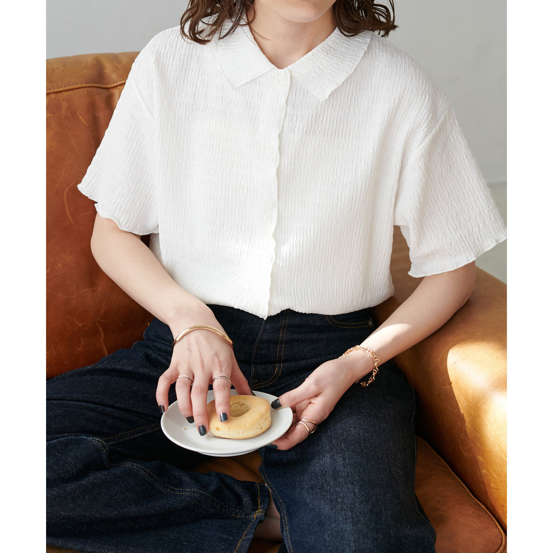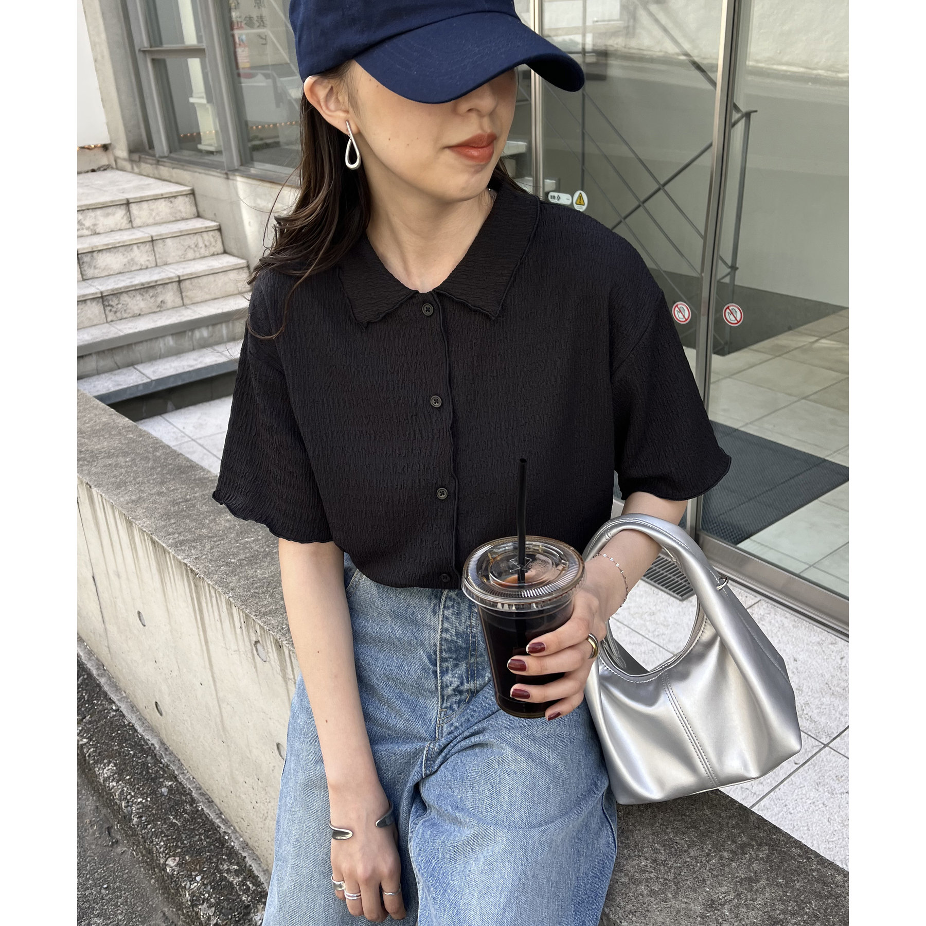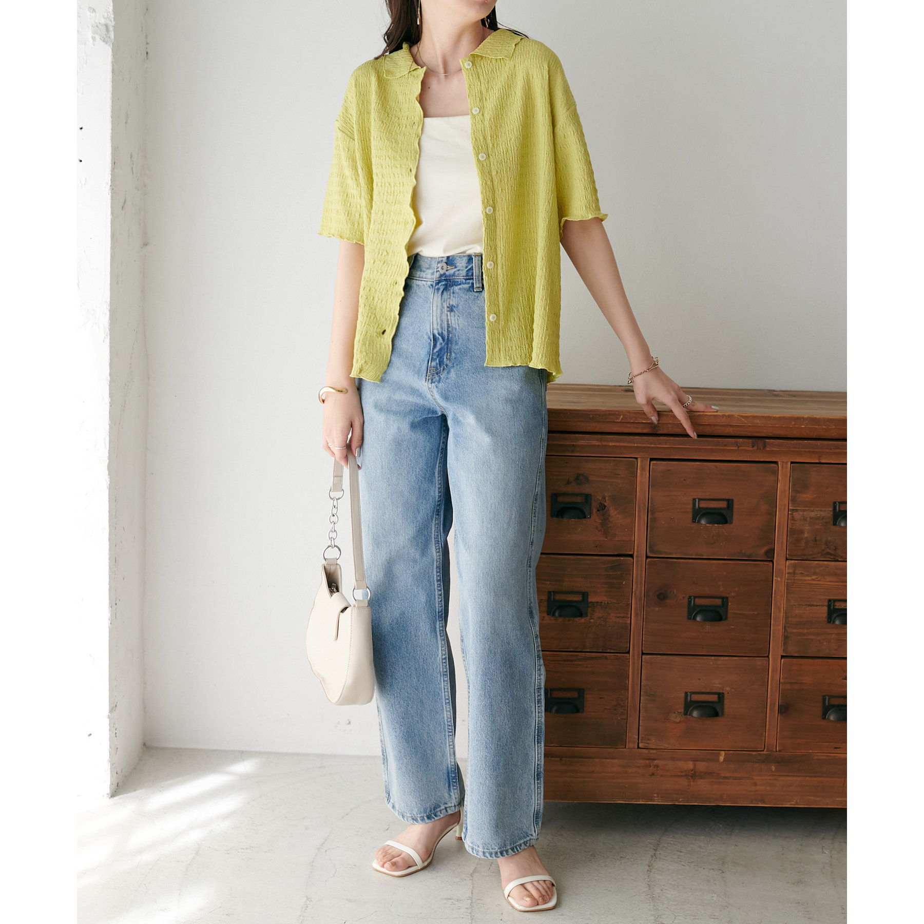 160cmスタッフ(Fサイズ着用):ジャーガード素材は見た目より軽く、真夏でもさらっと着られそうです♡コンパクトめの丈感なので、ハイウエストボトムとの相性も抜群でした♪