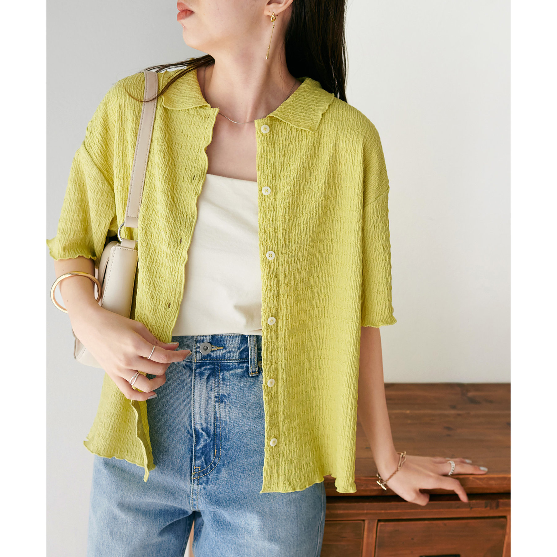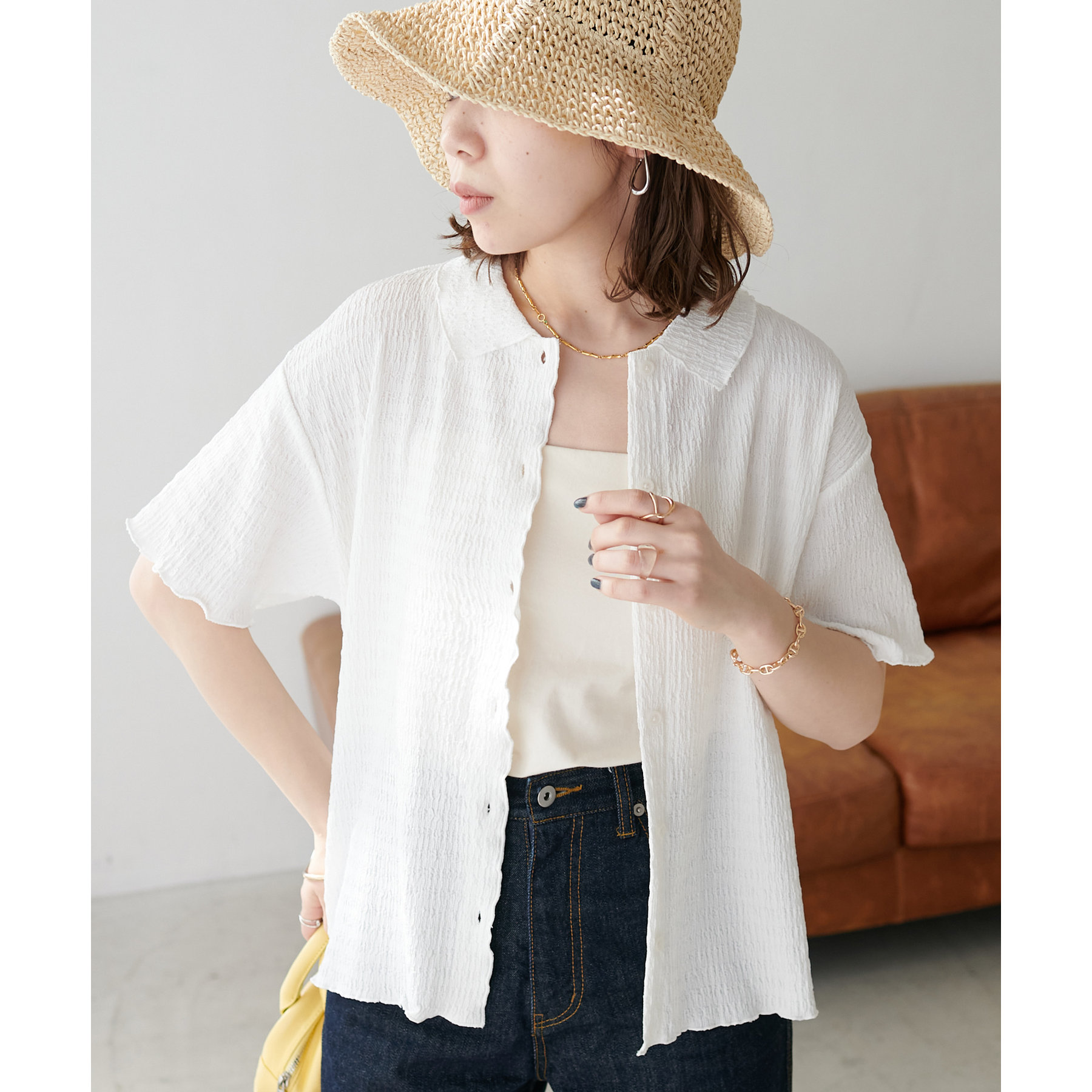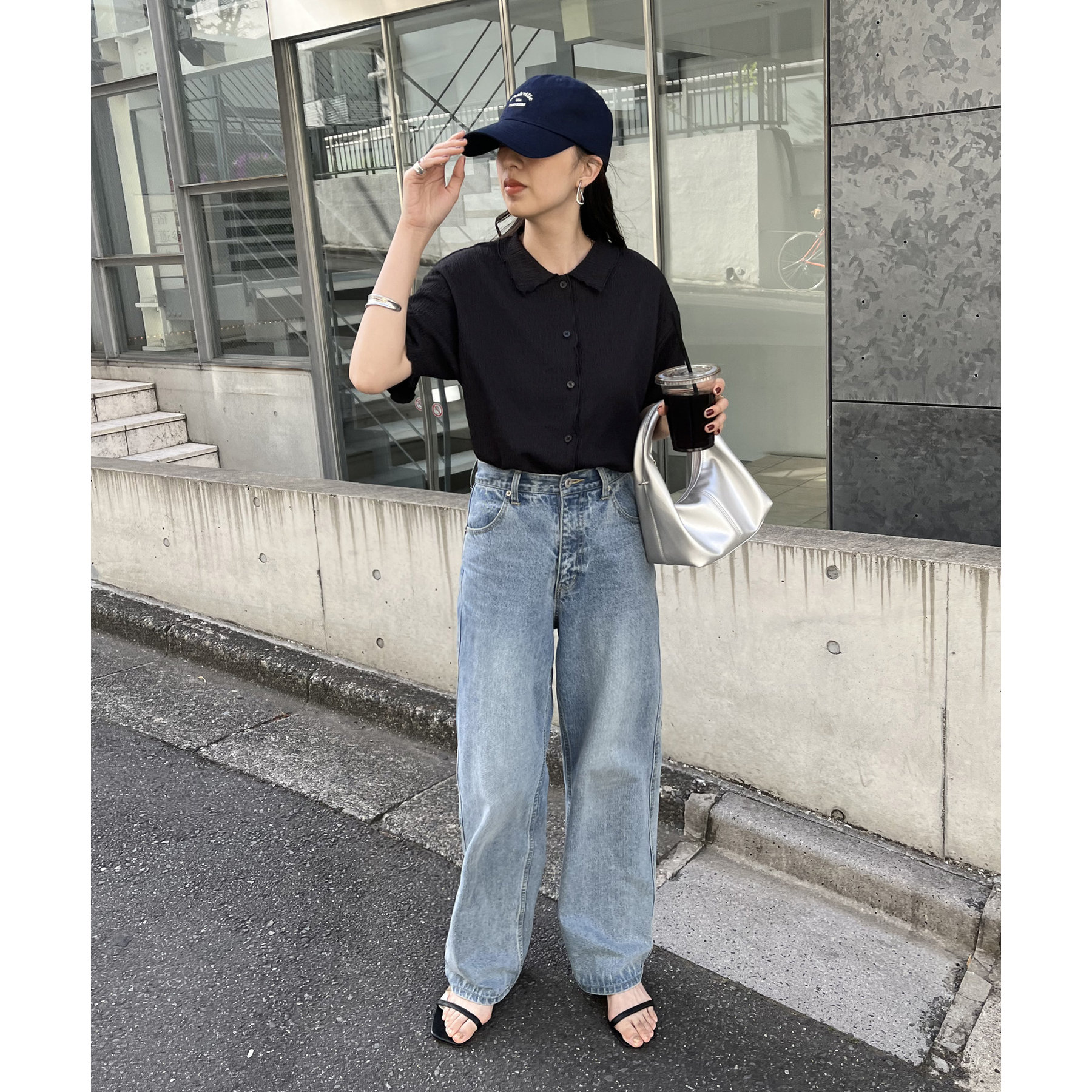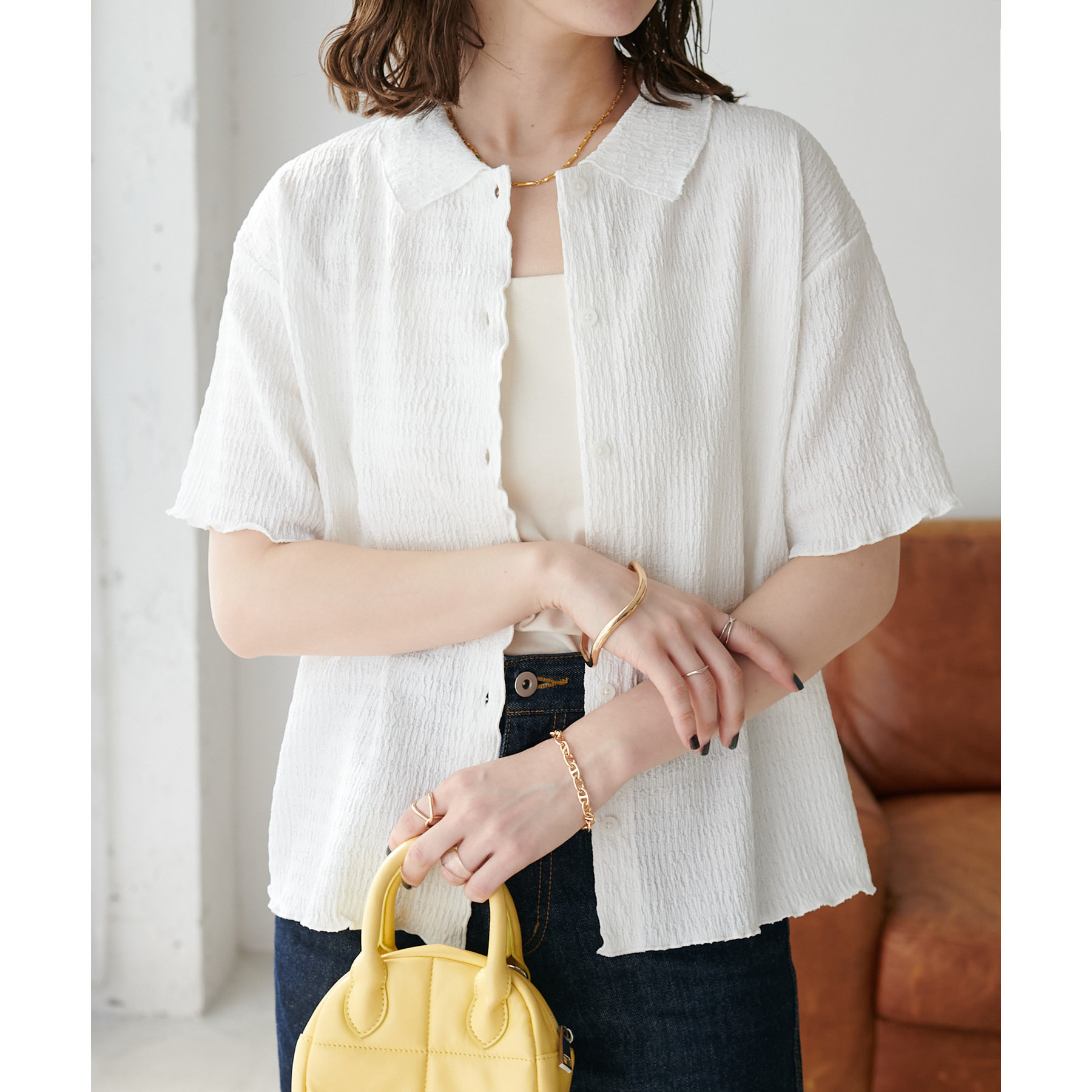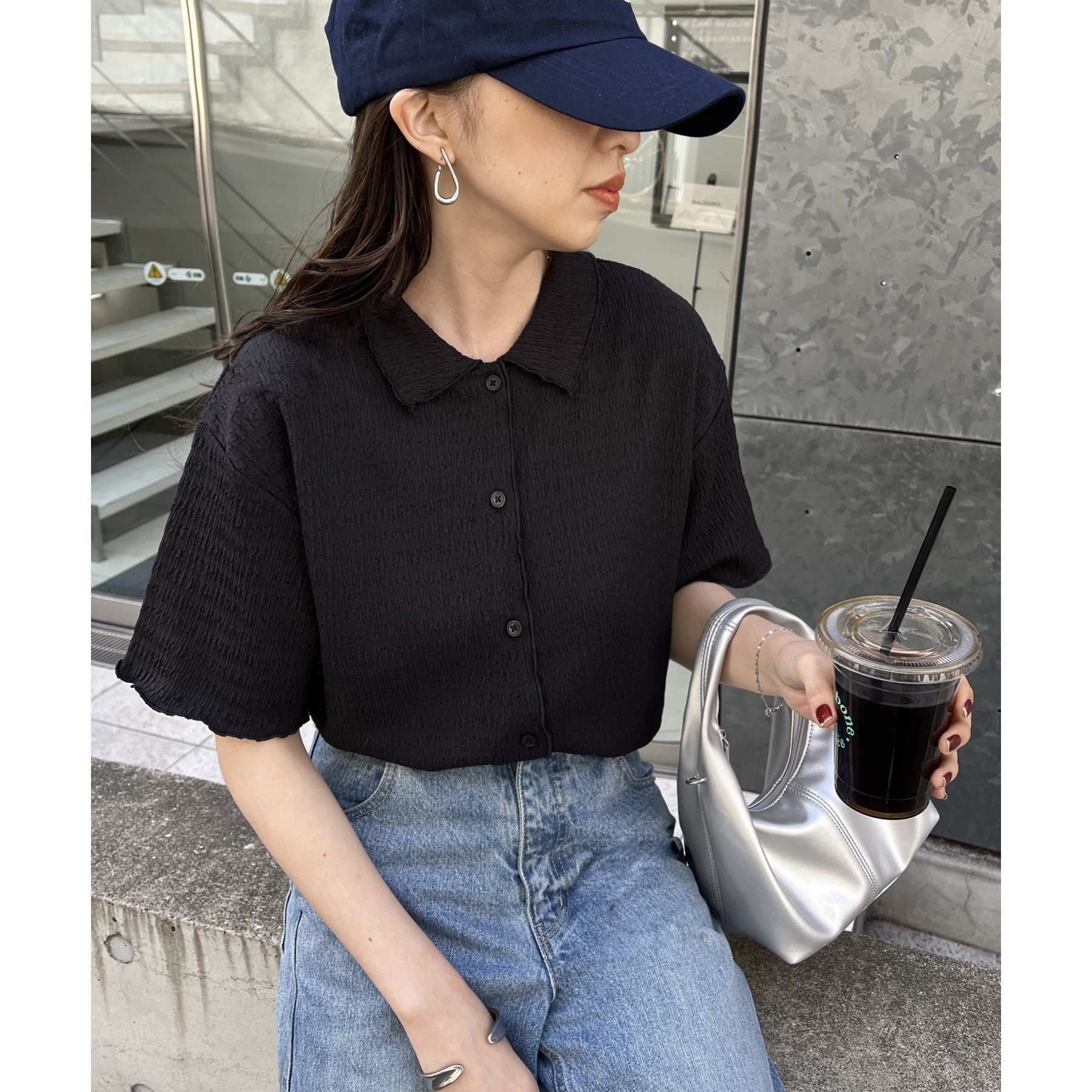 160cmスタッフ(Fサイズ着用):ジャーガード素材は見た目より軽く、真夏でもさらっと着られそうです♡コンパクトめの丈感なので、ハイウエストボトムとの相性も抜群でした♪