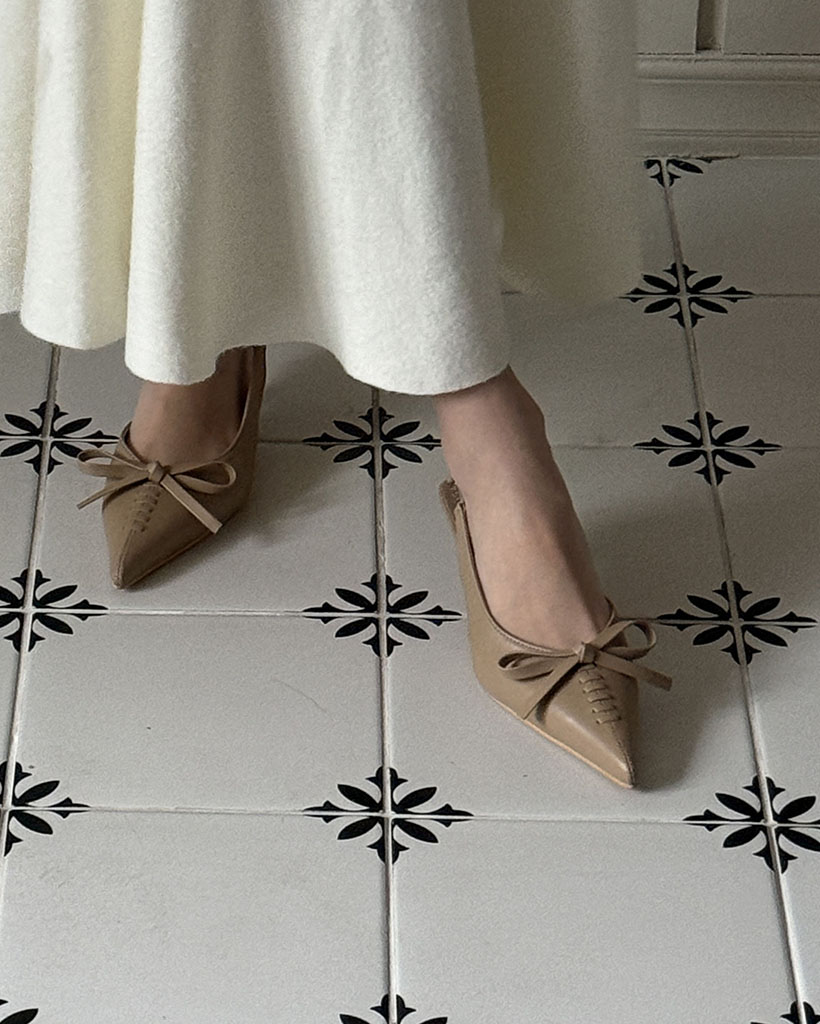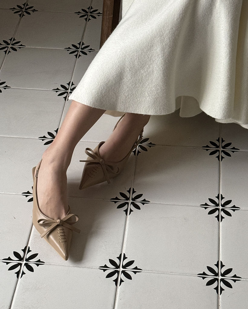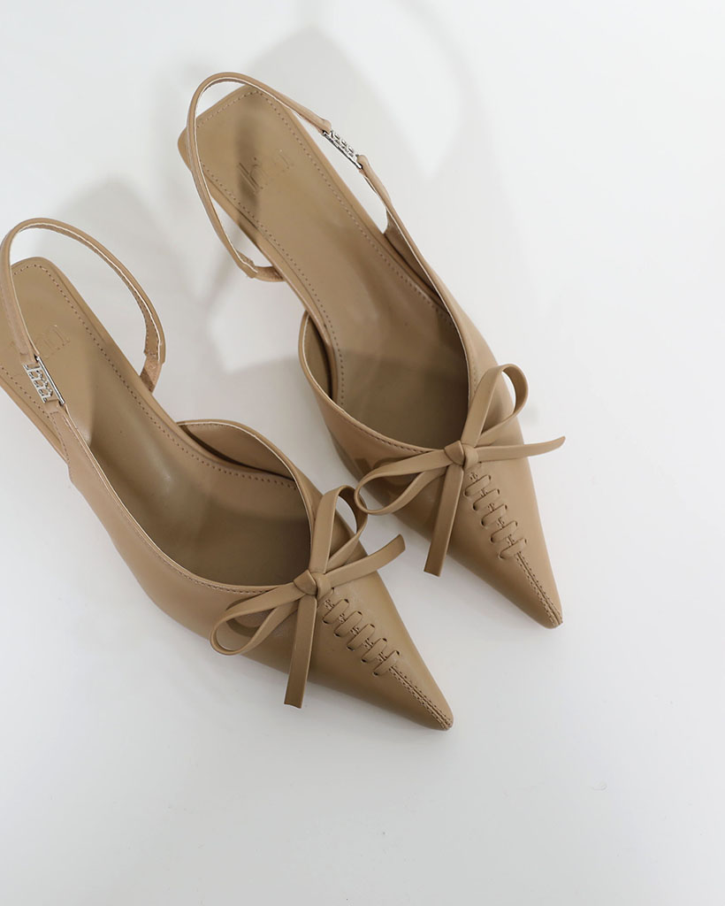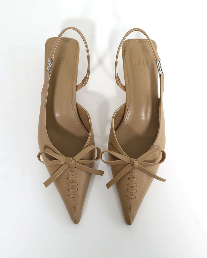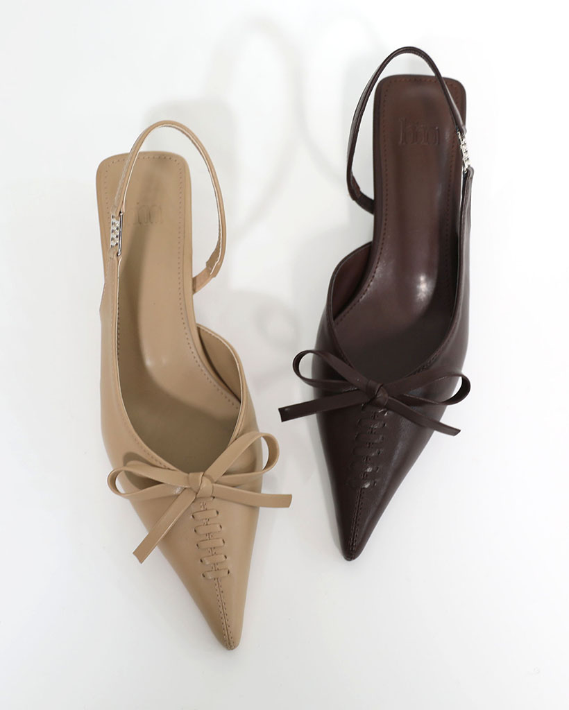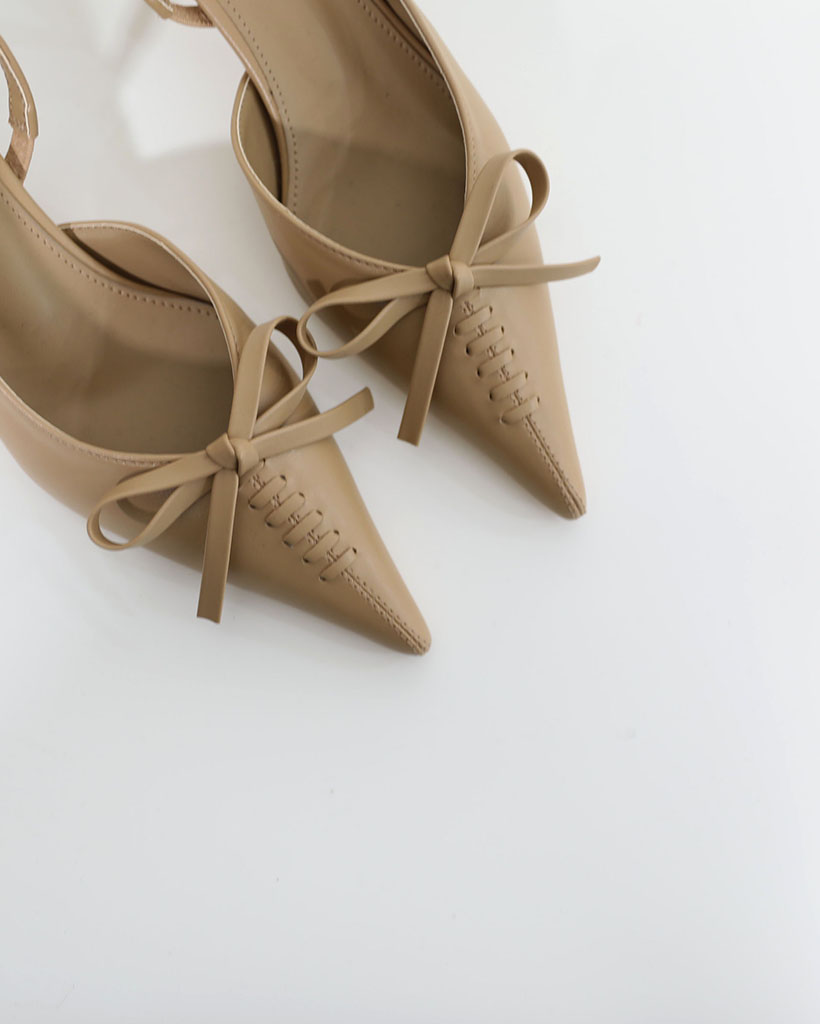 シャープなポインテッドトゥに、コルセット風のリボンディテールをあしらったスリングバックシューズ。