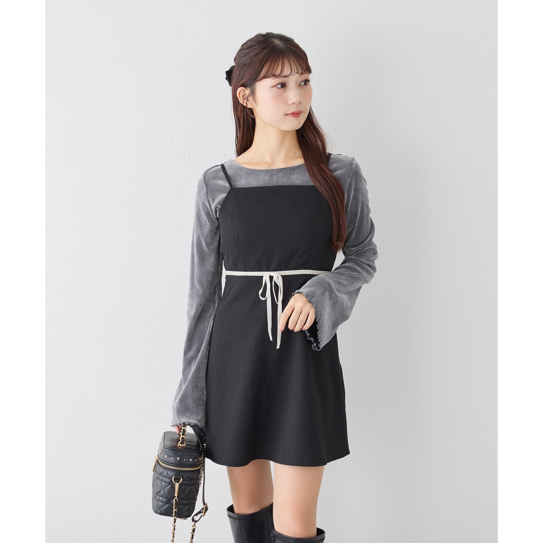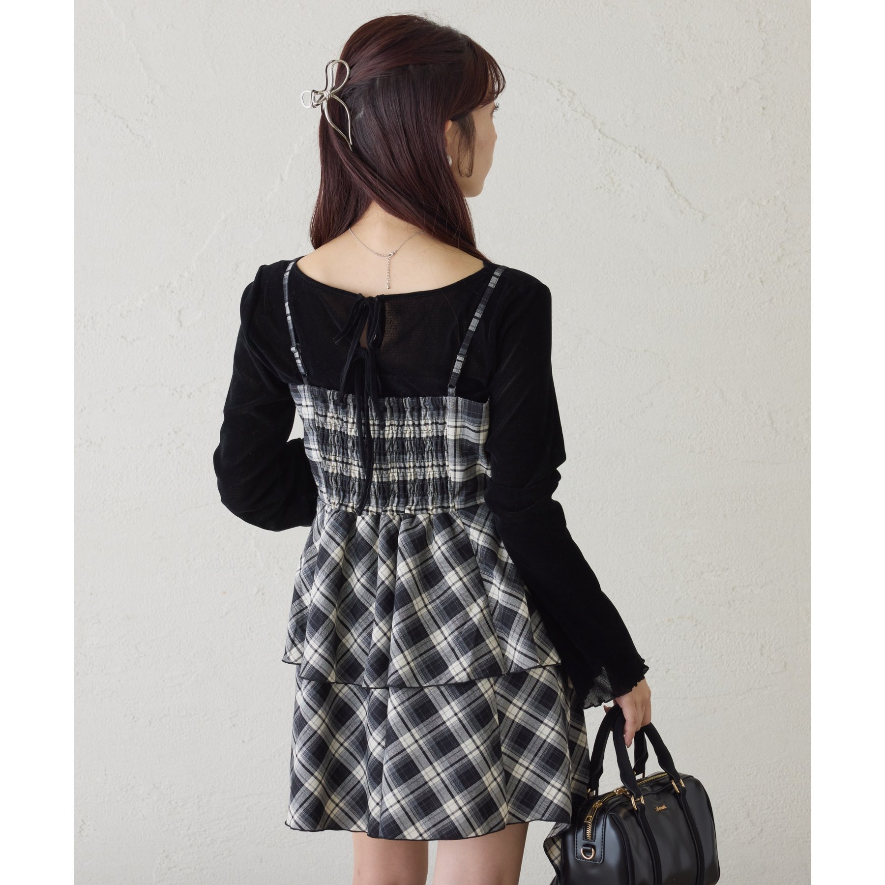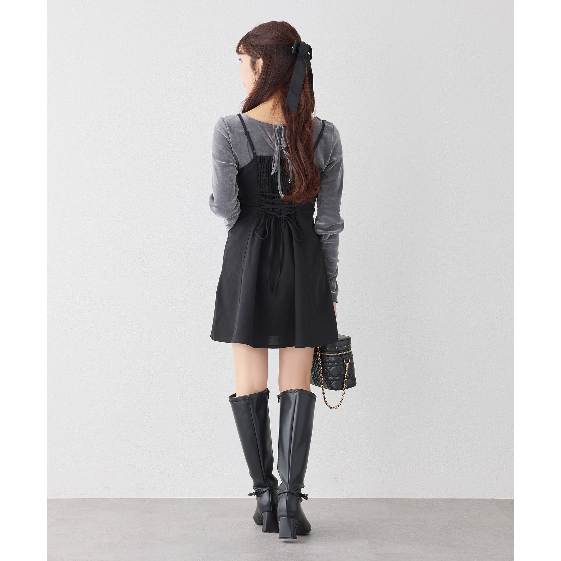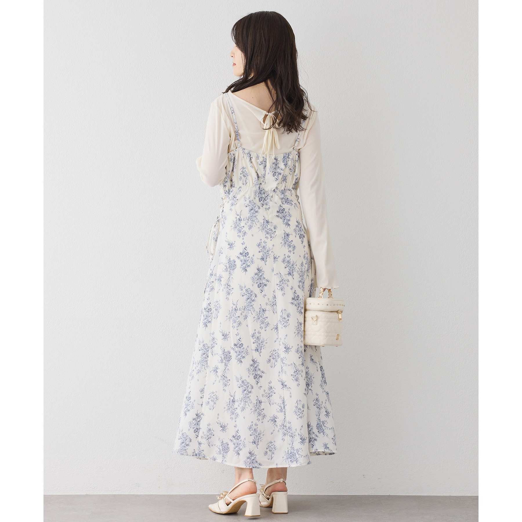 キャミワンピースのインナーとして着れば、リボンがチラッと見えて後ろ姿も華やかに仕上がります。