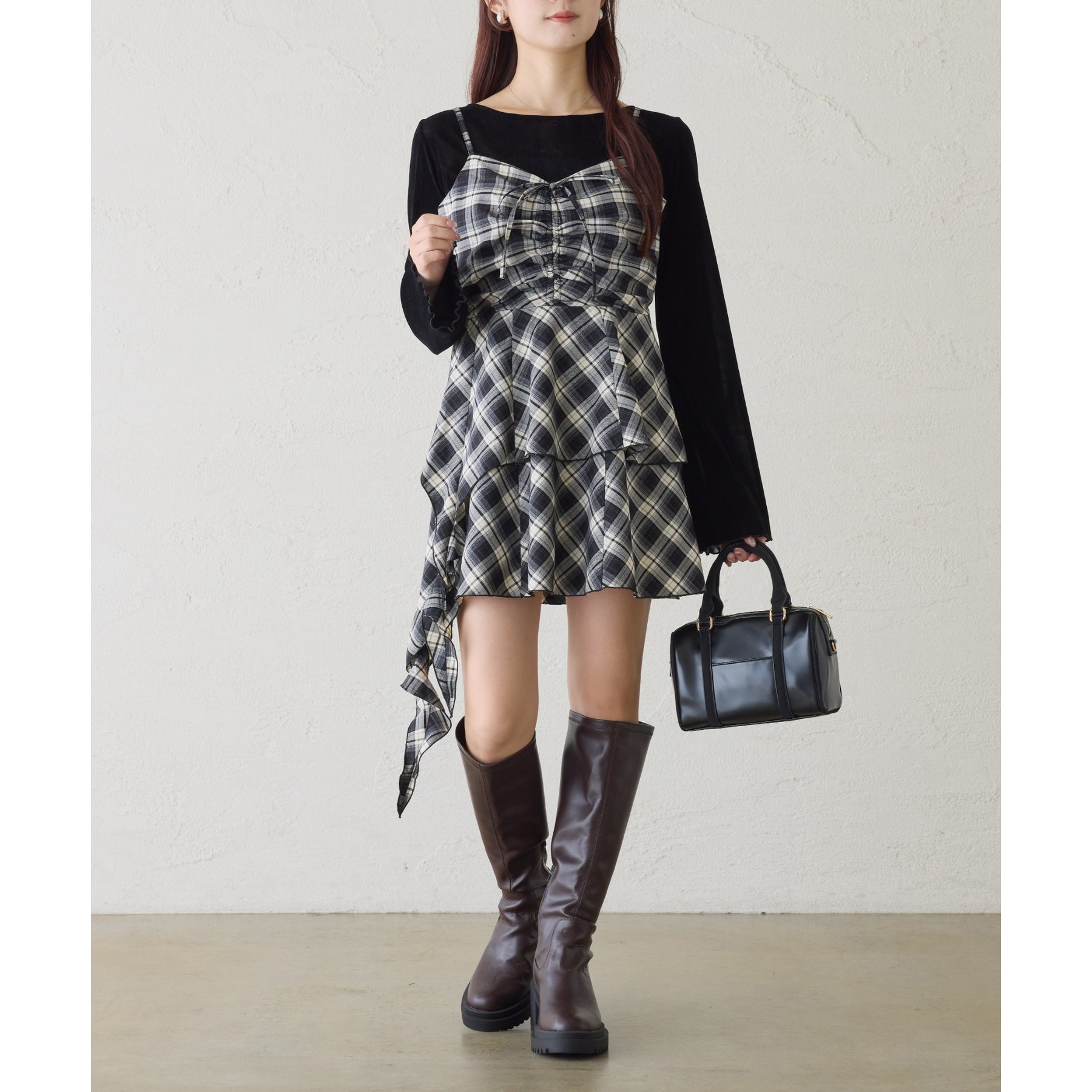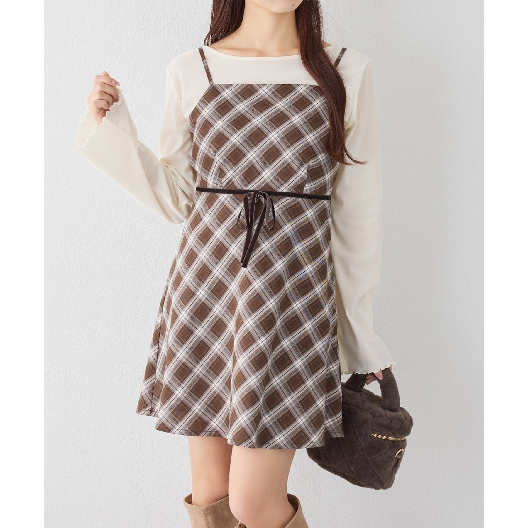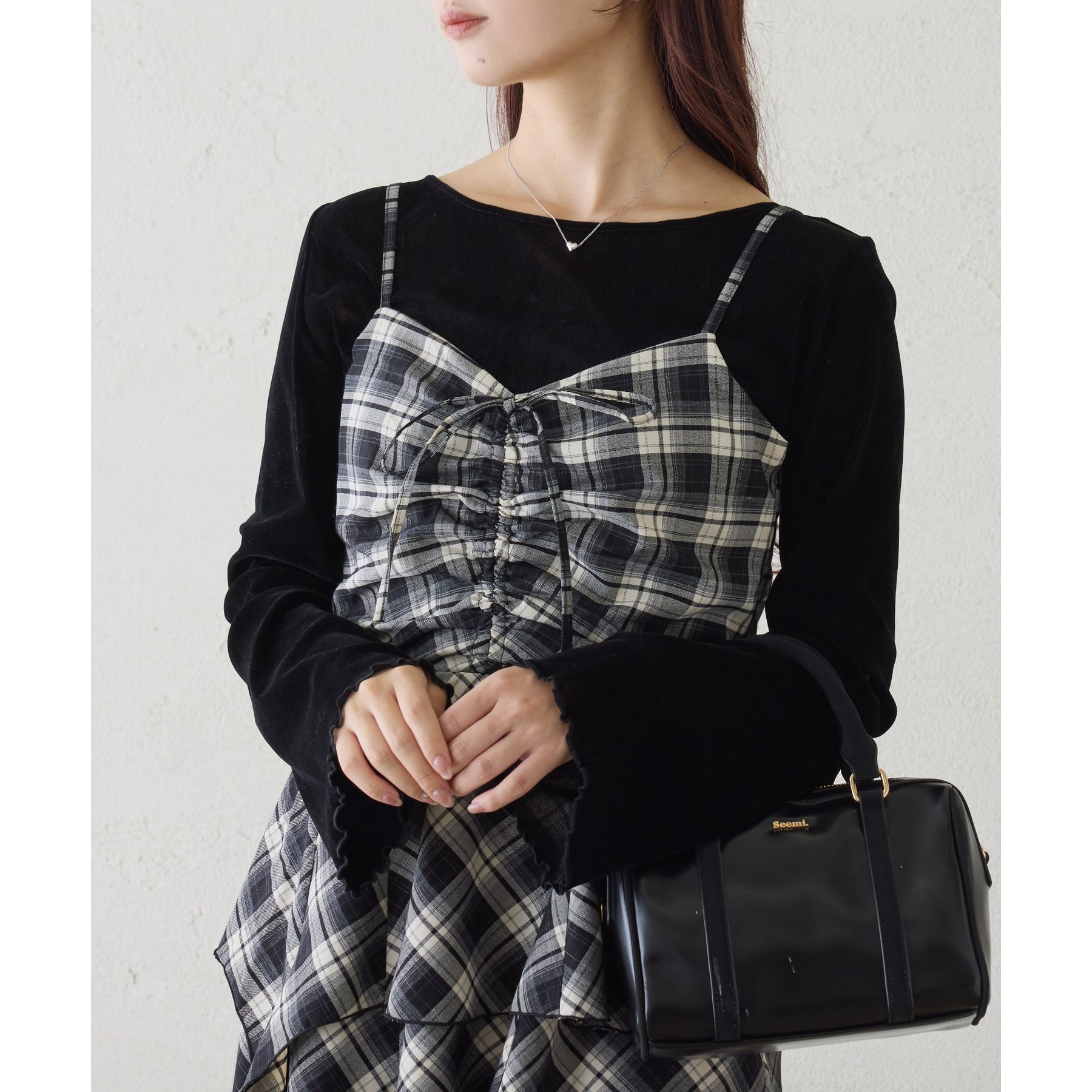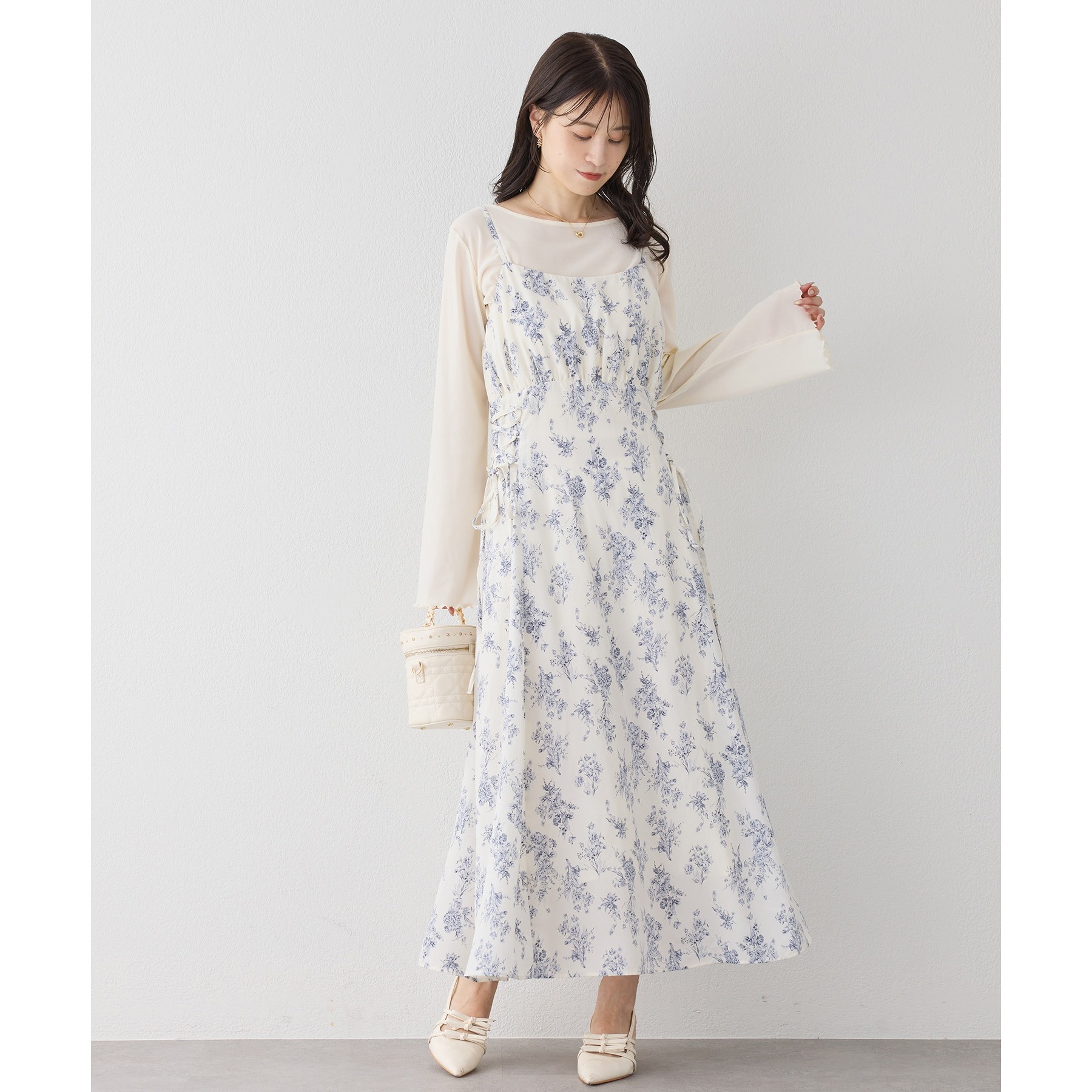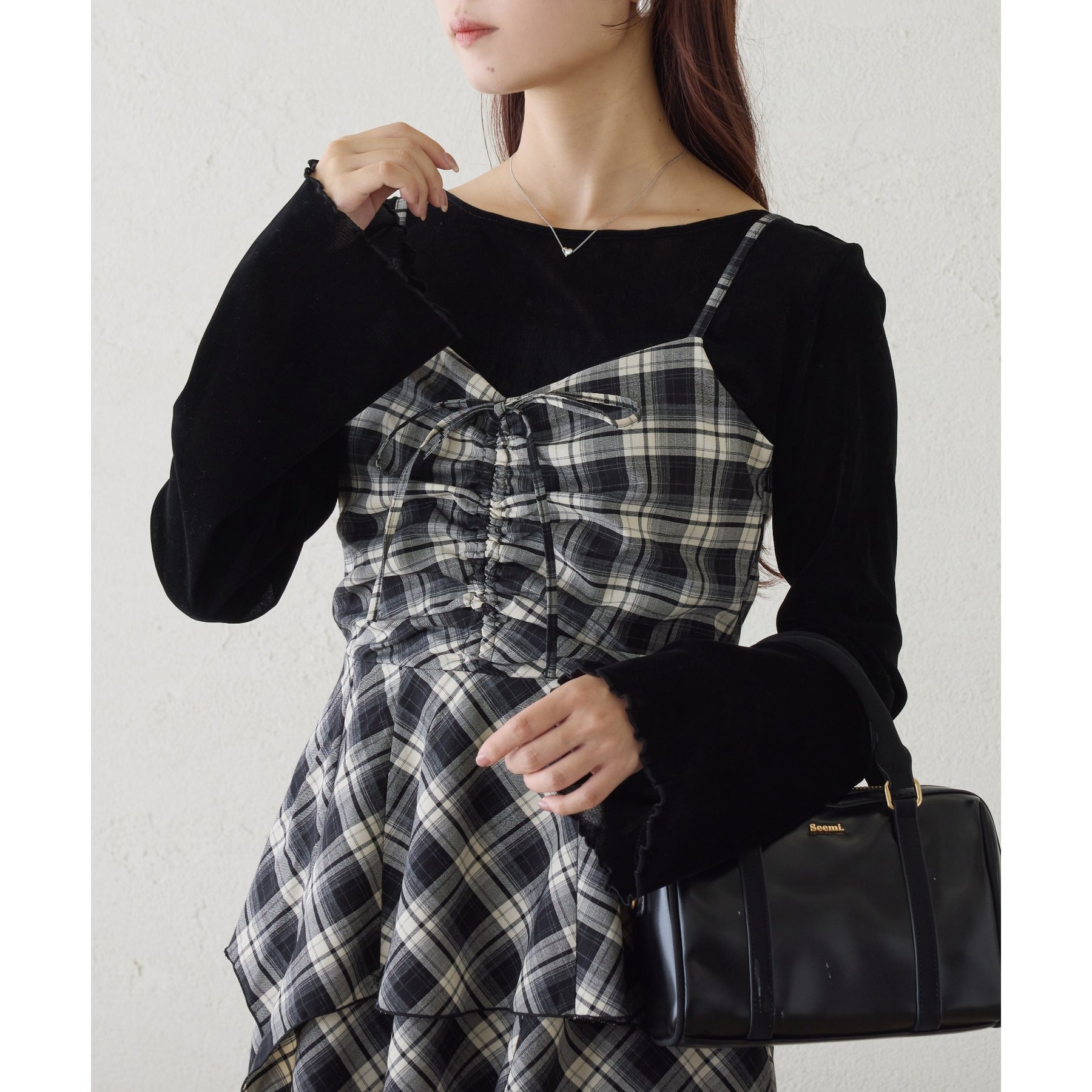 キャミワンピースのインナーとして着れば、リボンがチラッと見えて後ろ姿も華やかに仕上がります。