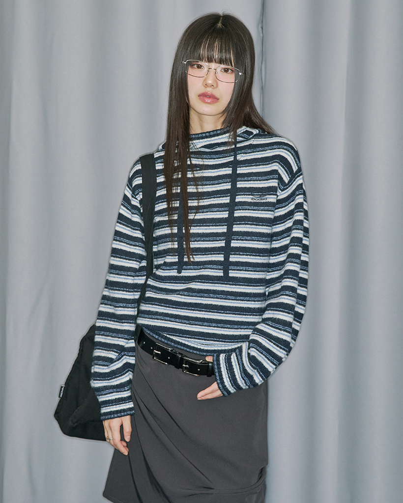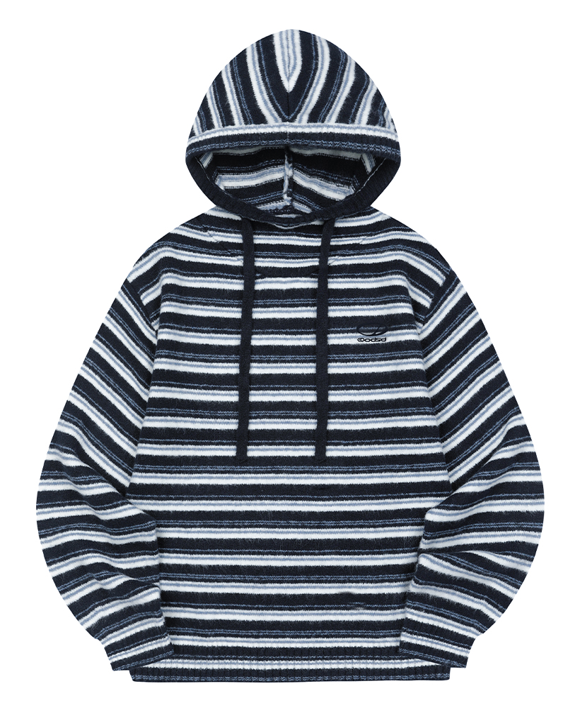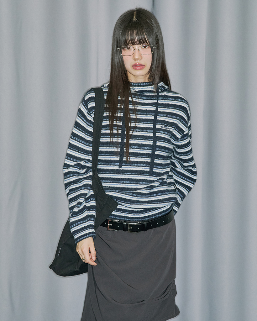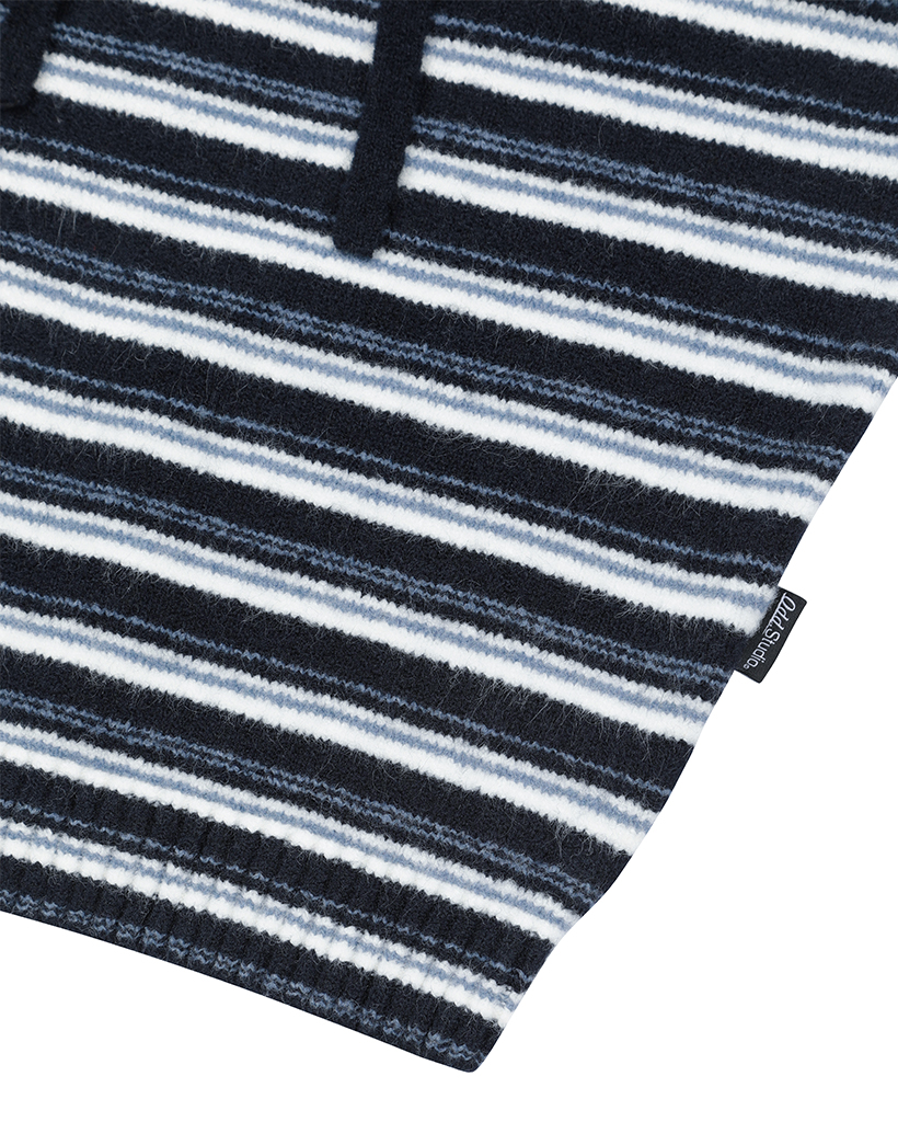 Stripe Turtleneck Balloonfit Hood Knit - NAVY