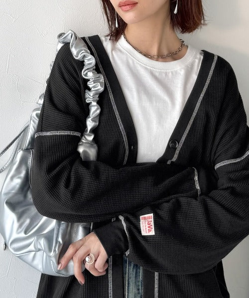 《JaVaジャバコラボ》ラフで上品な大人のゆるカジュアル。配色ステッチVネックワッフルカーディガン(長袖) jv1260505