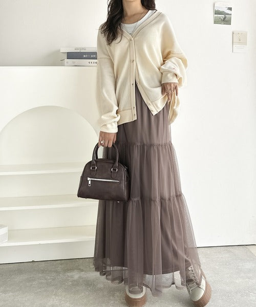ベーシックなデザインのカーディガンはどんなテイストにも合せやすく