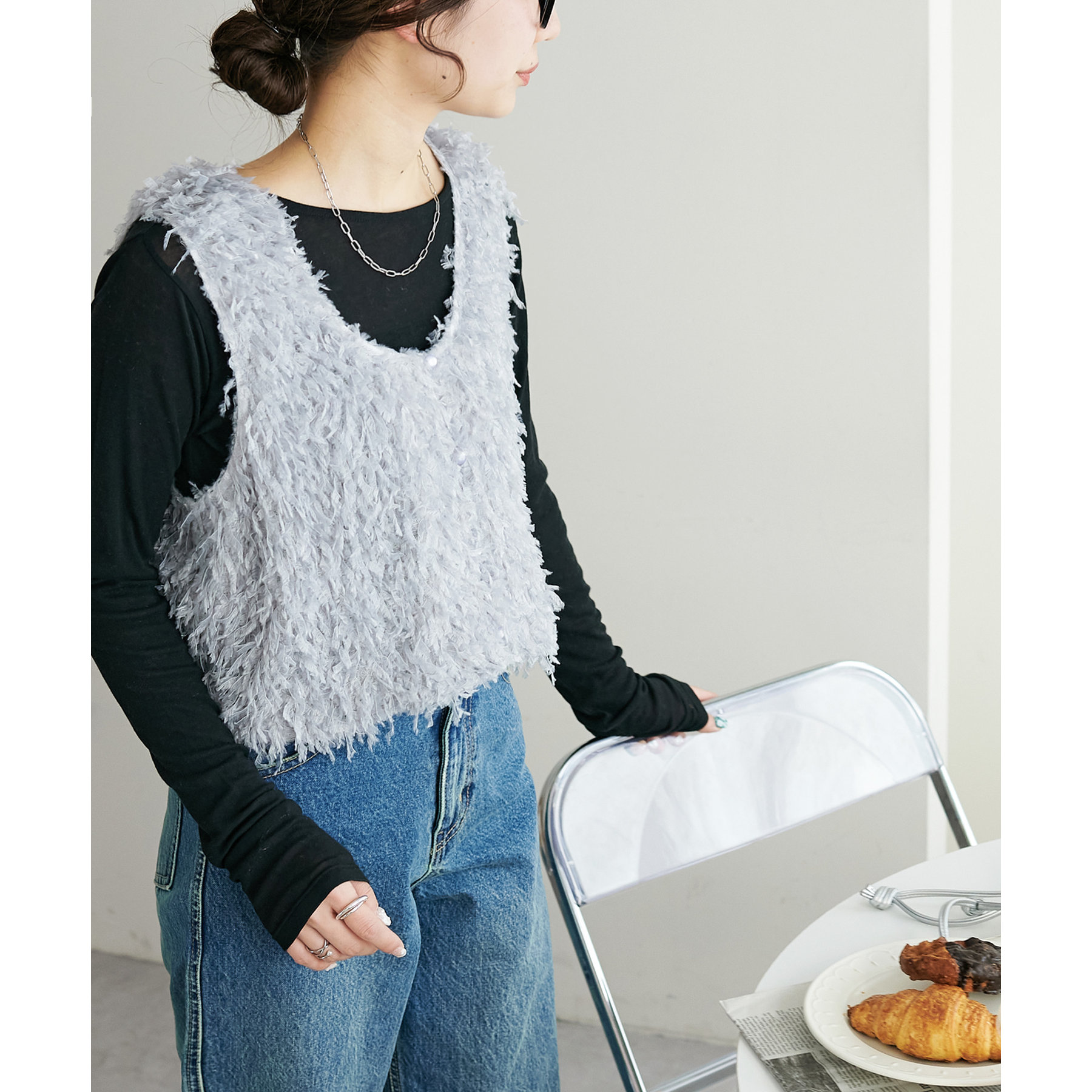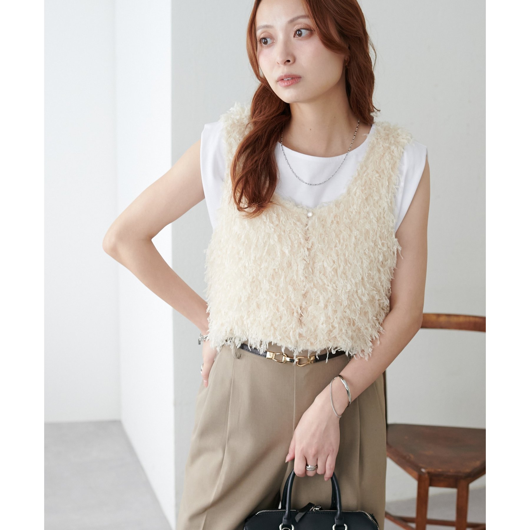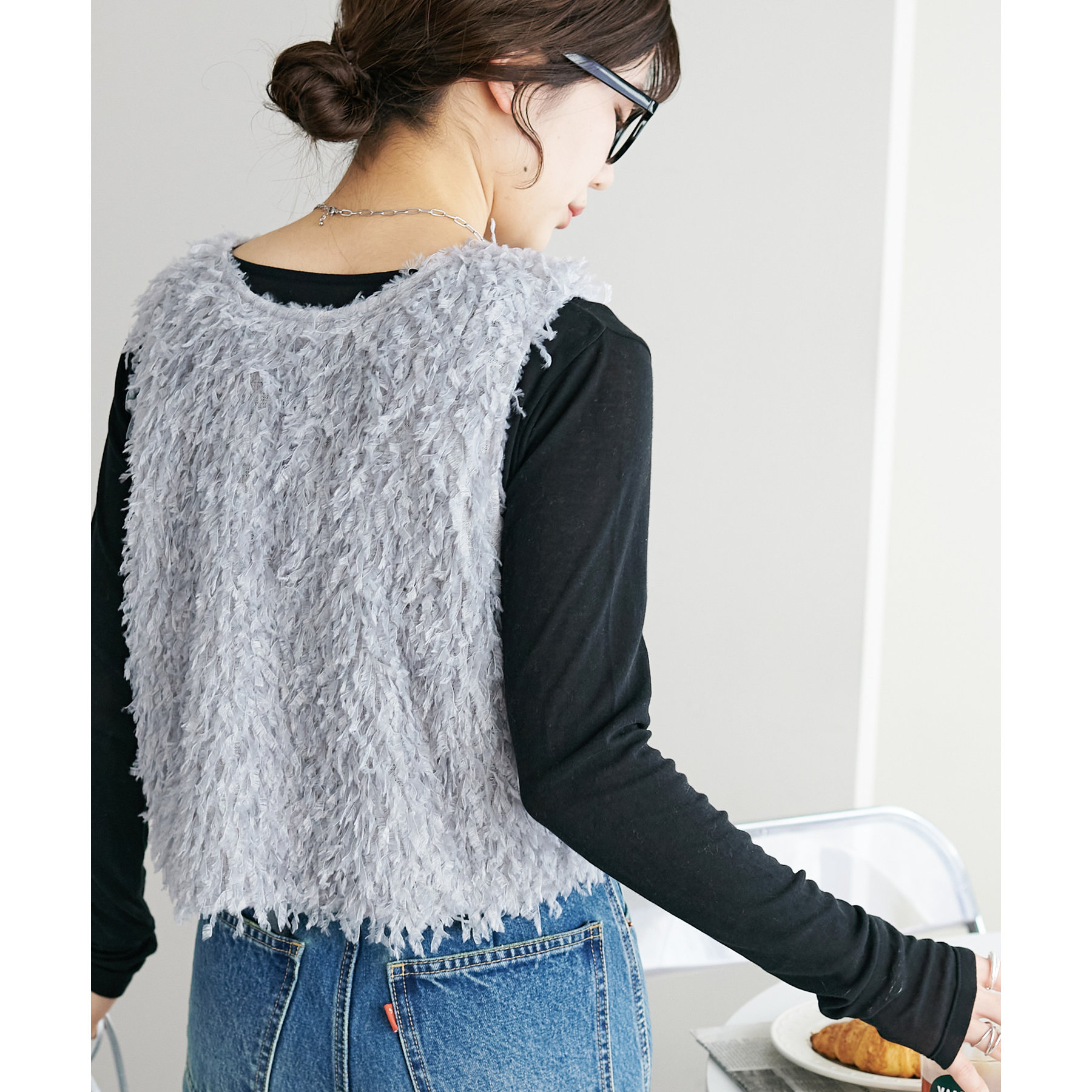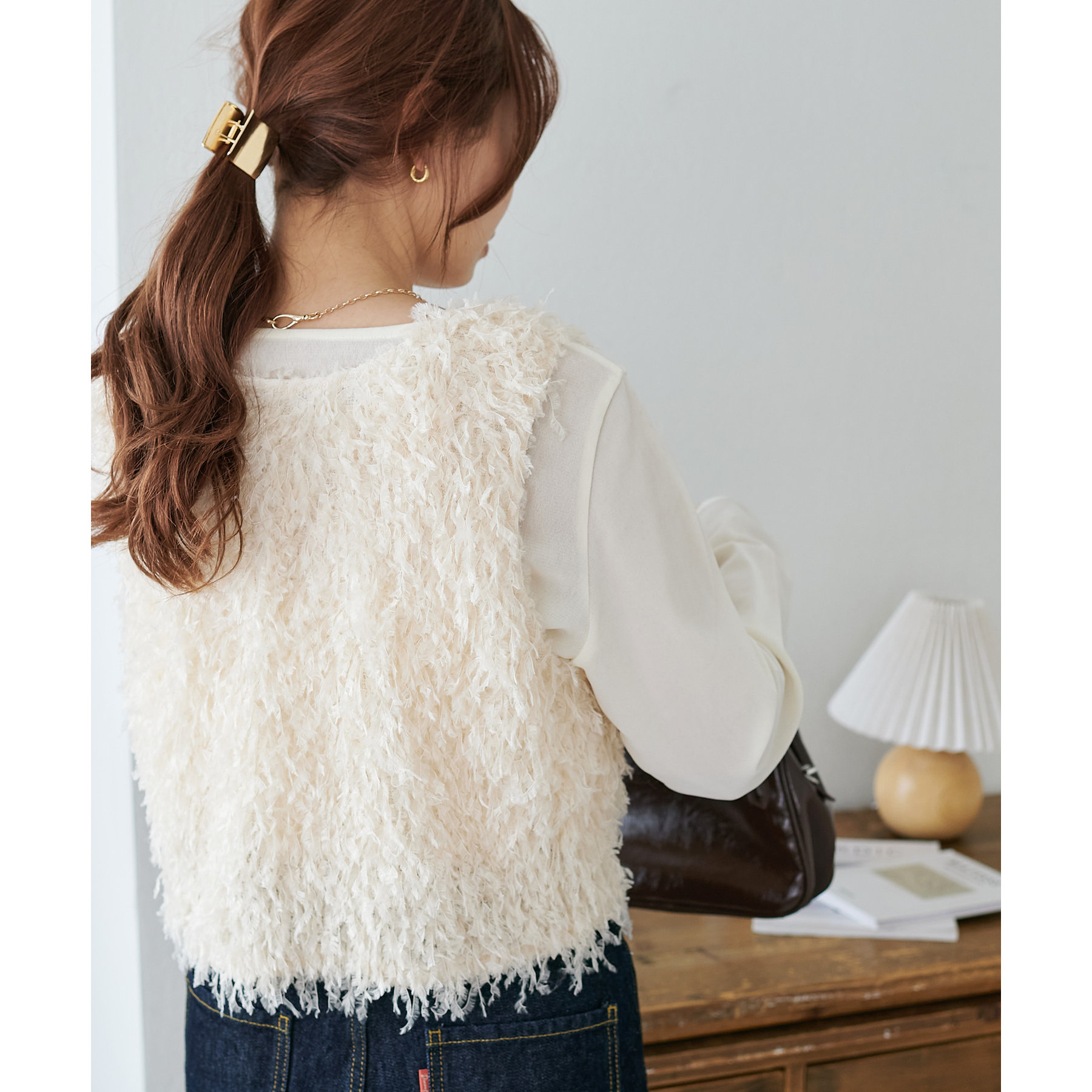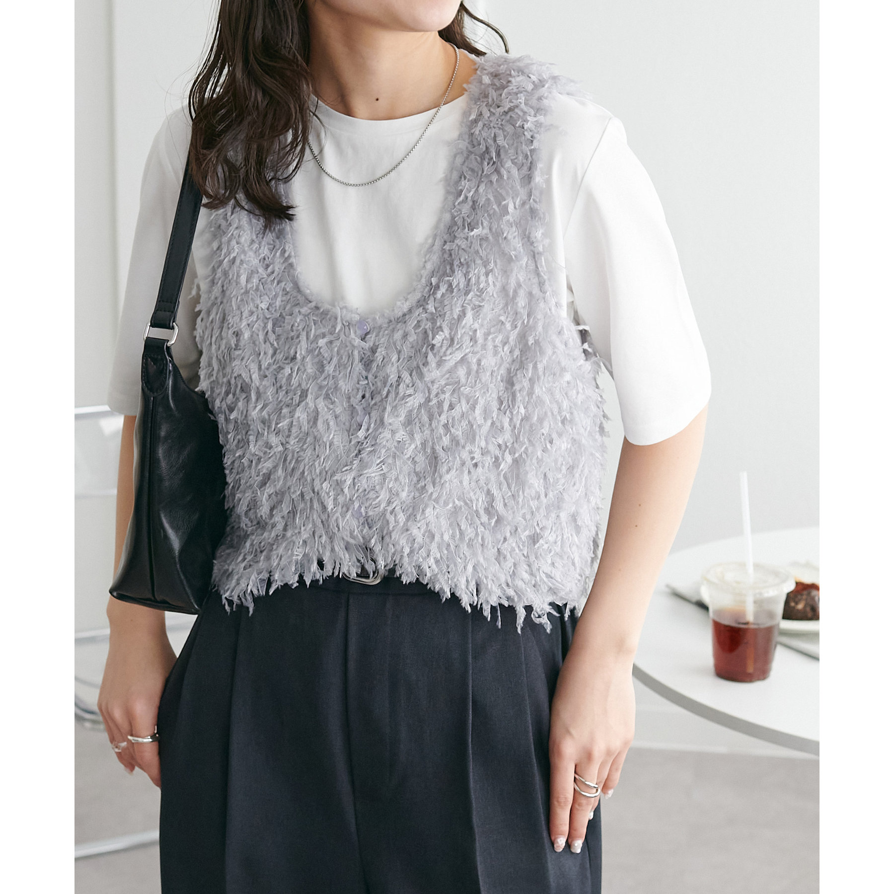 華やかで表面感のあるトレンド感の高いフリンジ素材のベストは、1枚は持っていたいアイテム。