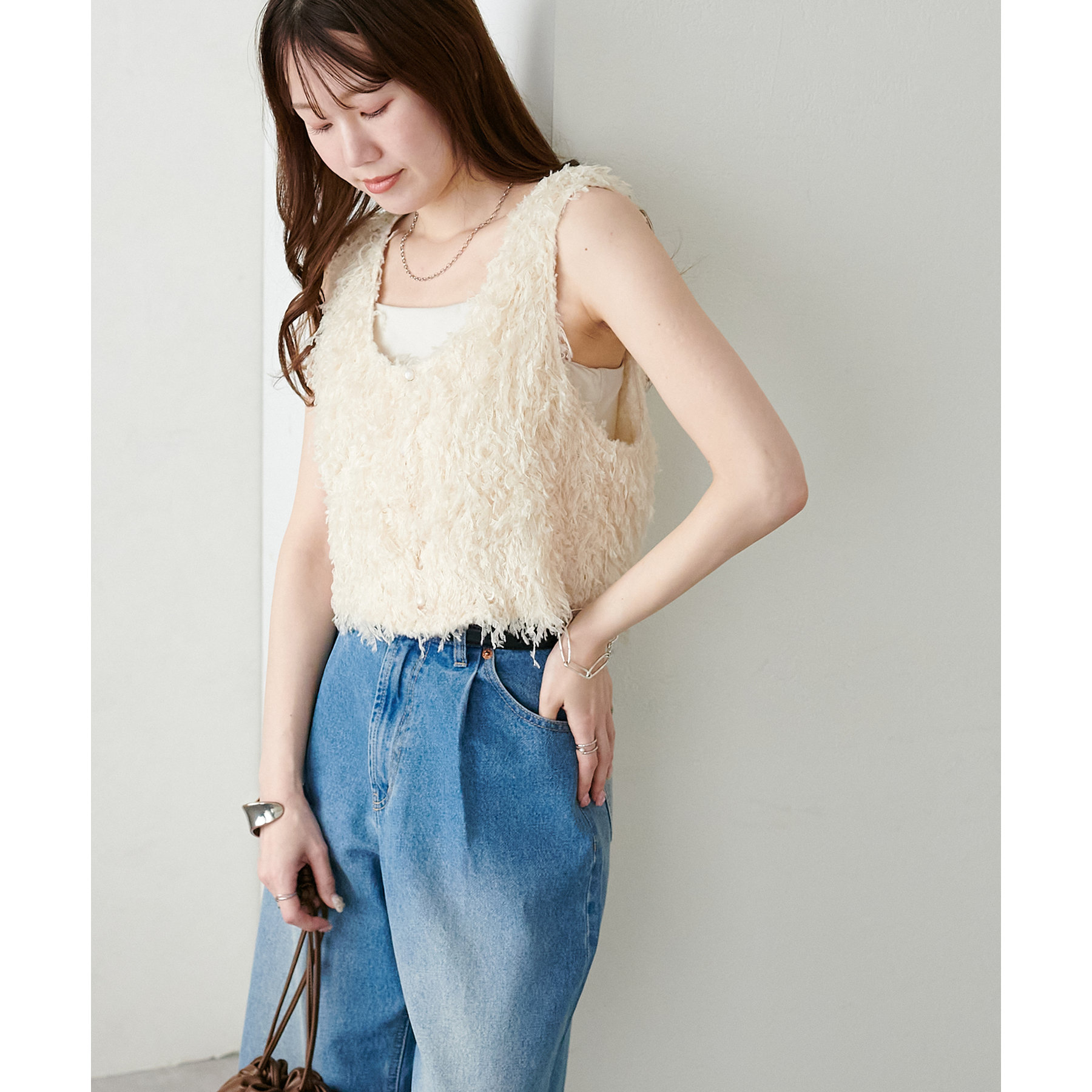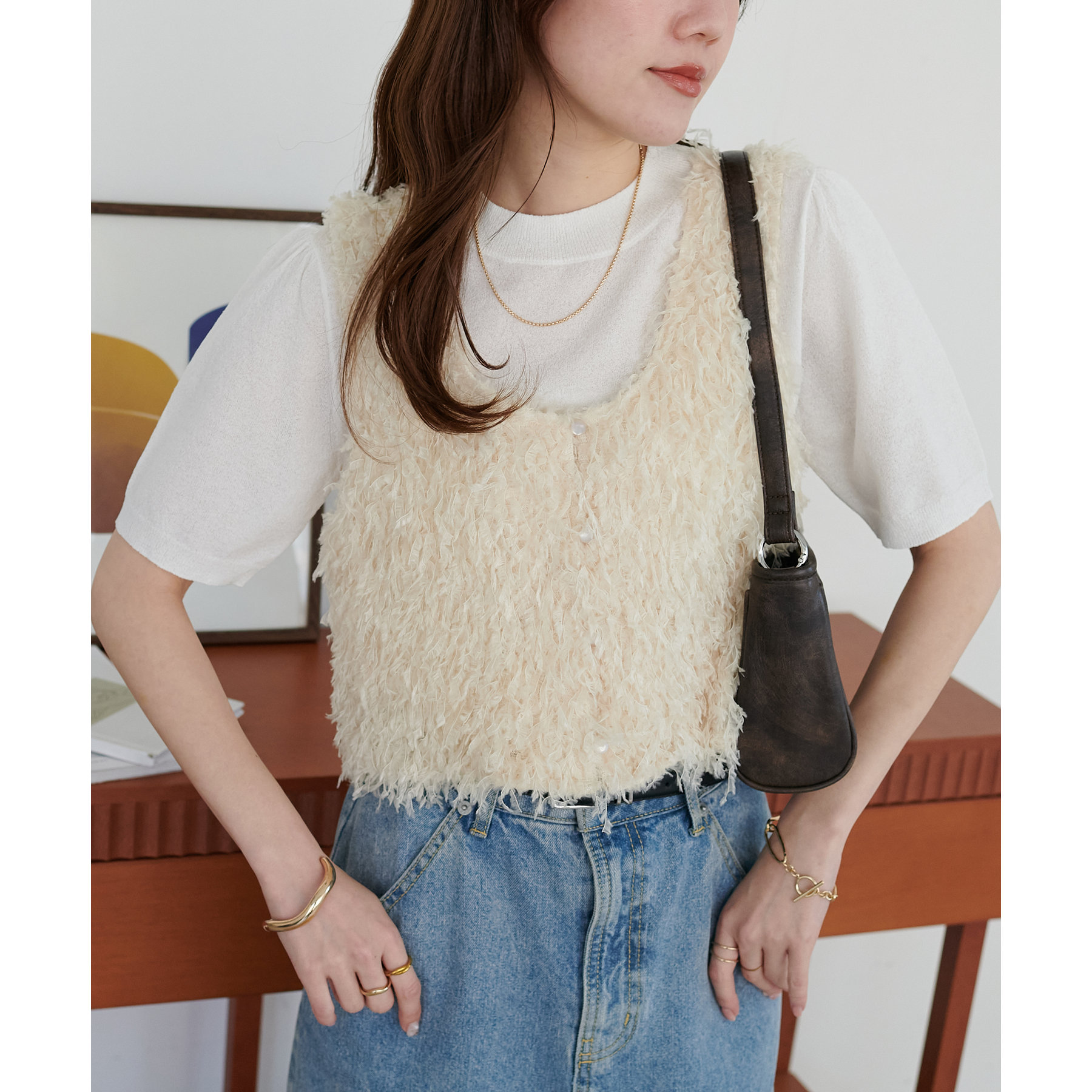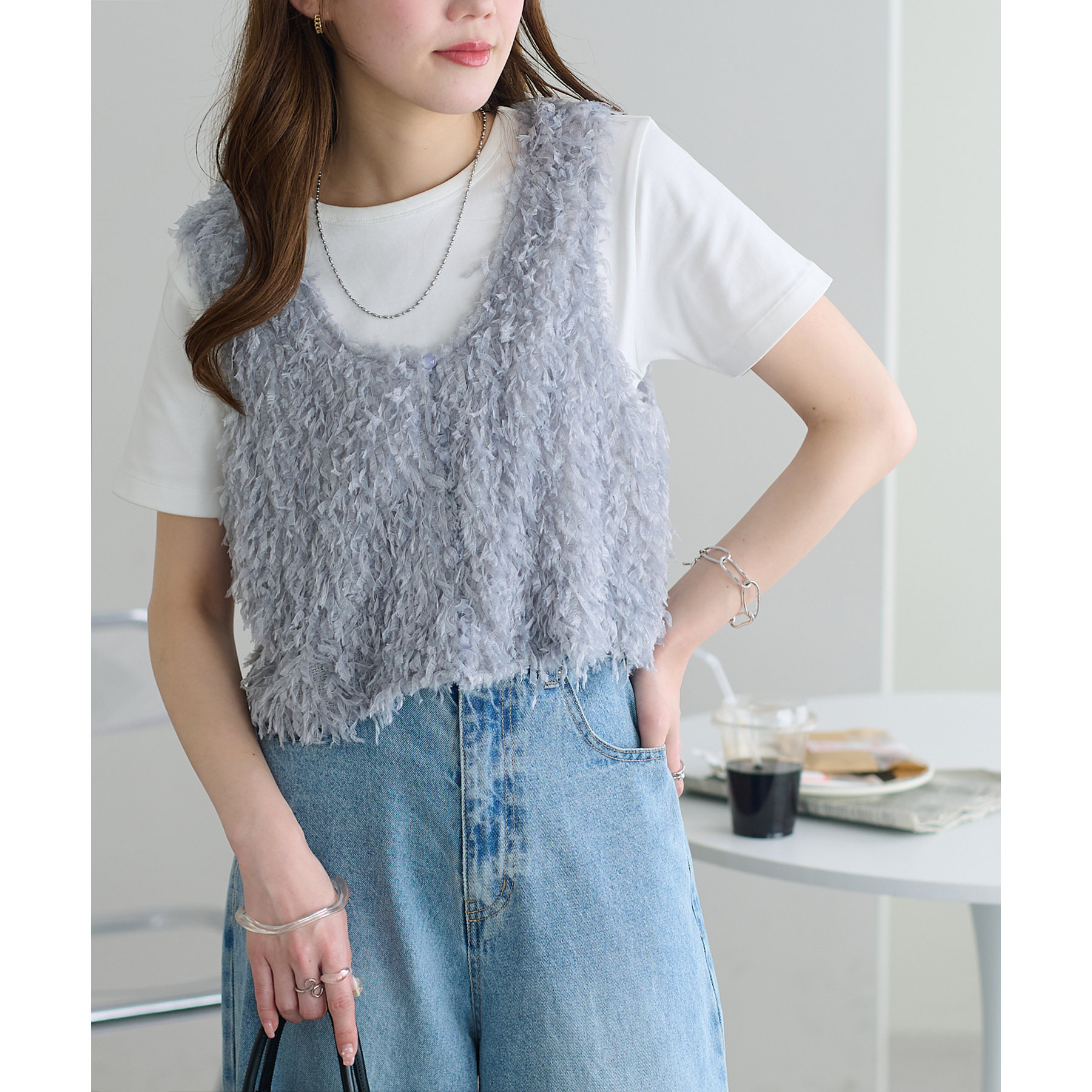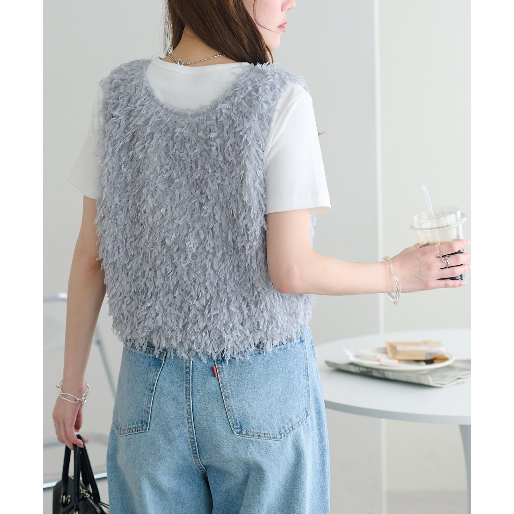 華やかで表面感のあるトレンド感の高いフリンジ素材のベストは、1枚は持っていたいアイテム。