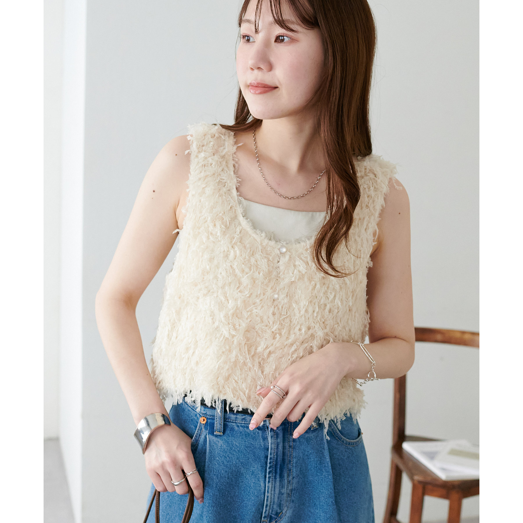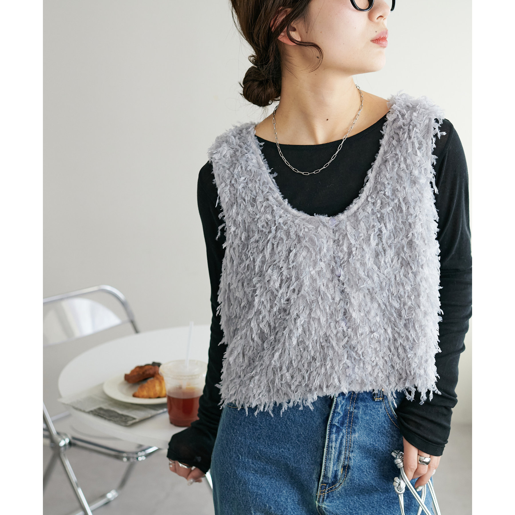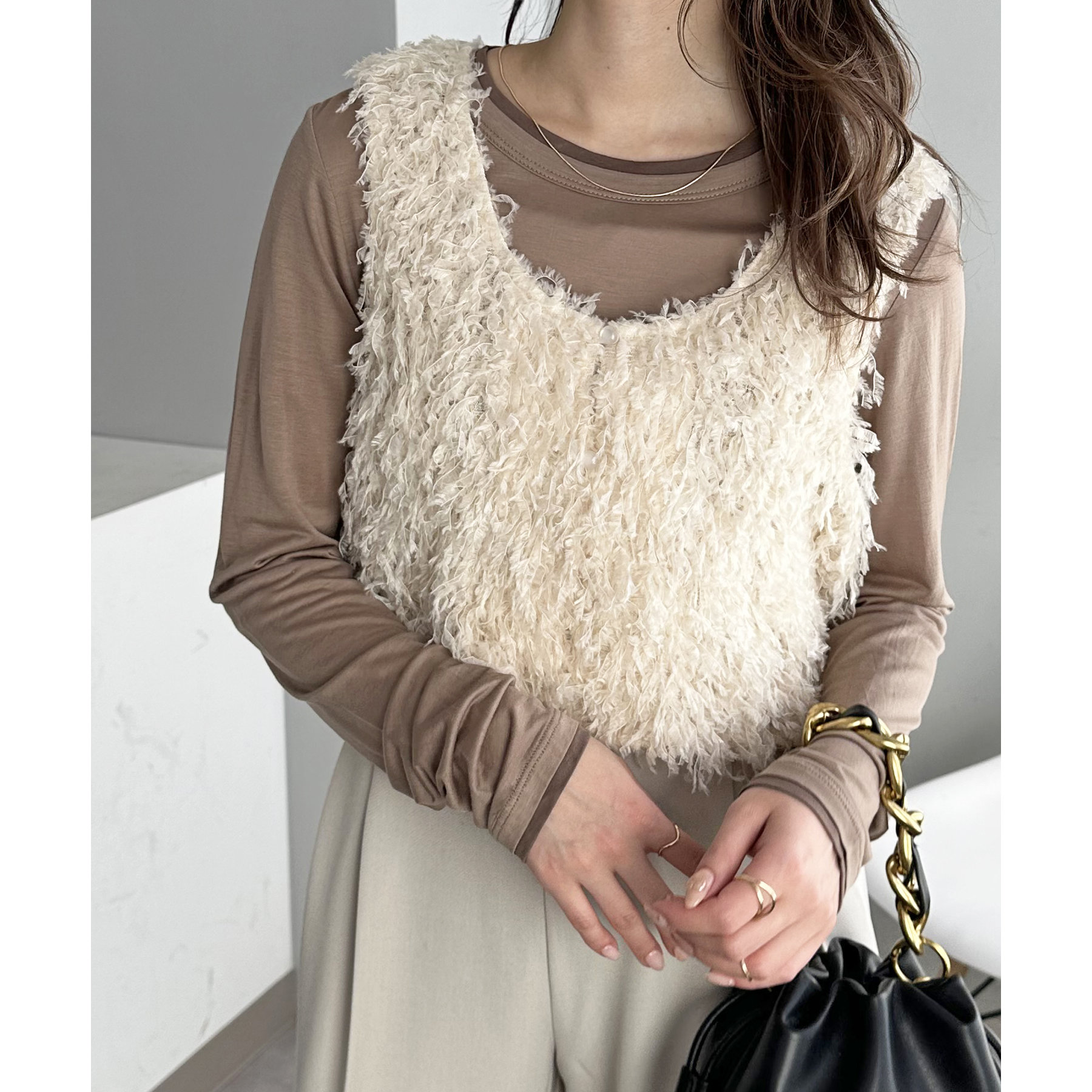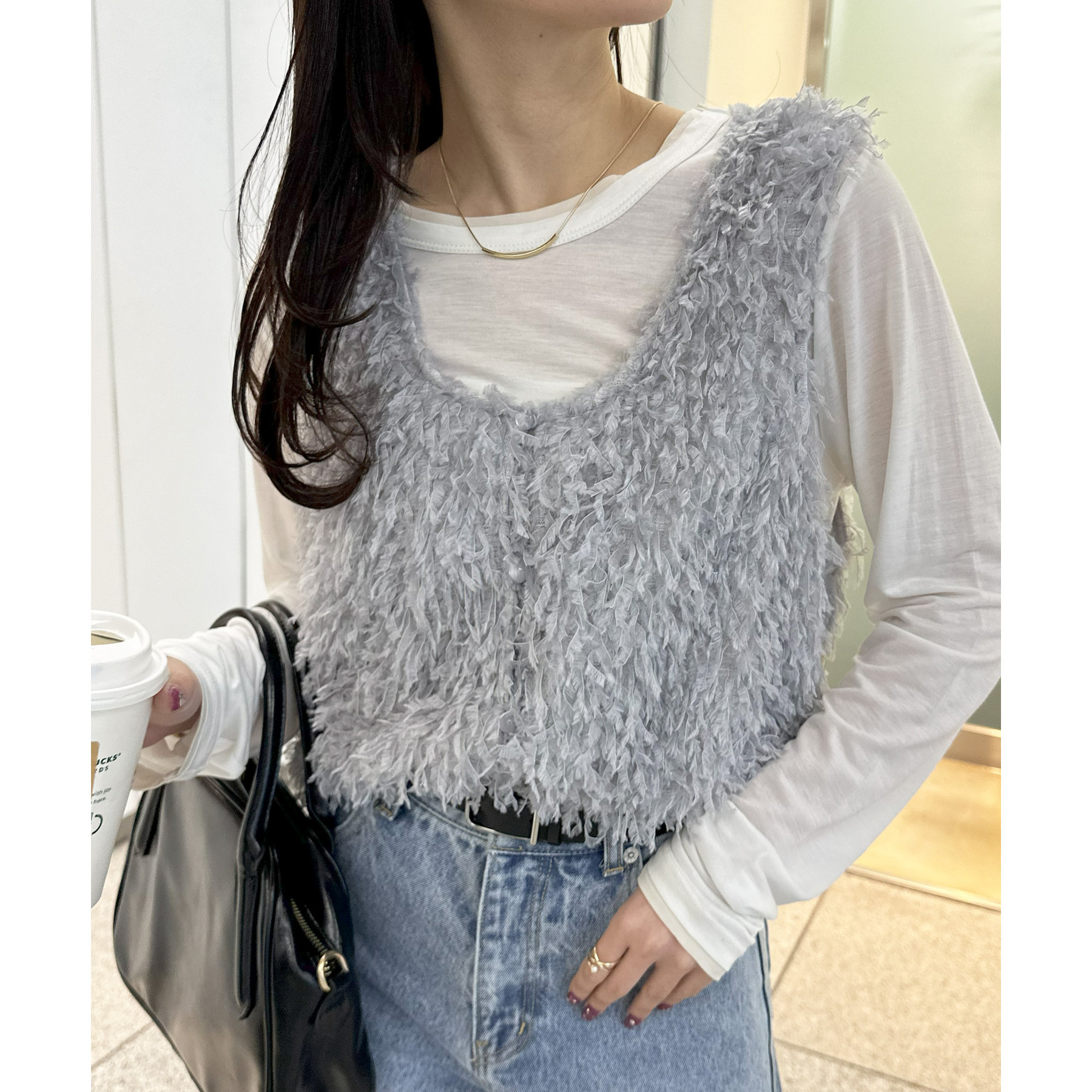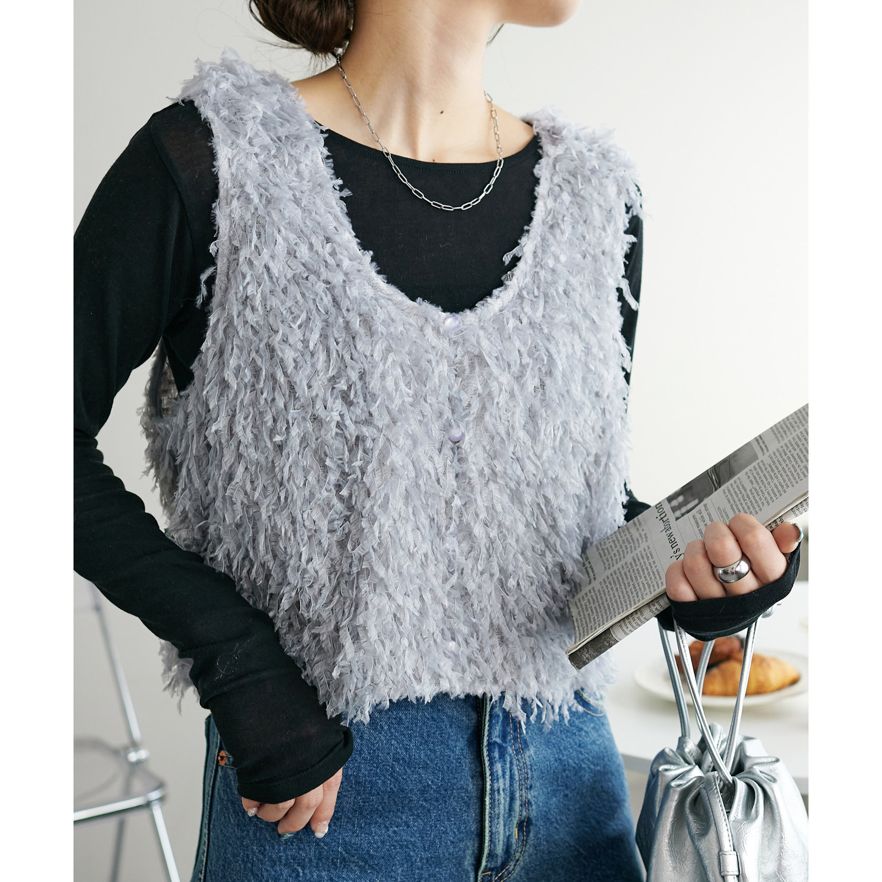 華やかで表面感のあるトレンド感の高いフリンジ素材のベストは、1枚は持っていたいアイテム。