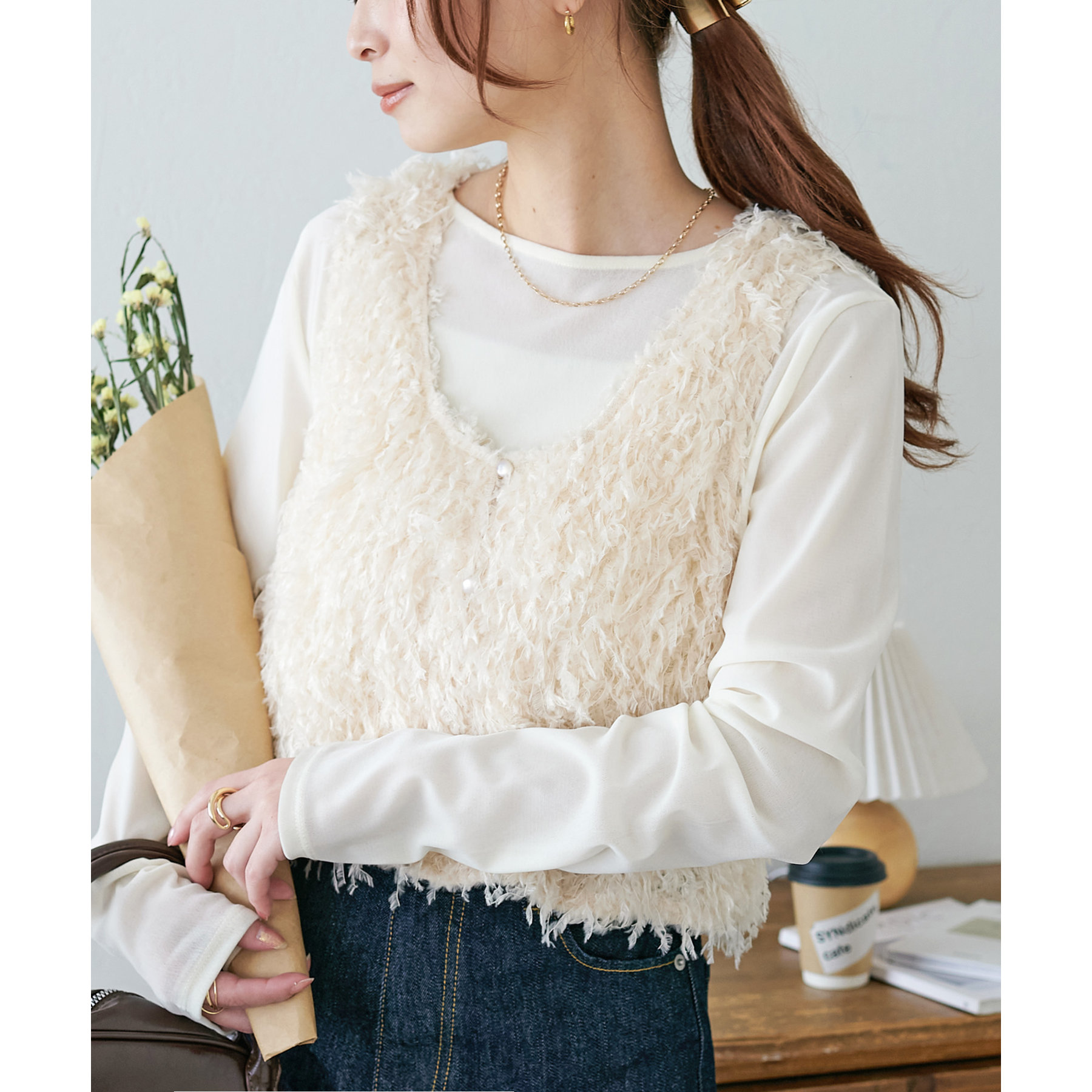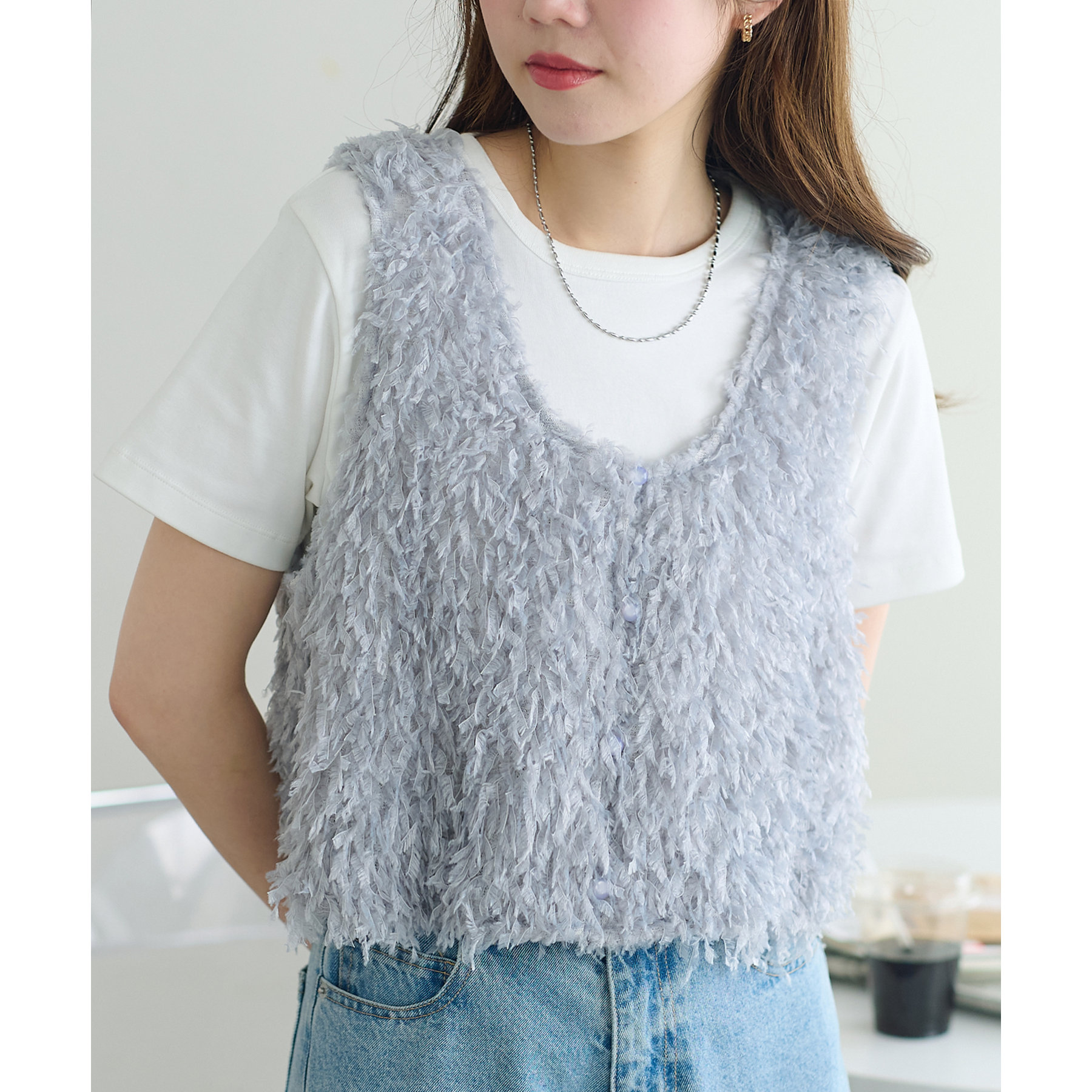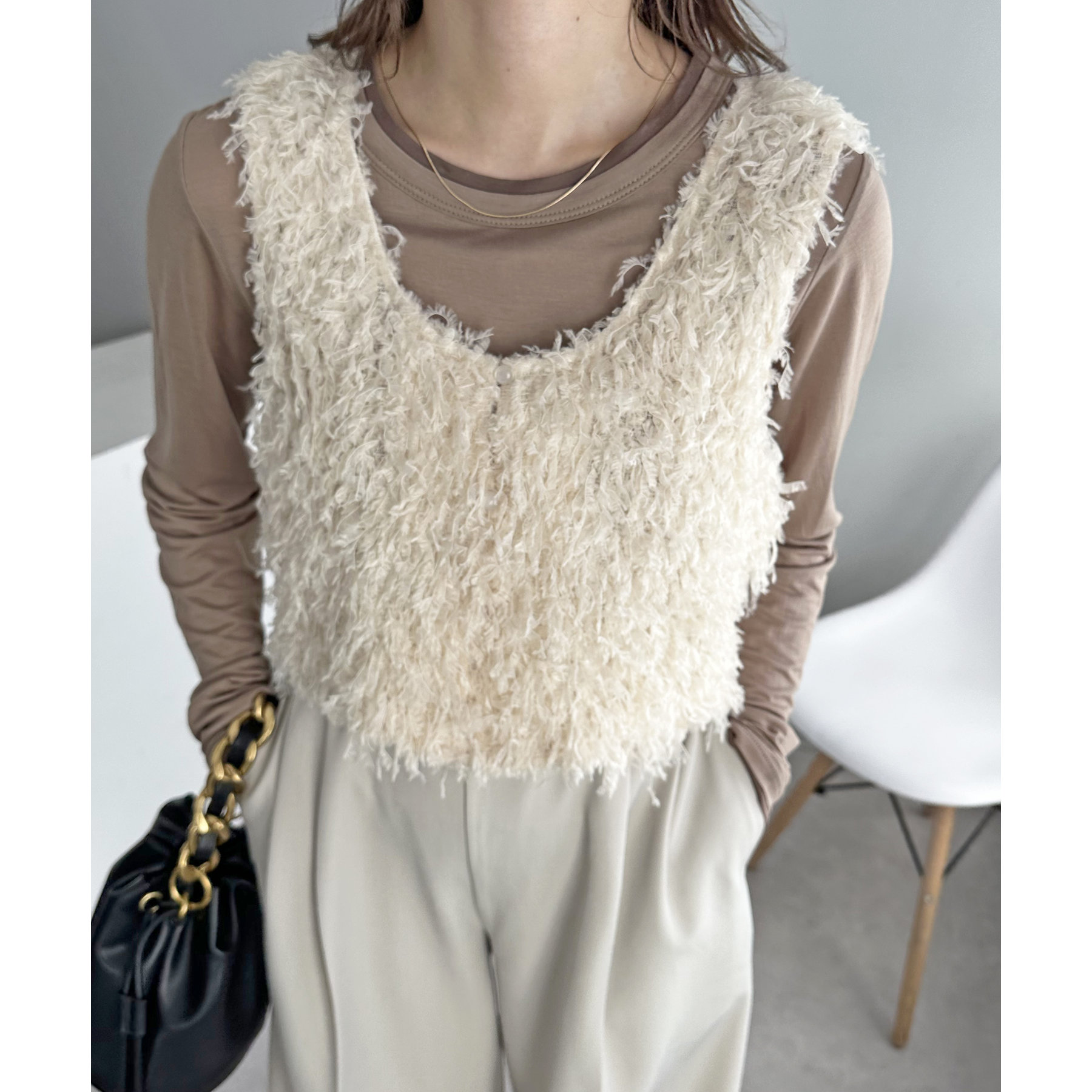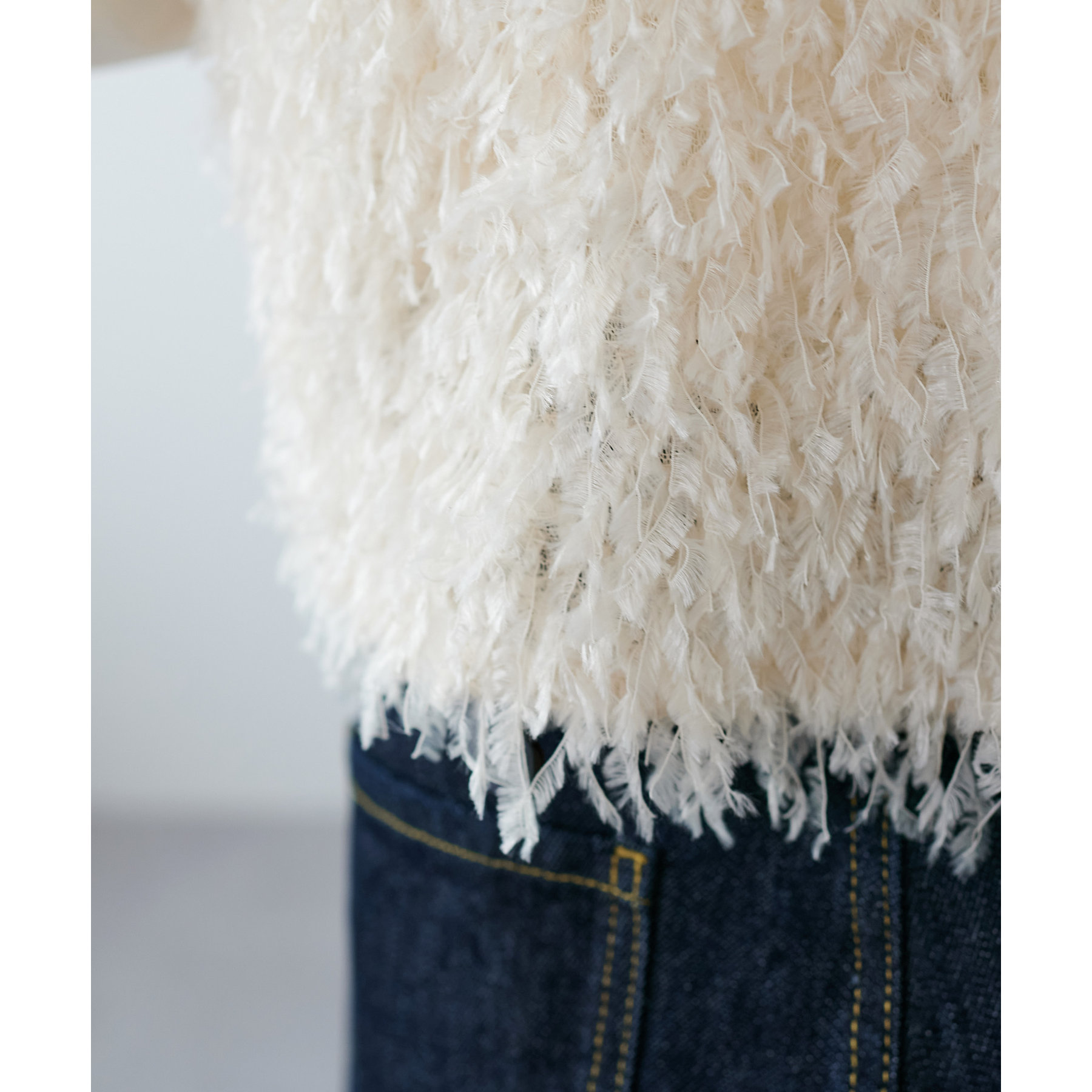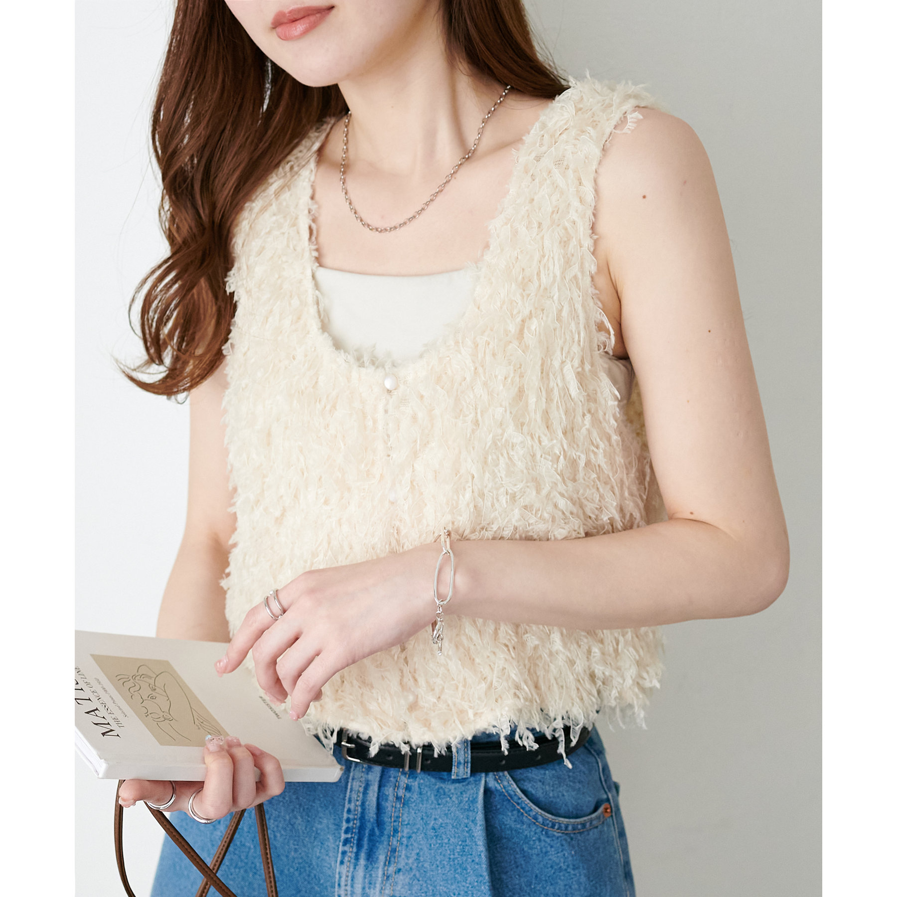 華やかで表面感のあるトレンド感の高いフリンジ素材のベストは、1枚は持っていたいアイテム。