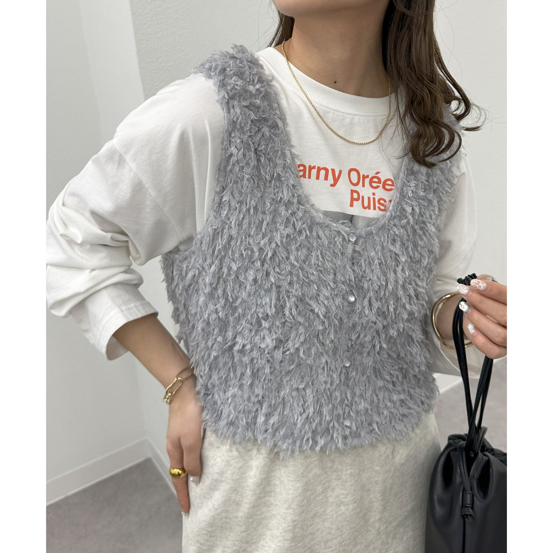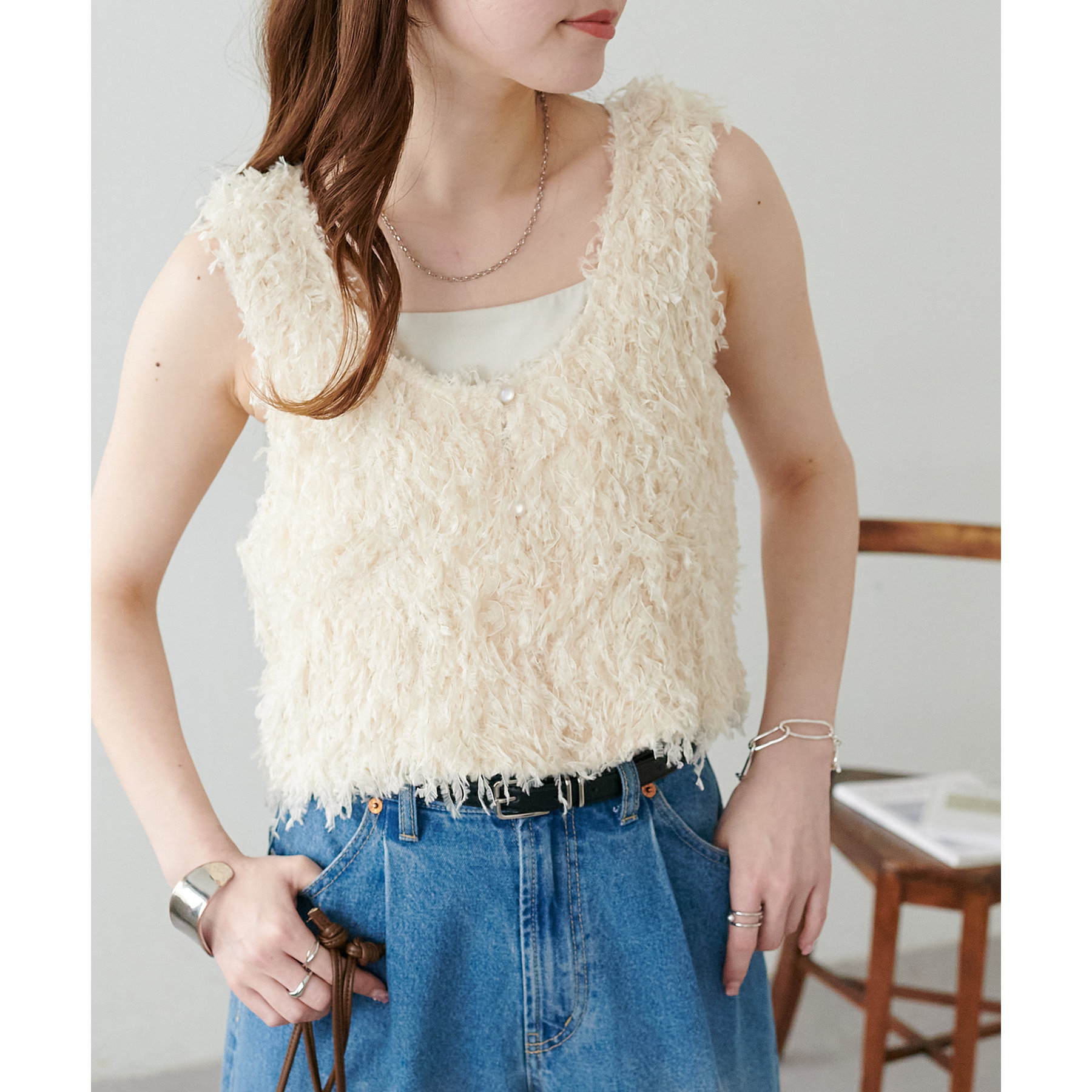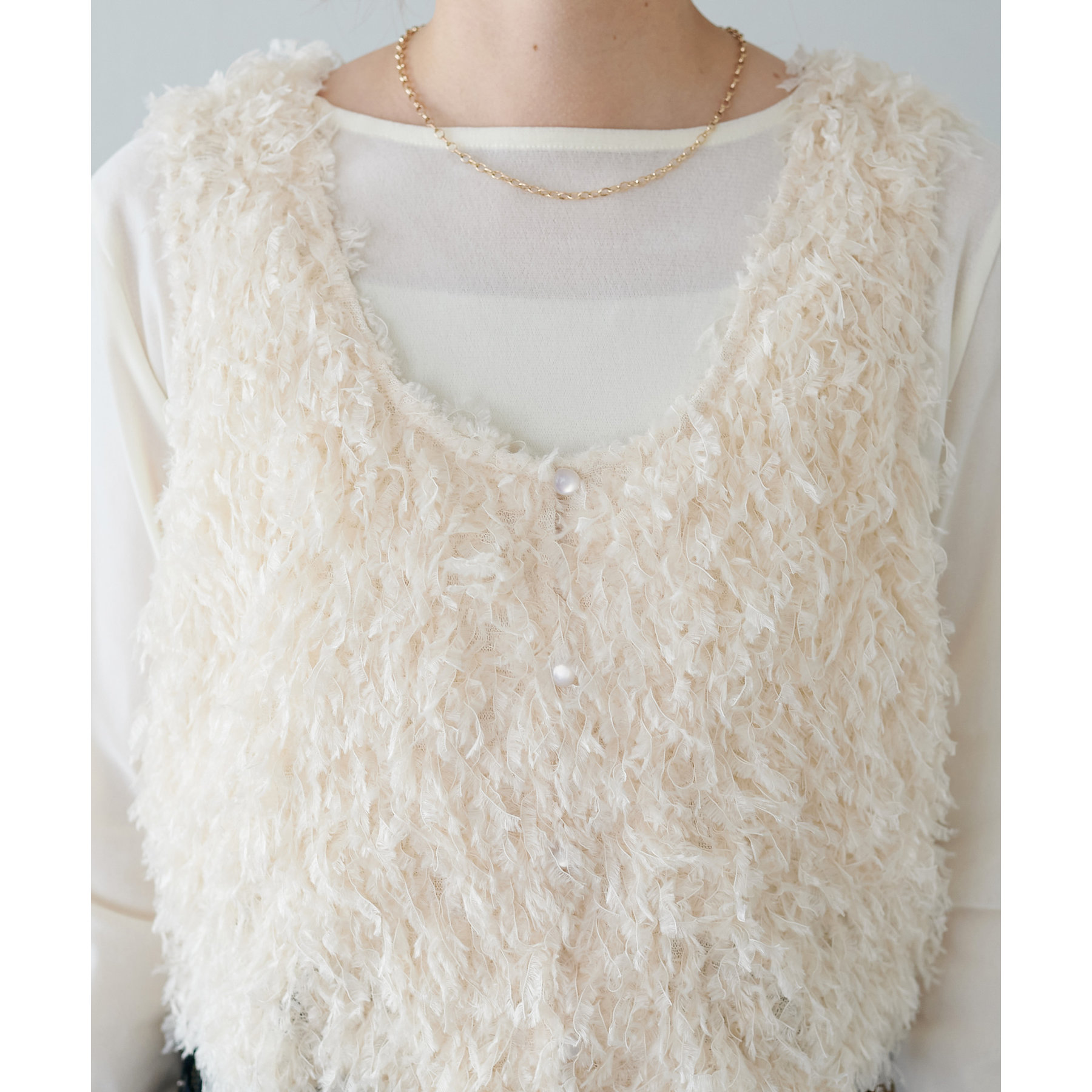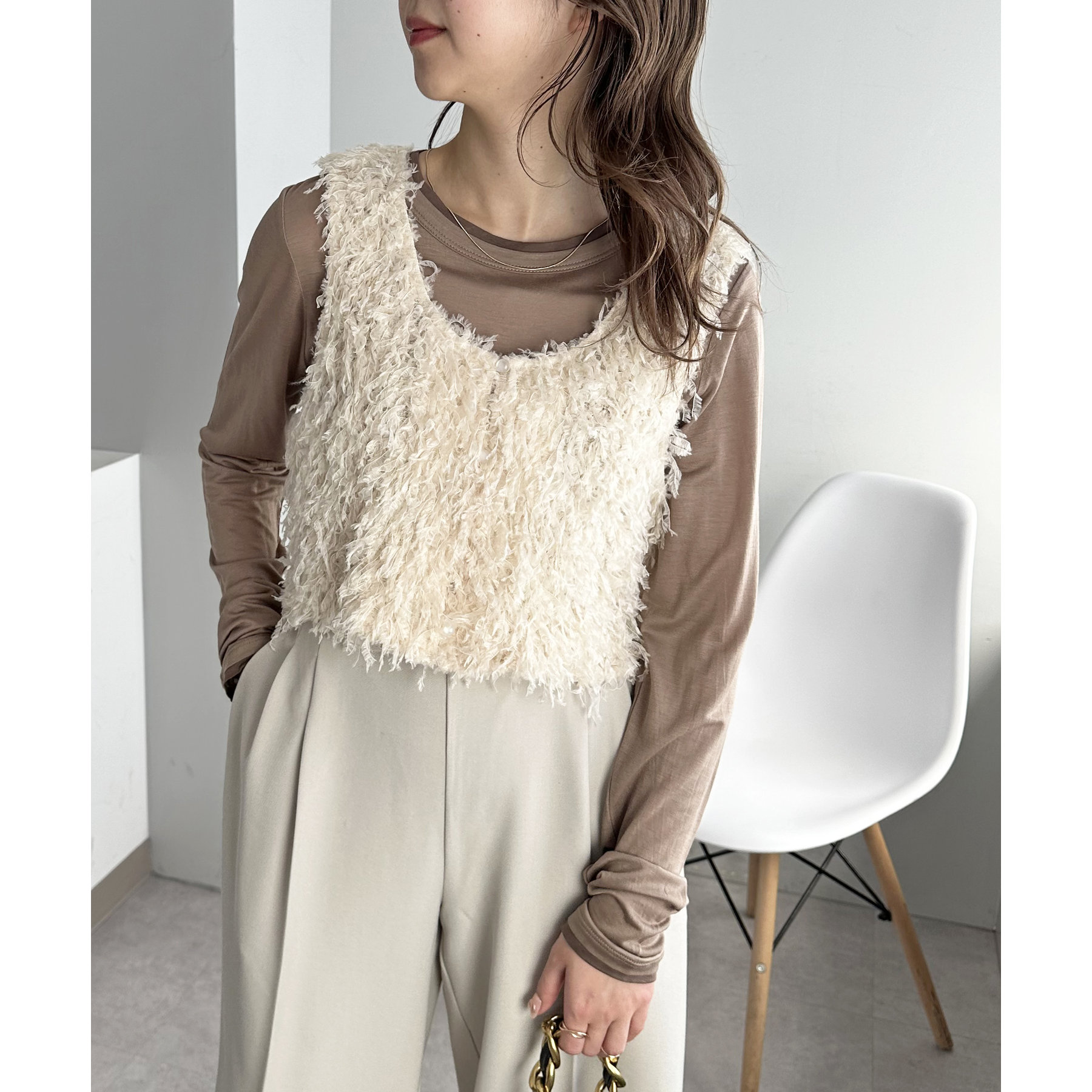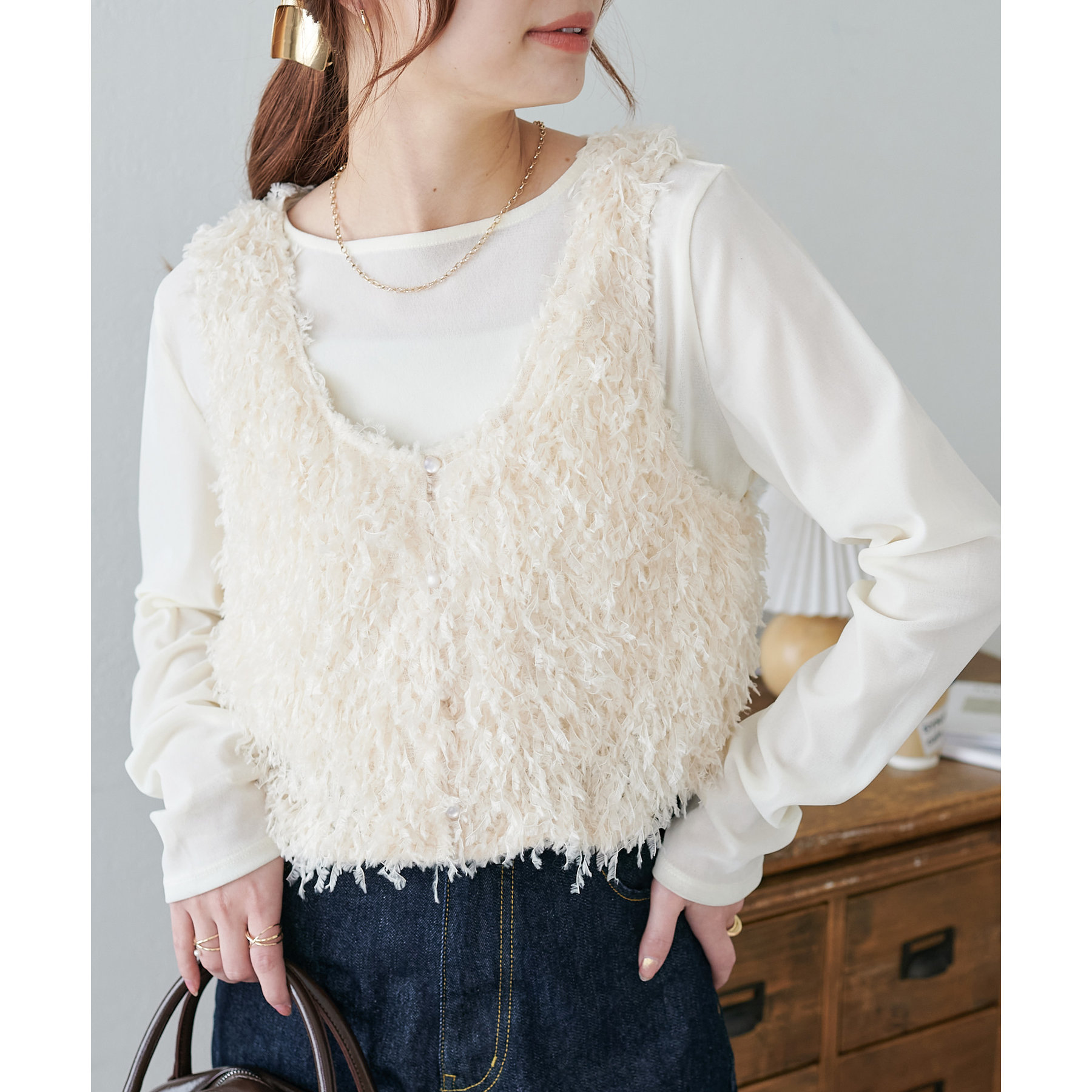 華やかで表面感のあるトレンド感の高いフリンジ素材のベストは、1枚は持っていたいアイテム。