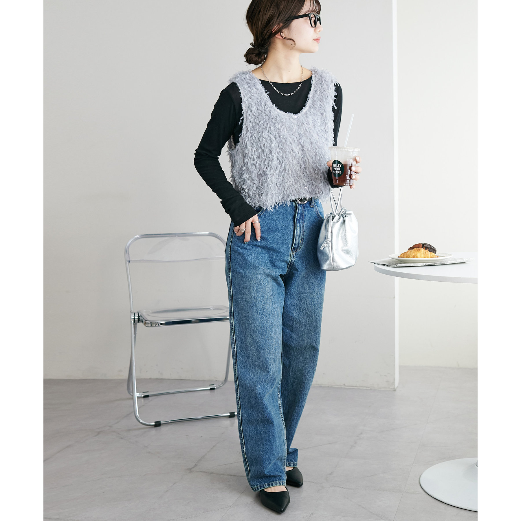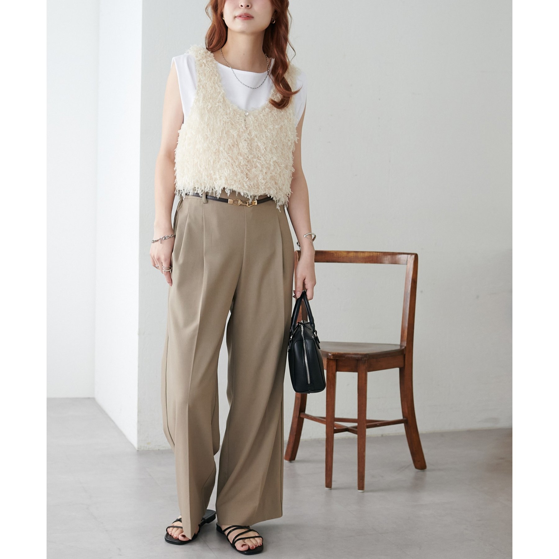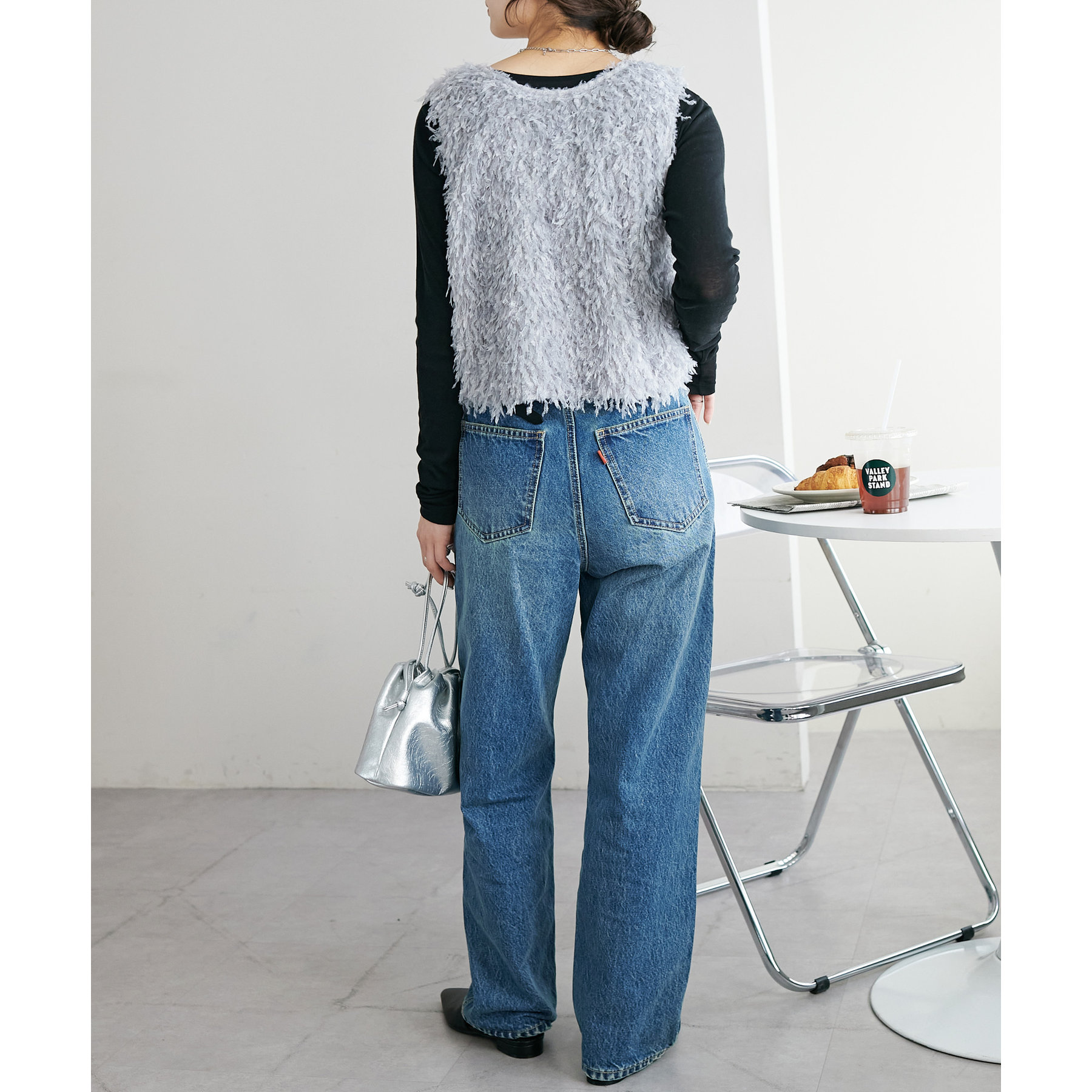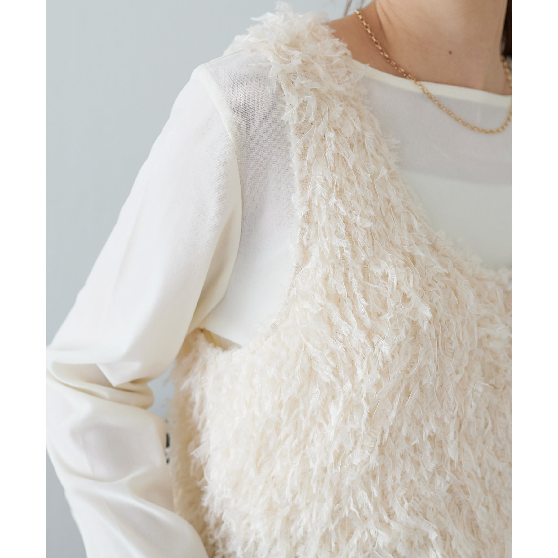華やかで表面感のあるトレンド感の高いフリンジ素材のベストは、1枚は持っていたいアイテム。