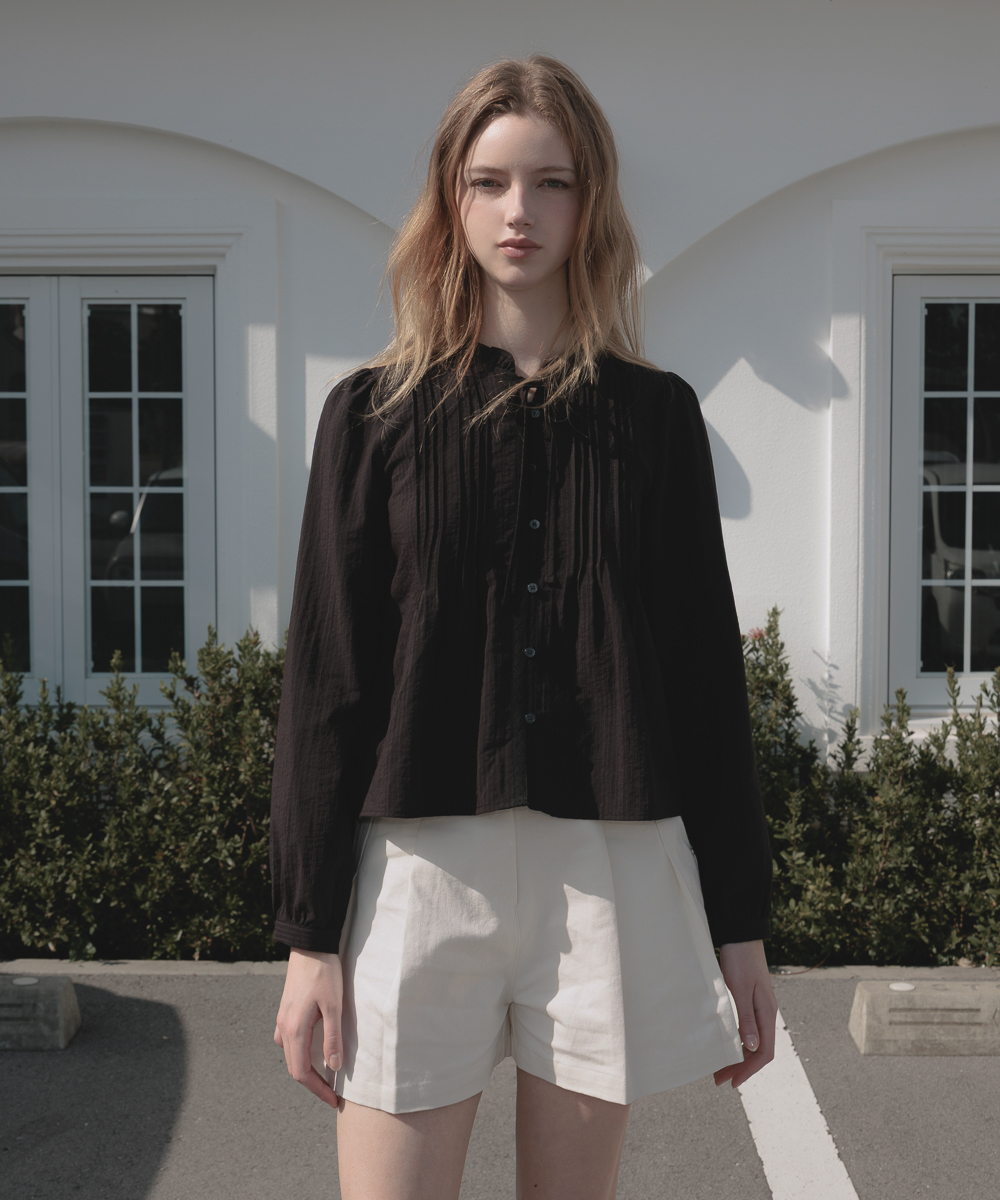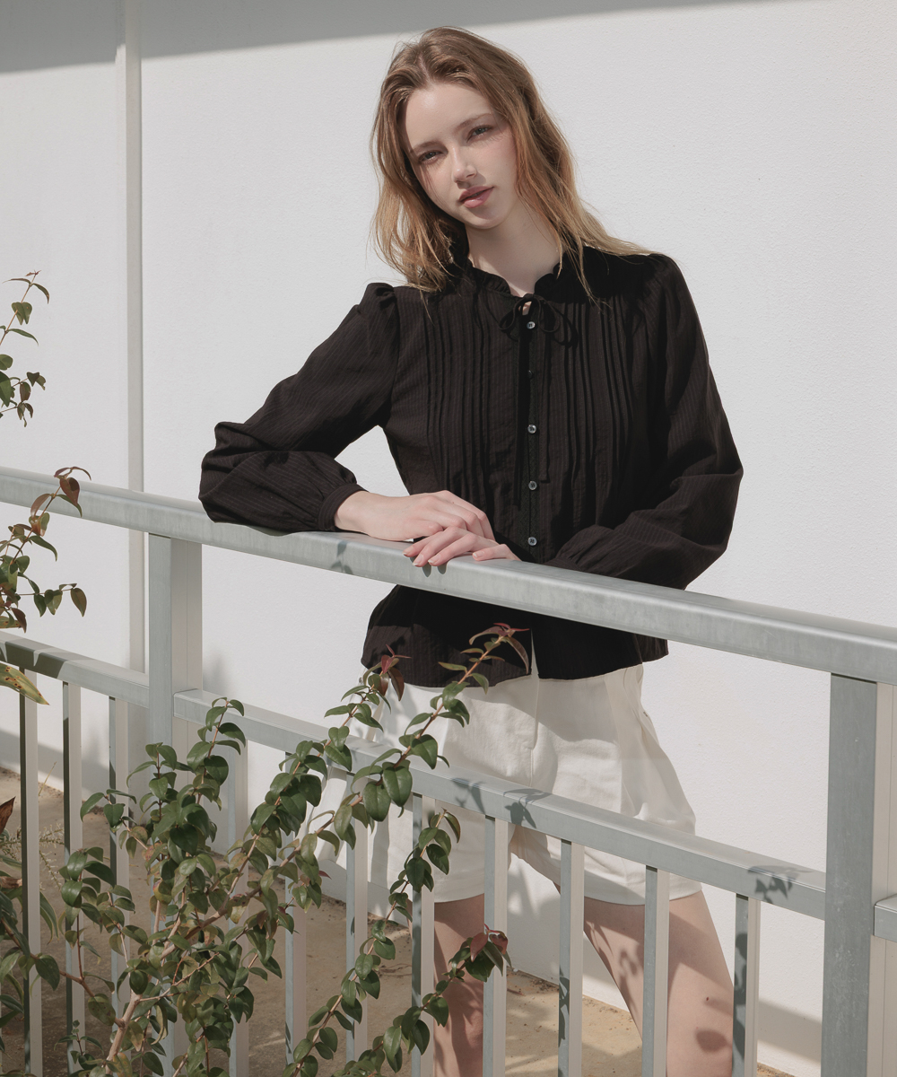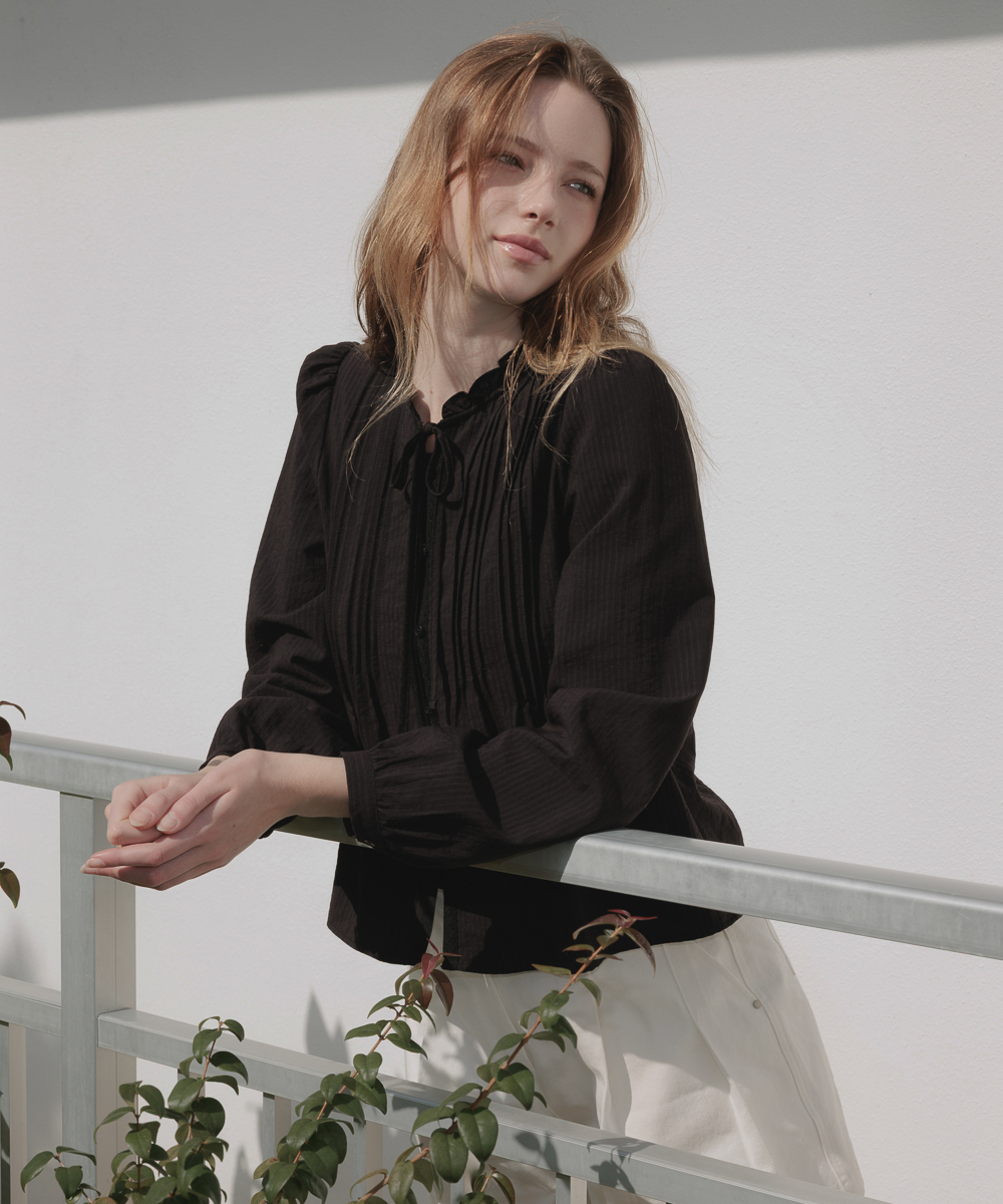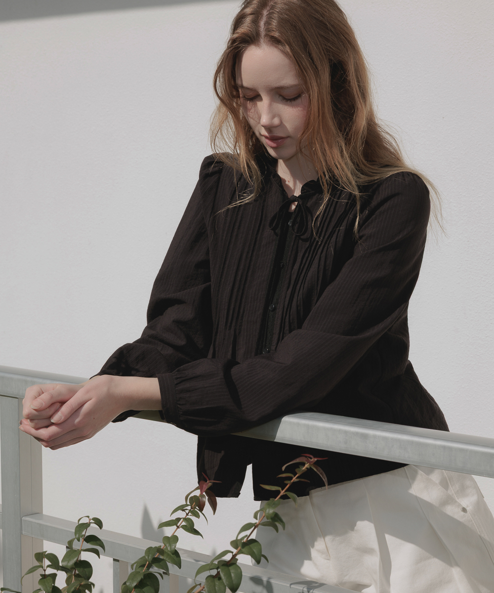 背面に加えられた繊細なピンタックディテールは全体のシルエットに柔らかなボリュームを与え、フェミニンなムードを演出します。