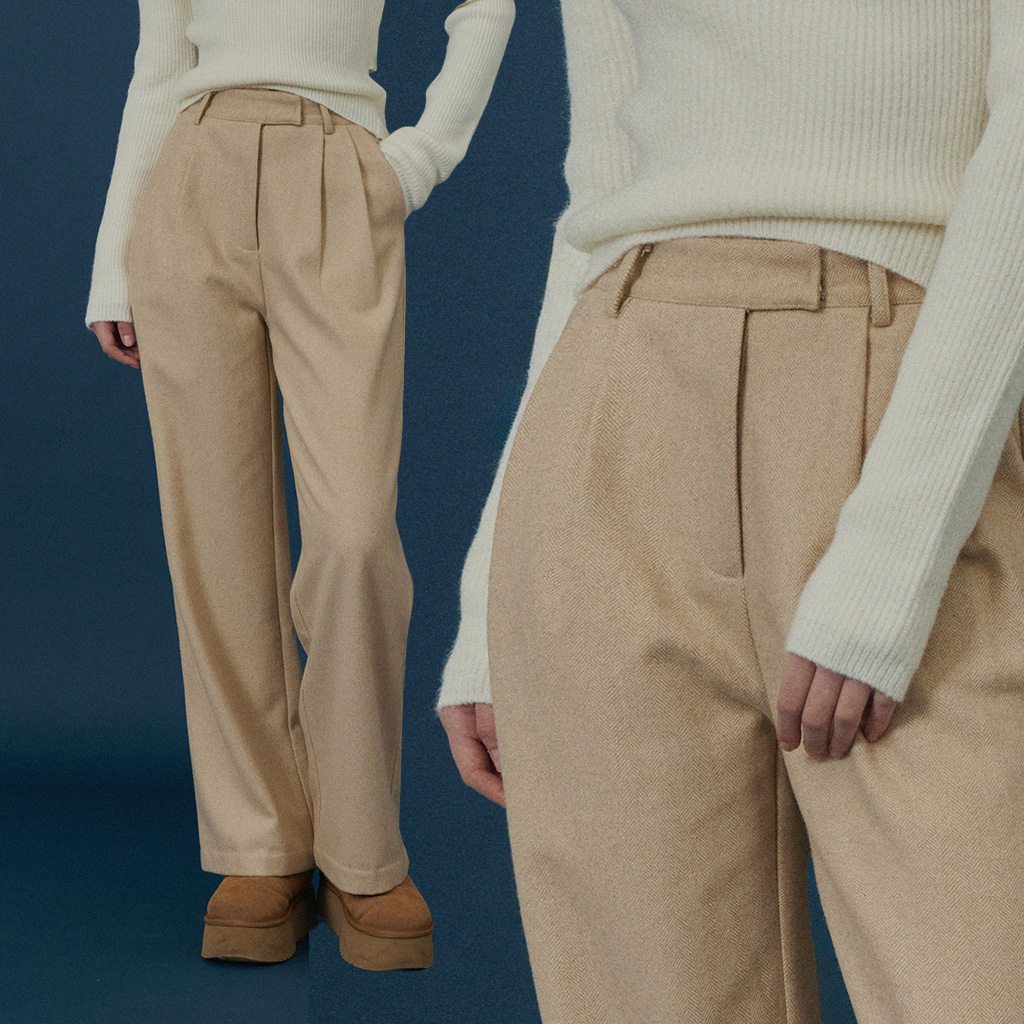 Denim Herringbone Pintuck Wide Slacks (50% Wool)