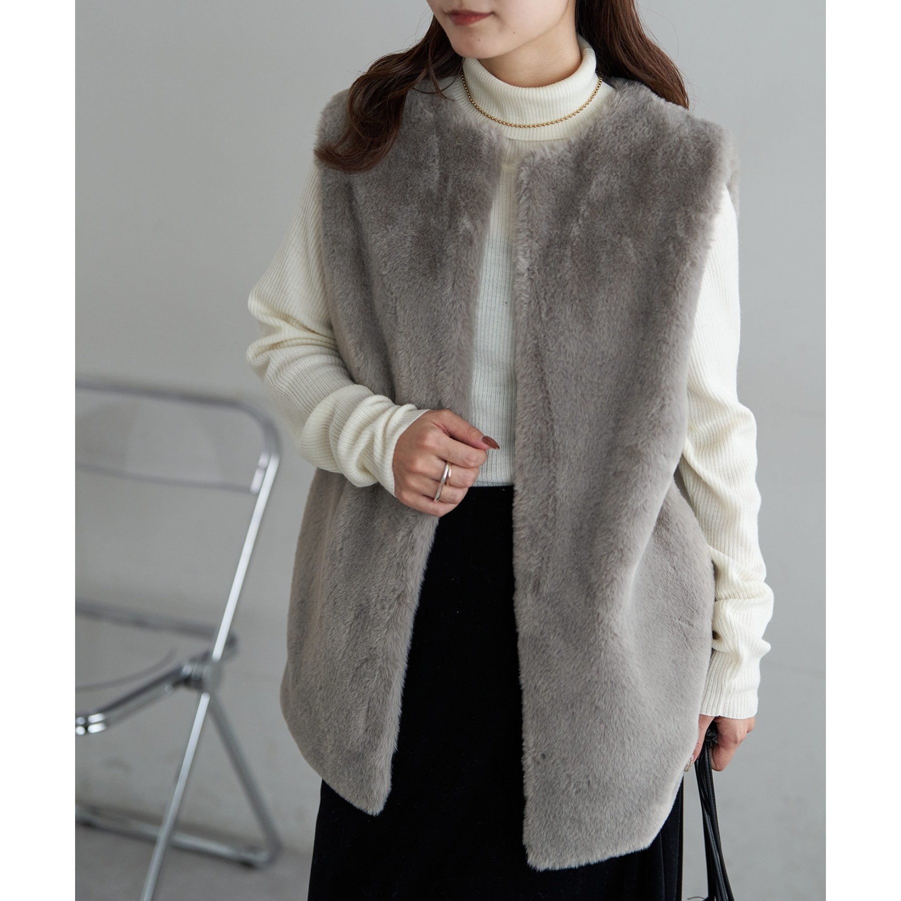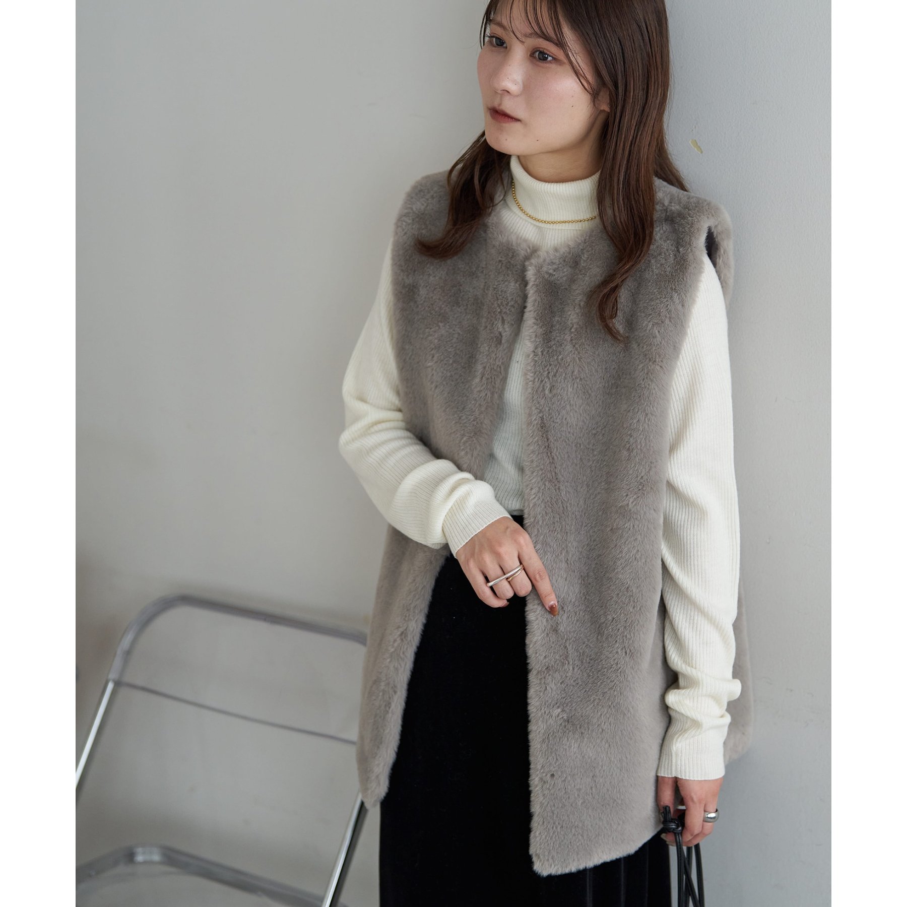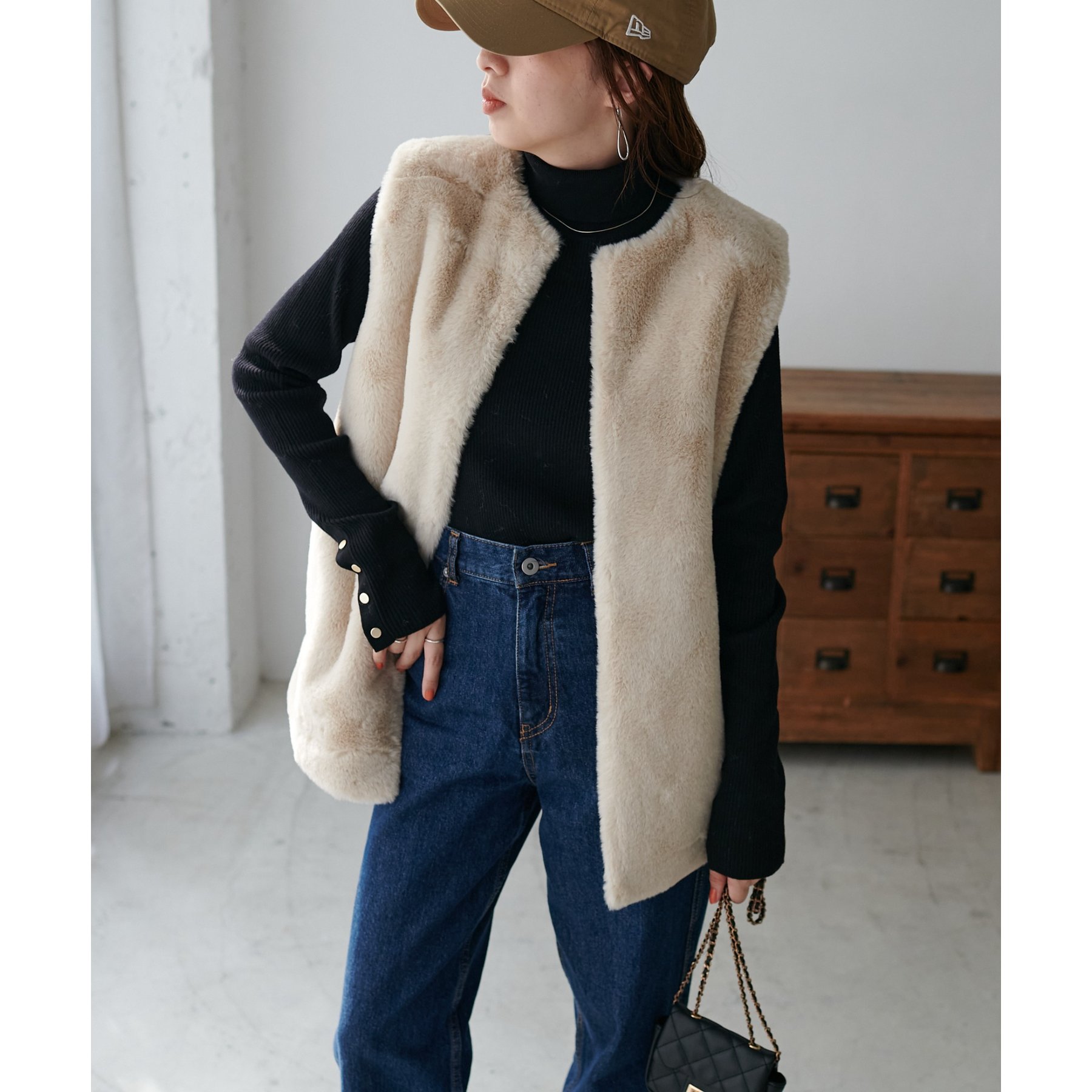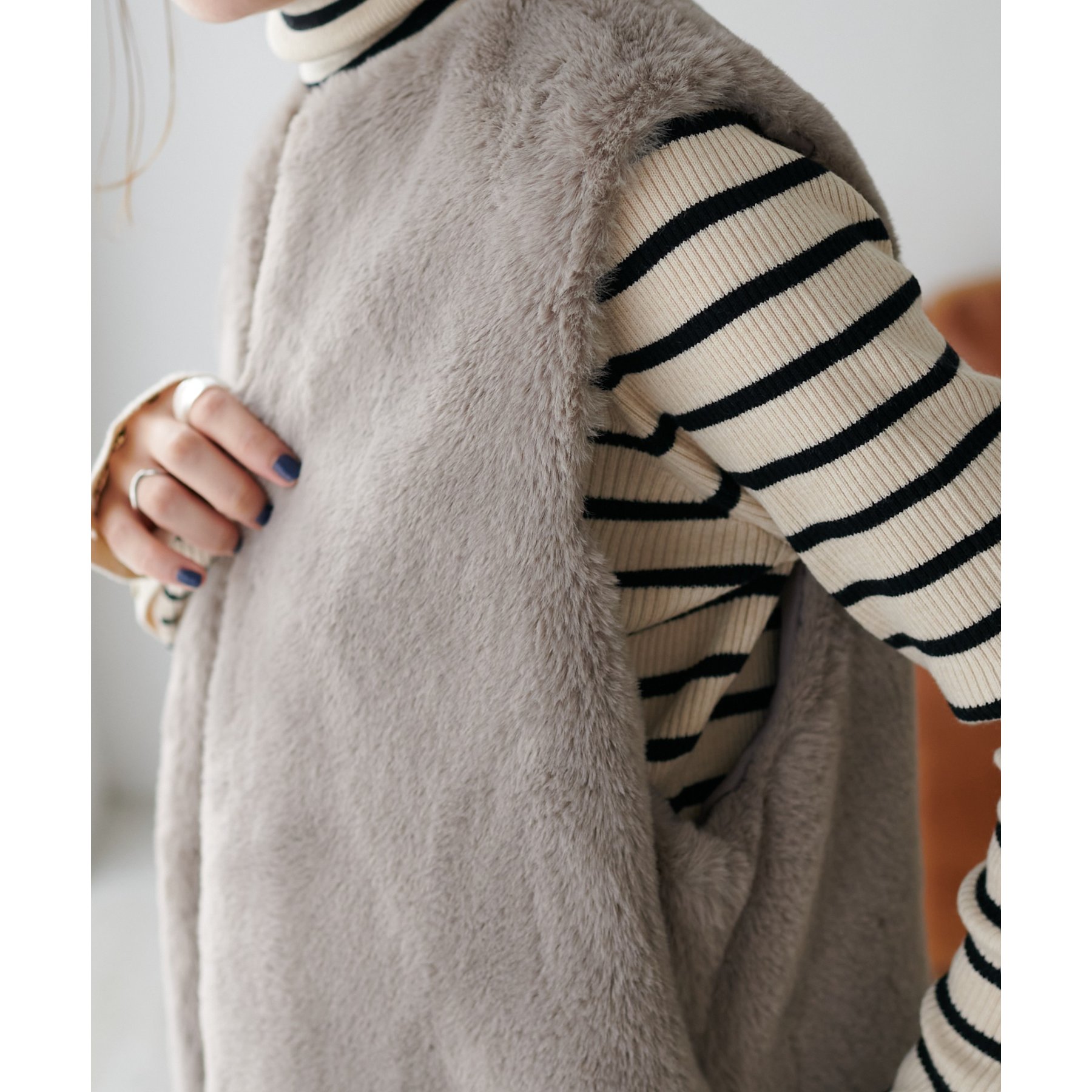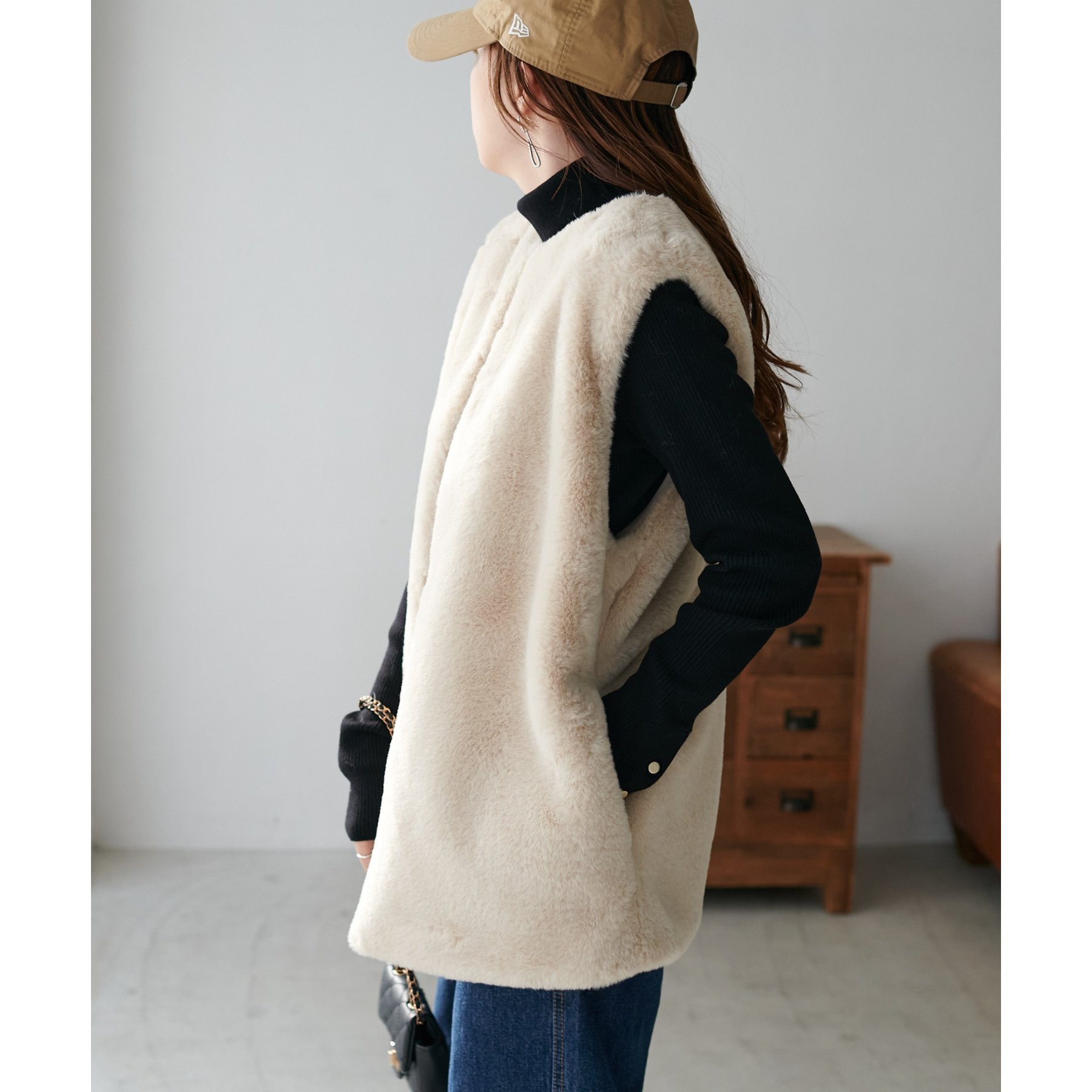トレンドのレイヤードスタイルが叶うフェイクファーベスト