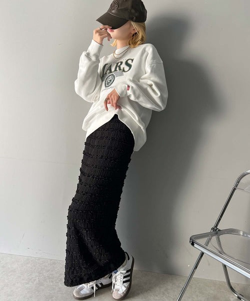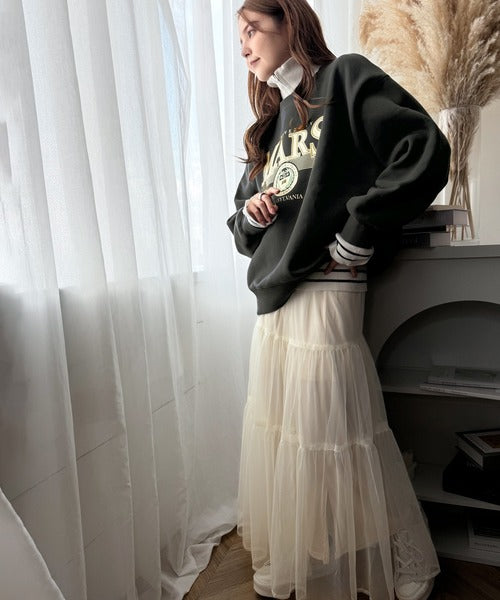ふんわりチュール素材のマキシ丈スカートに合わせたスタイルもおすすめです。