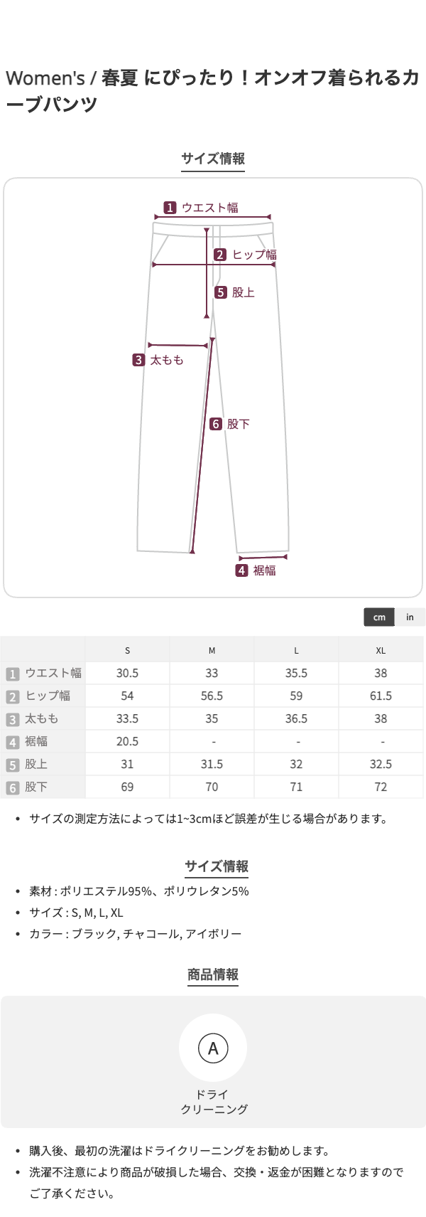 S:ウエスト61、ヒップ108、股上31、わたり幅33.5、裾幅20.5、股下69cm