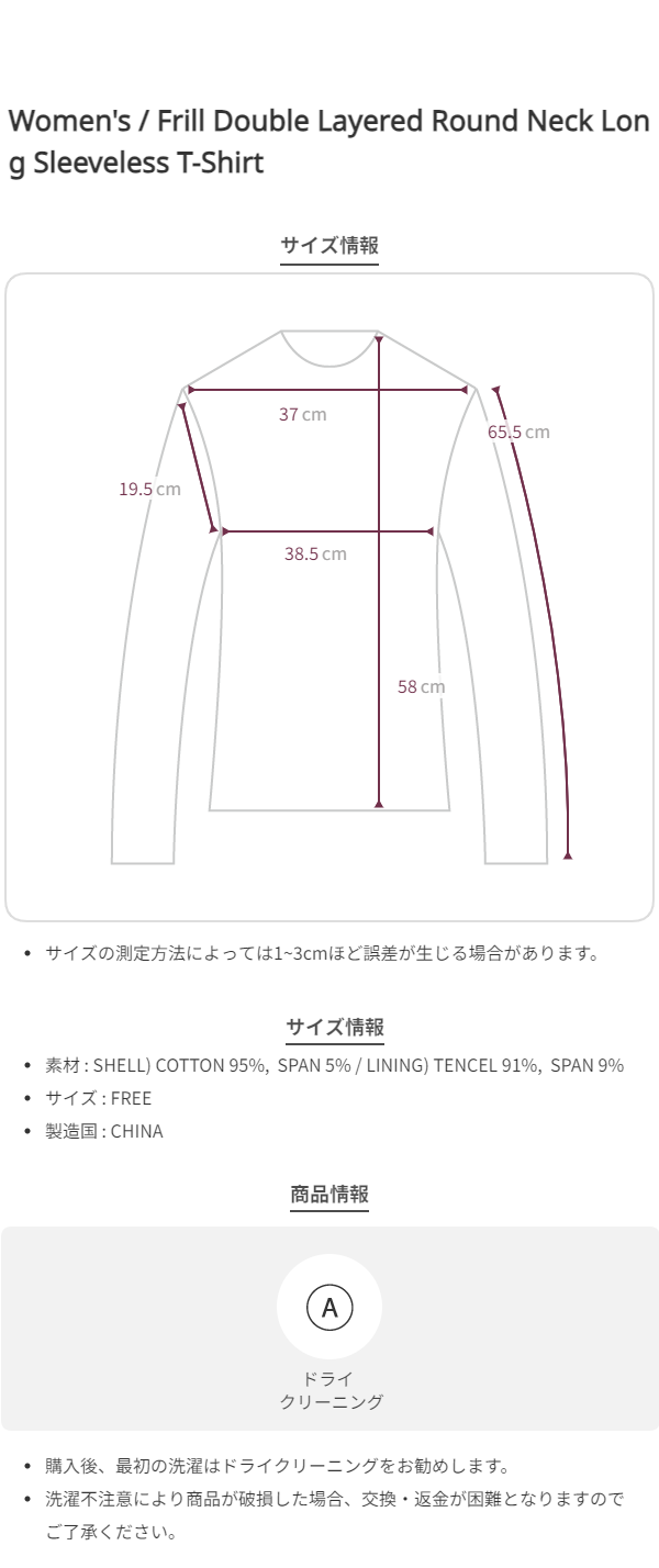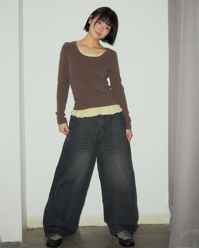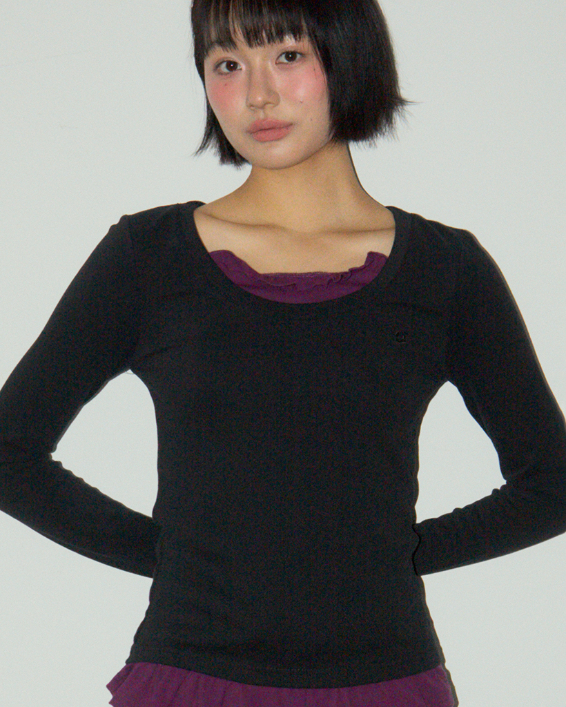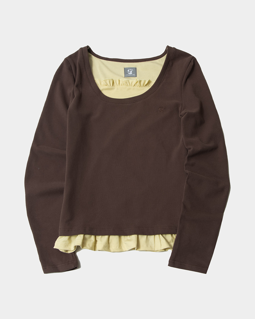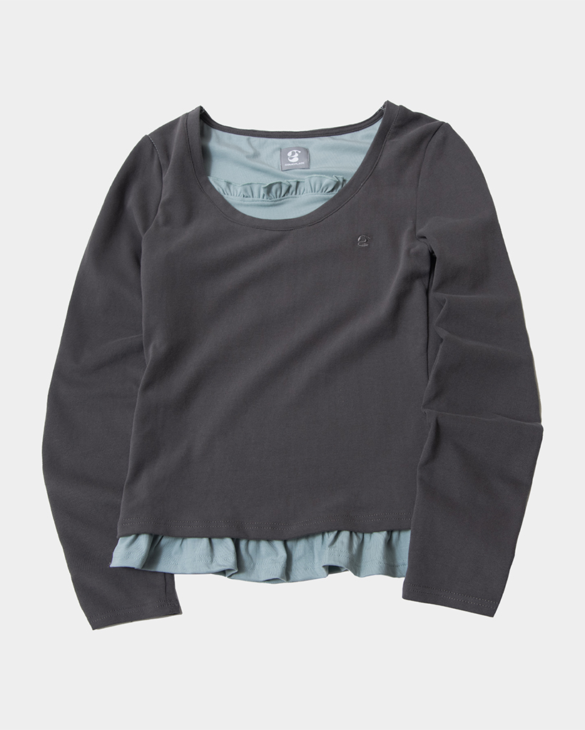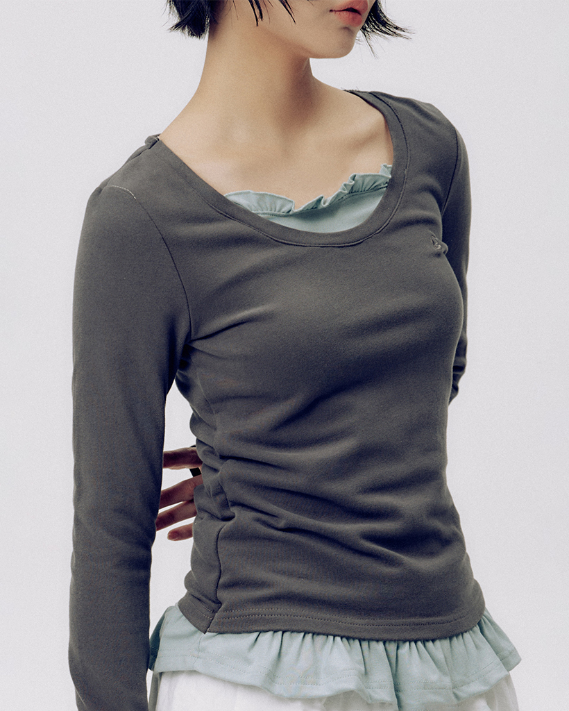フリルダブルレイヤードラウンドネックロングスリーブレスTシャツ_3COLOR