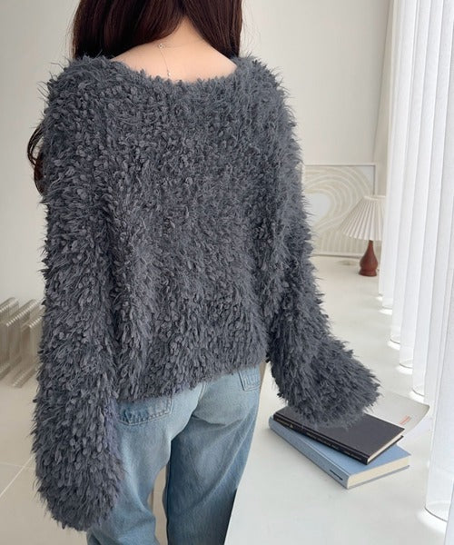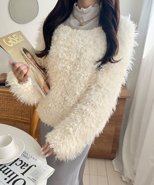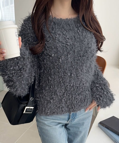ふんわりとした毛足のあるシャギーニット素材を使用しており、