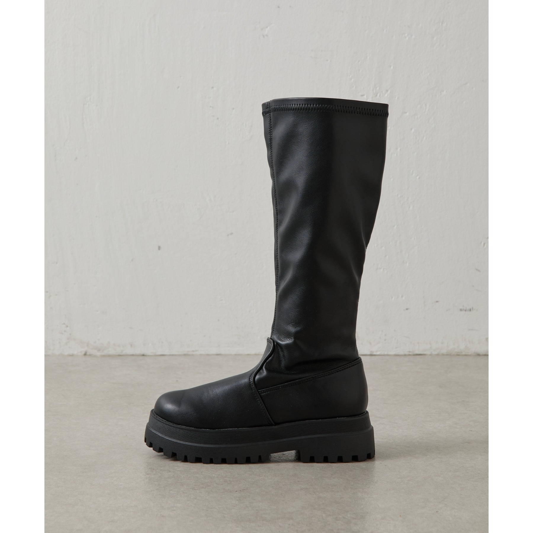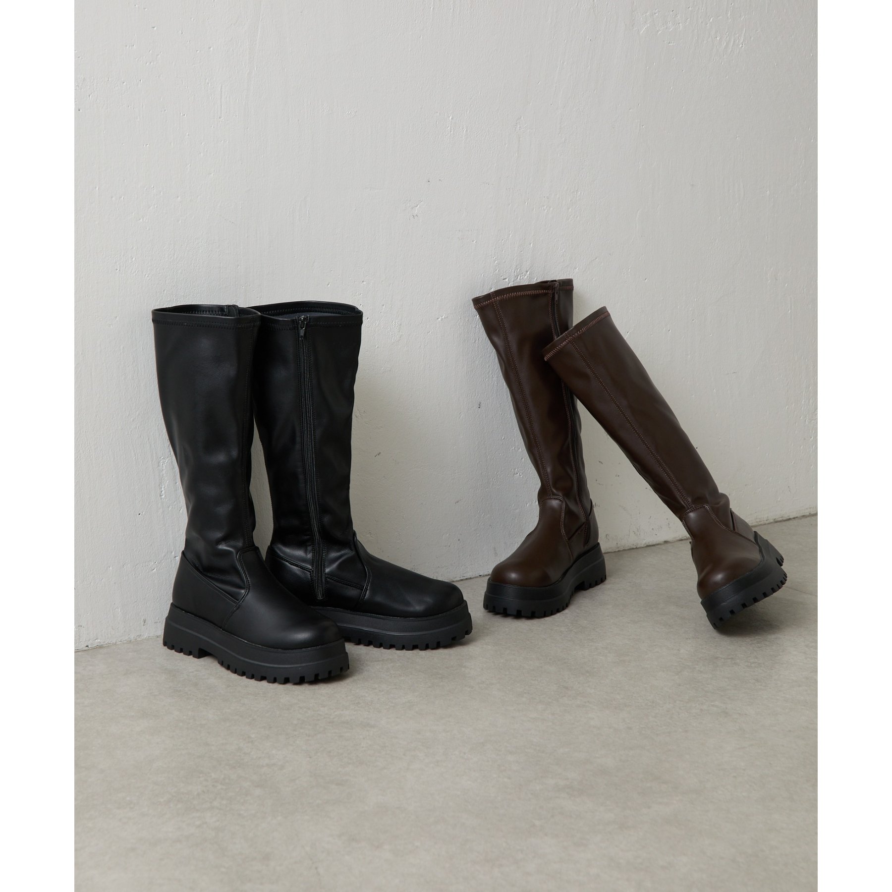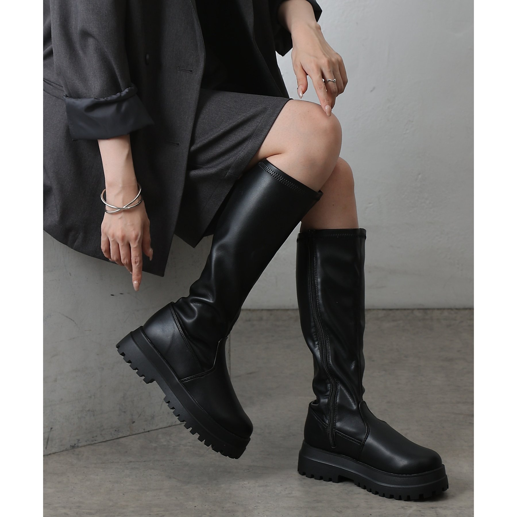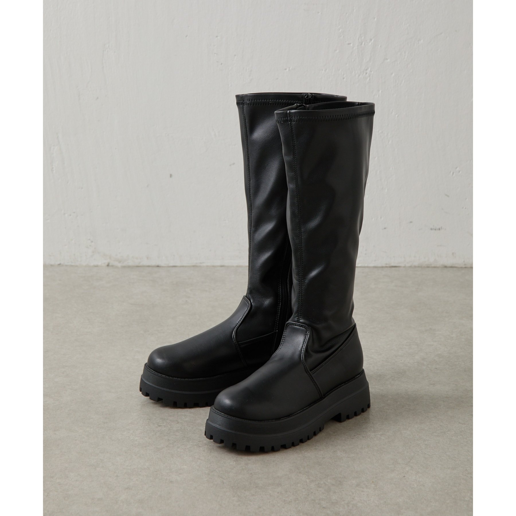 脚にぴったりフィットするストレッチ素材と、スタイルアップを叶える厚底ソールがポイントの厚底ストレッチブーツです。