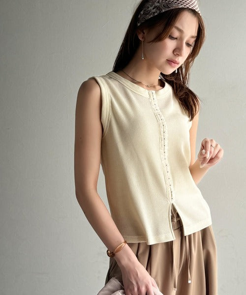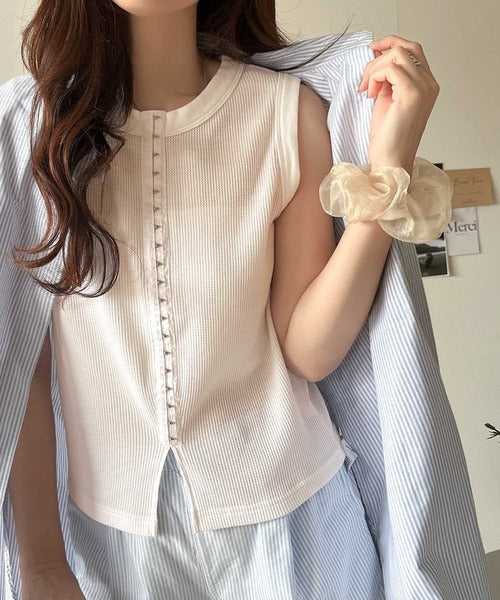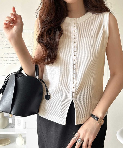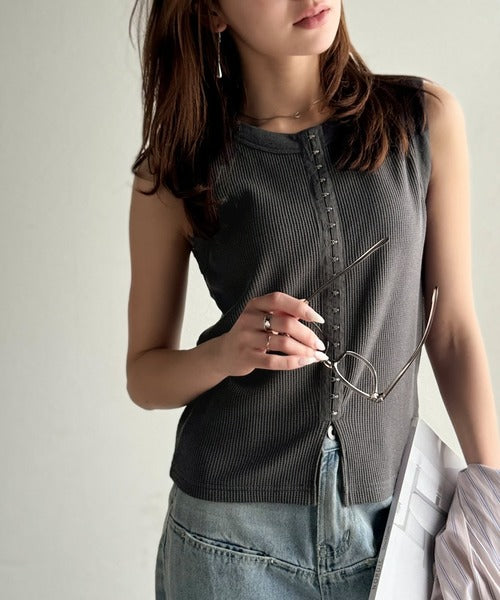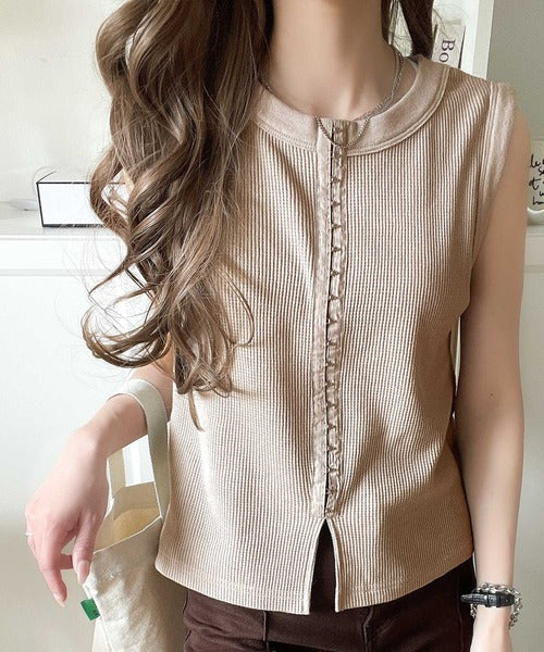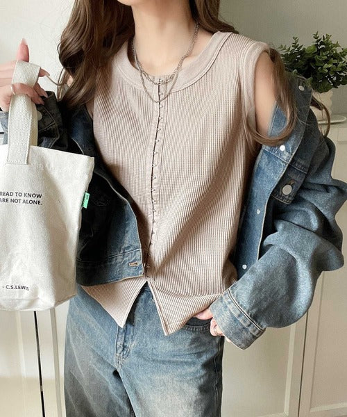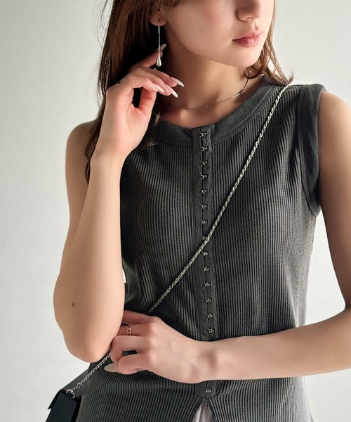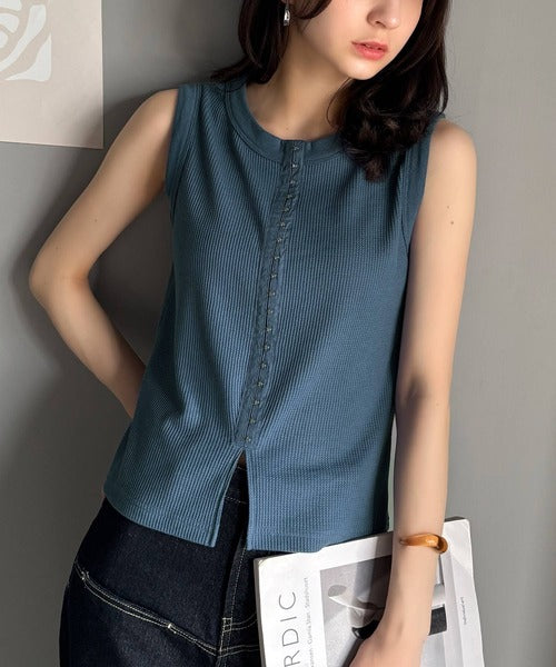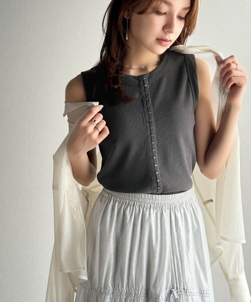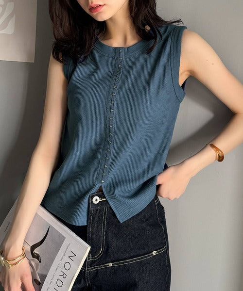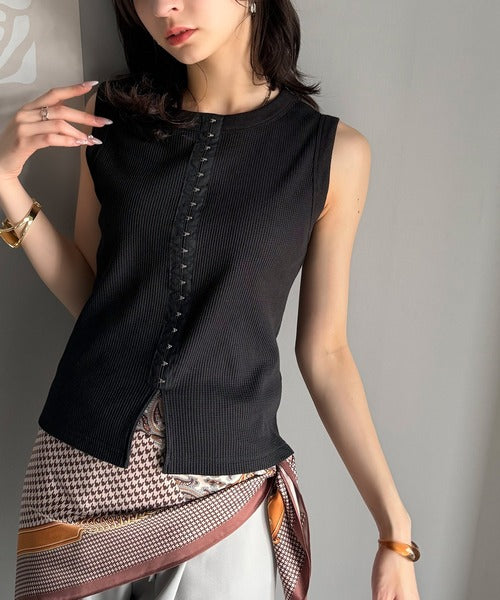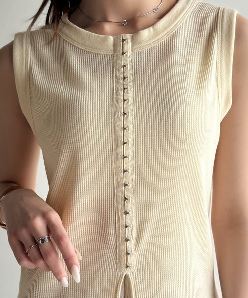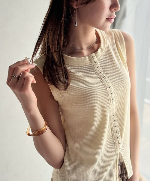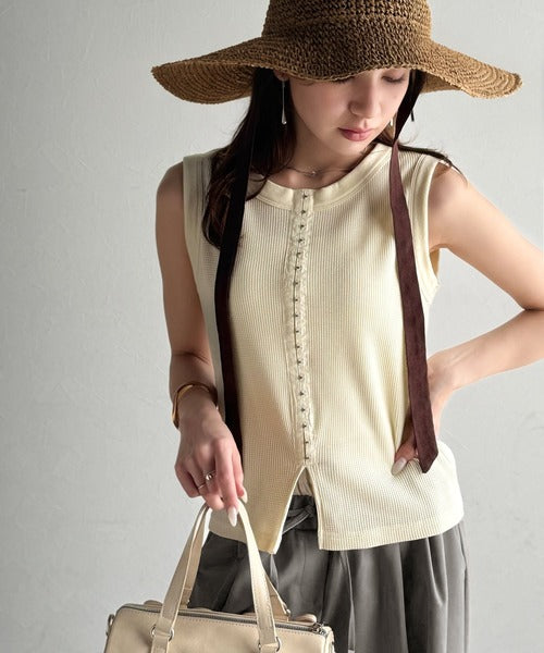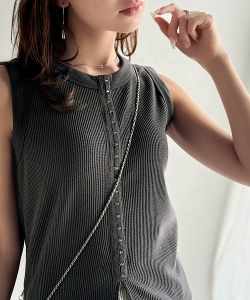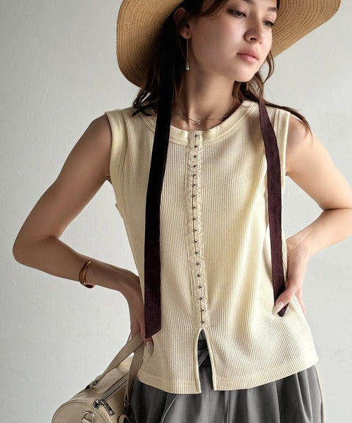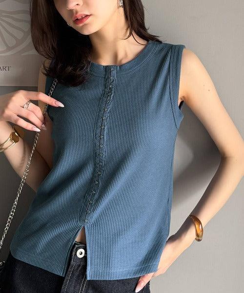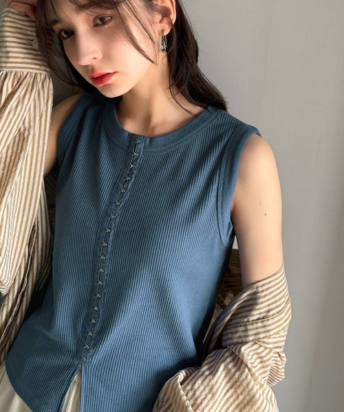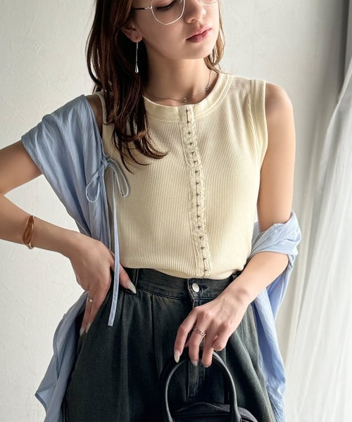 軽やかに魅せる、今どきカジュアルの主役。フロントホックワッフルノースリーブトップス ce1020240