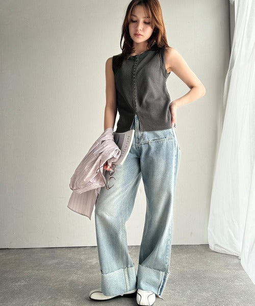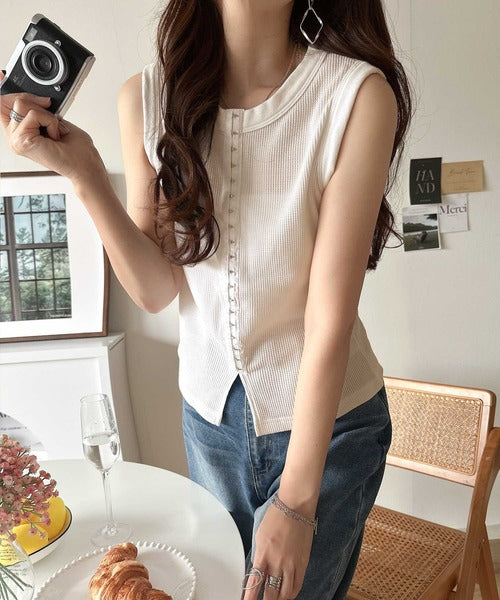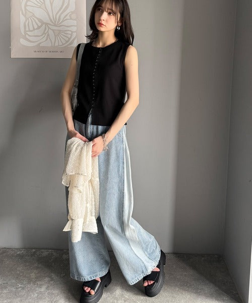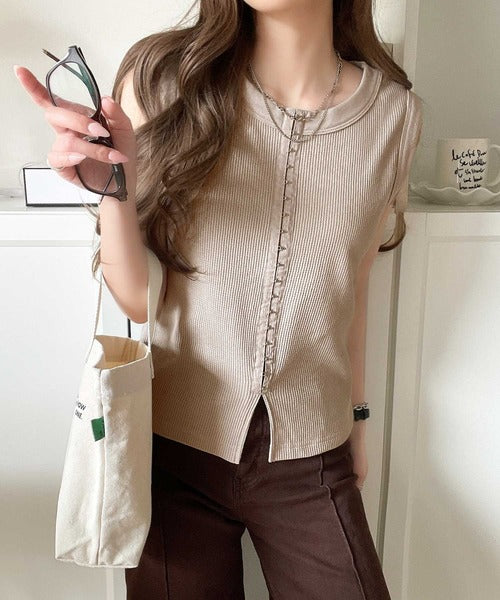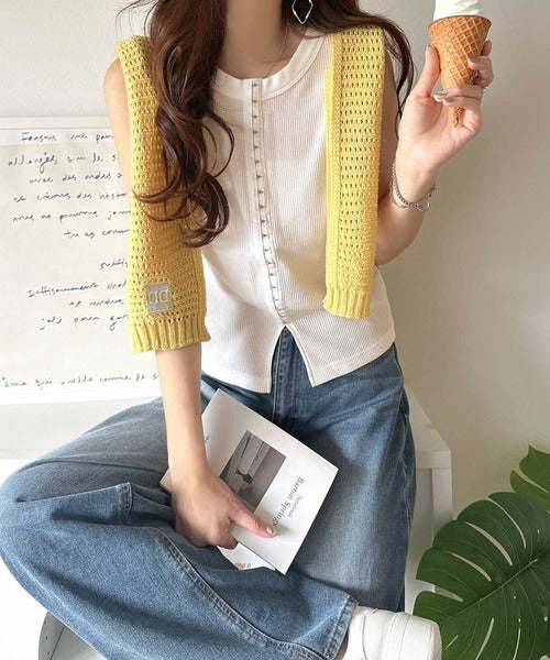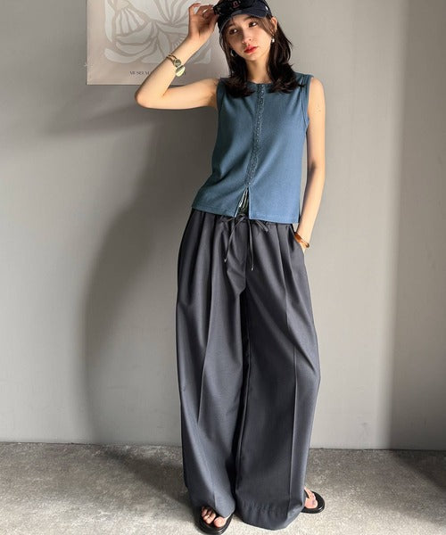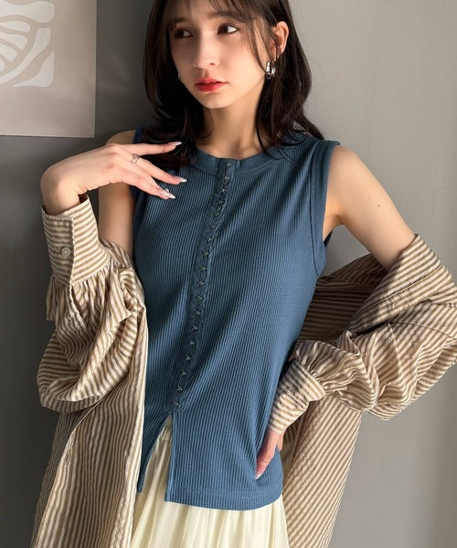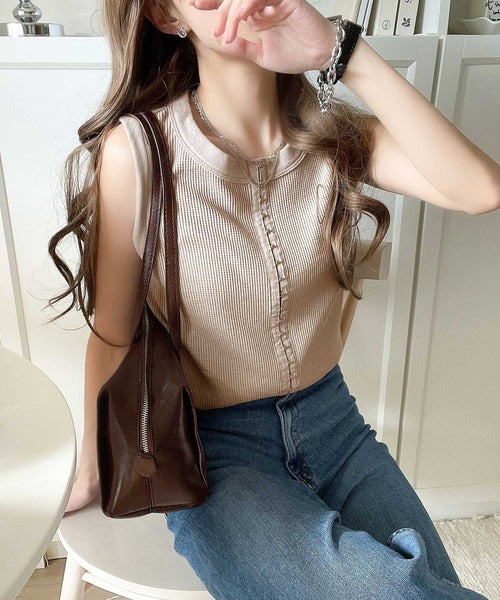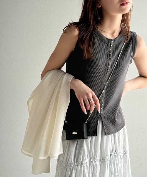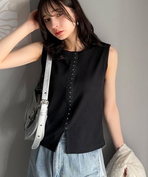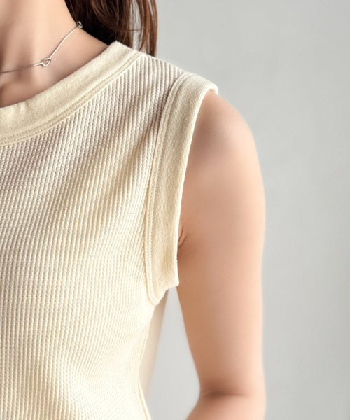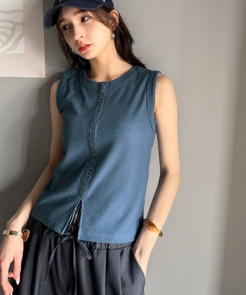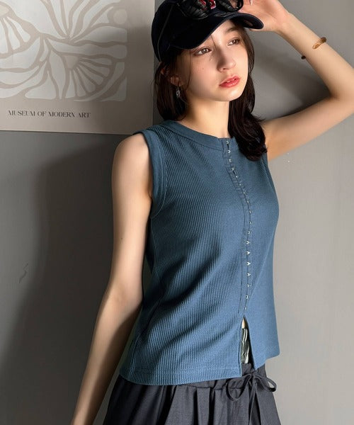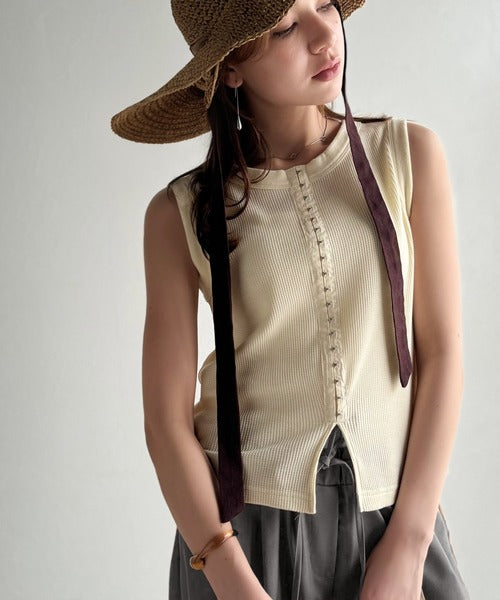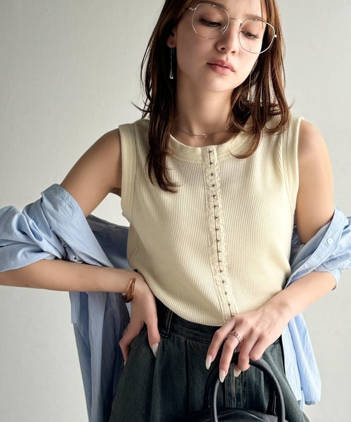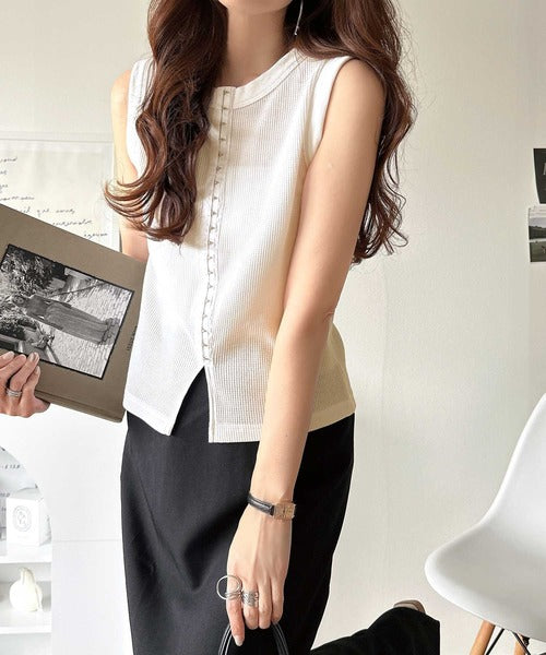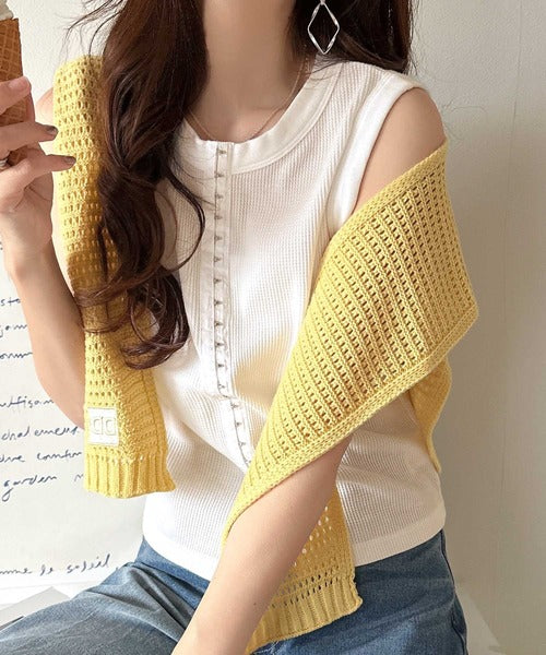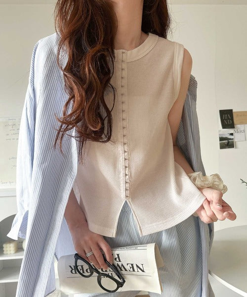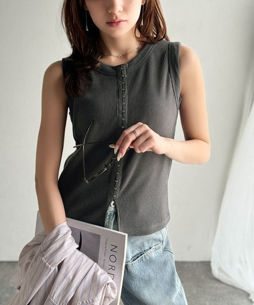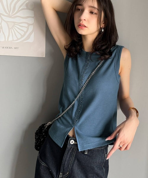 軽やかに魅せる、今どきカジュアルの主役。フロントホックワッフルノースリーブトップス ce1020240