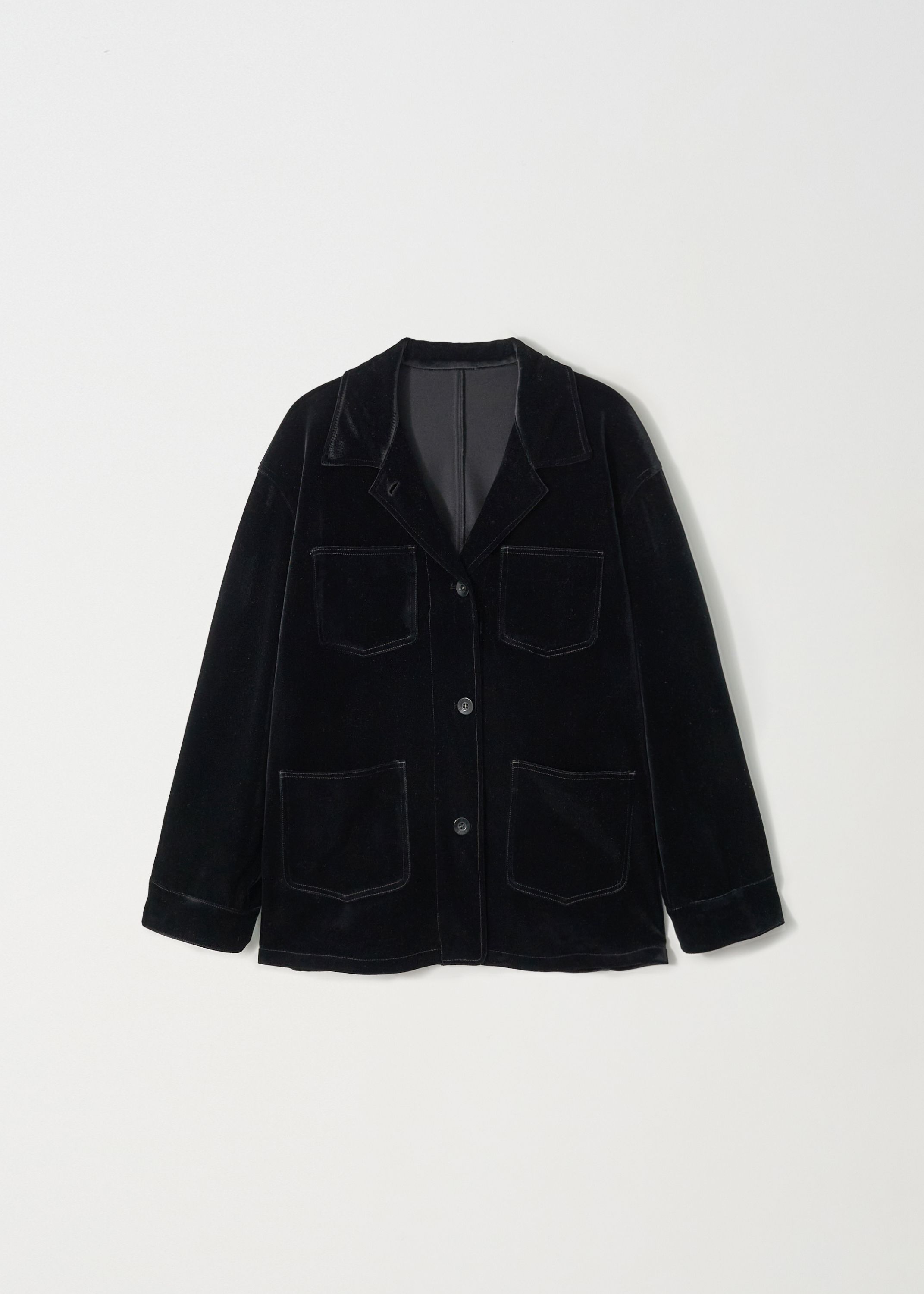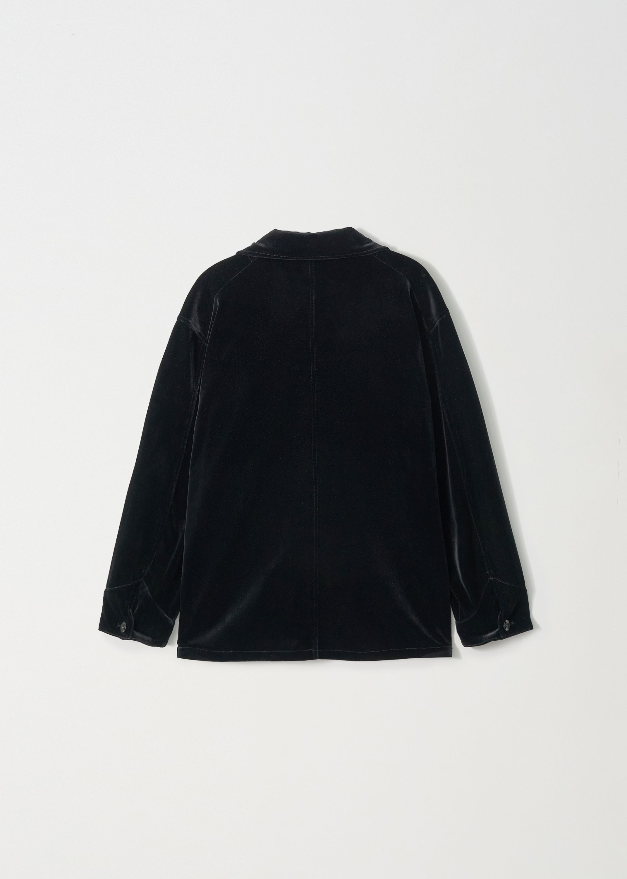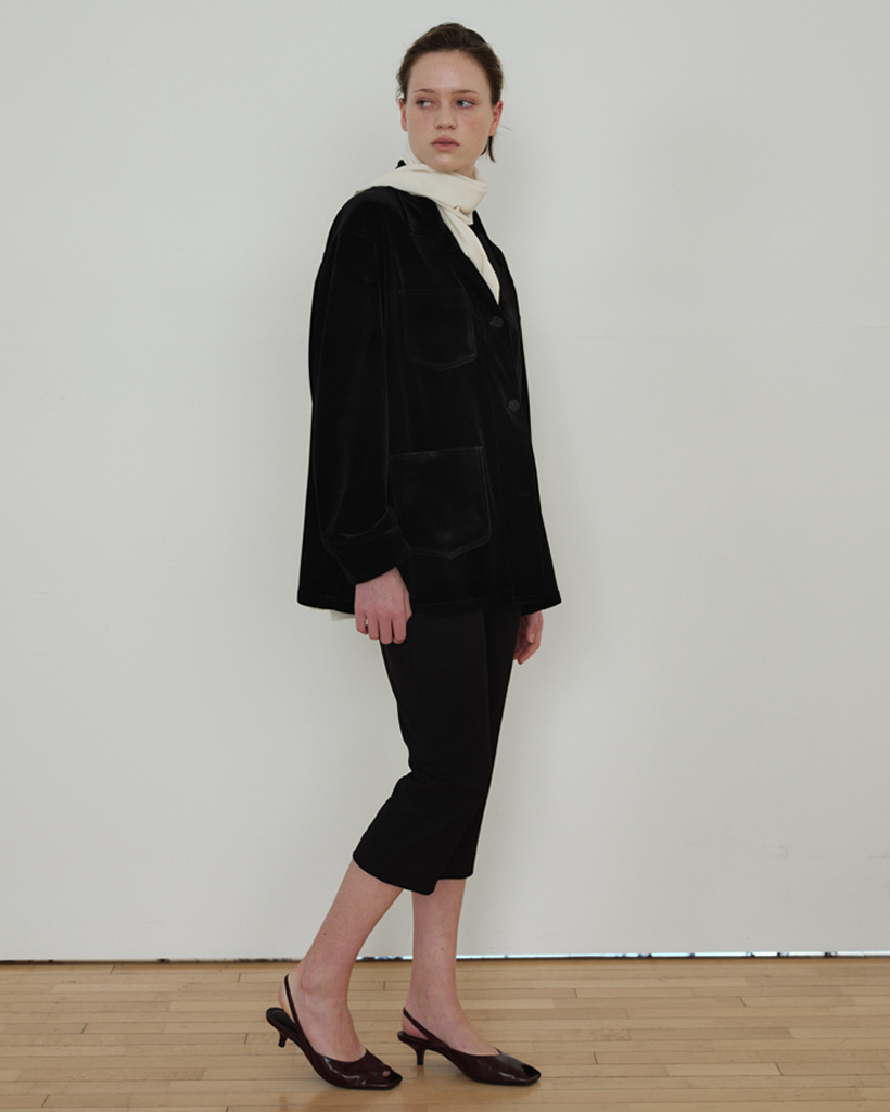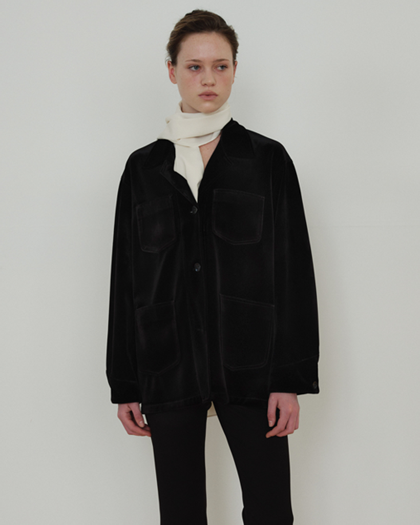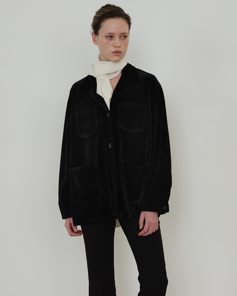 上品な光沢としなやかなテクスチャーが特徴の日本製ベルベット生地で仕立てたオーバーフィットジャケットです。保温性とやわらかなタッチを兼ね備え、単体のアウターとしてはもちろん、シャツジャケットのようにも活用できる厚みで、季節の変わり目に適したアイテムです。