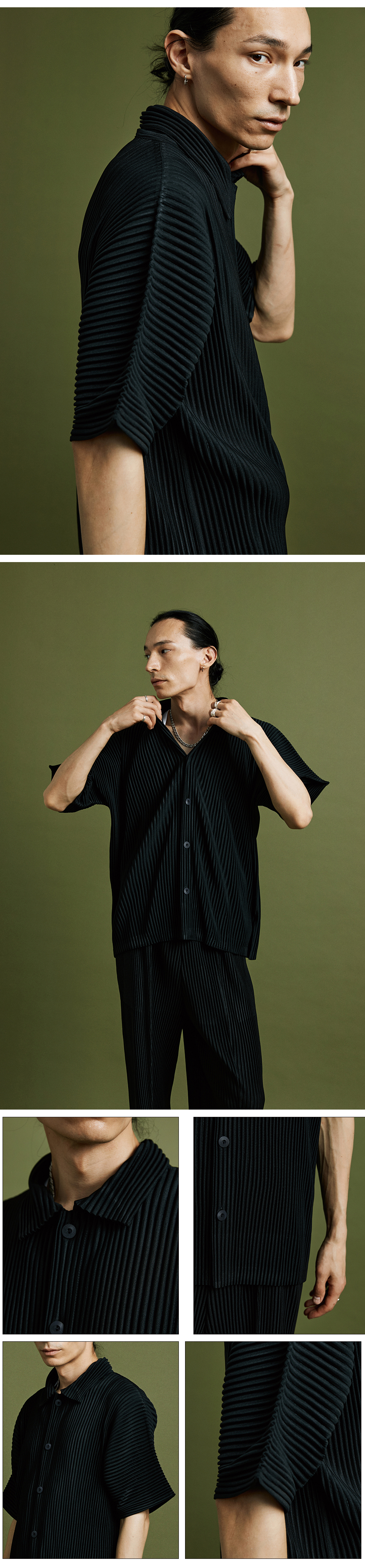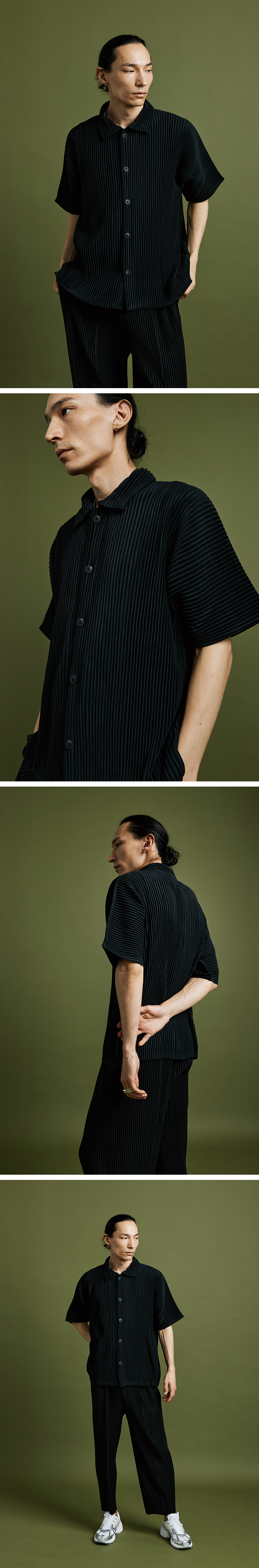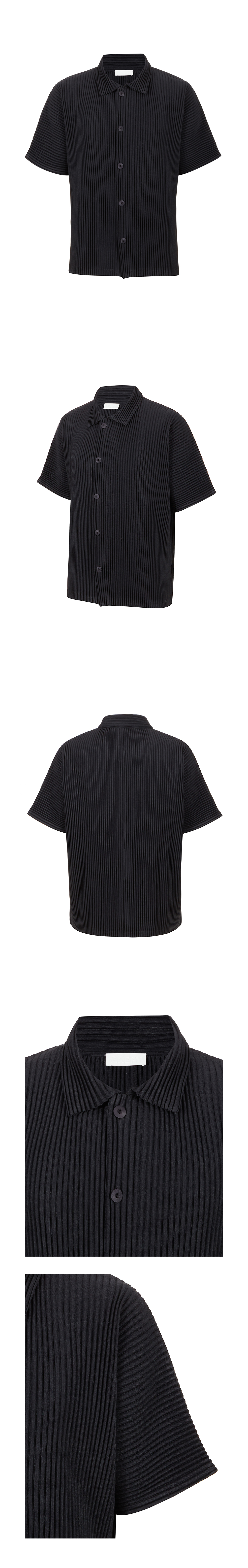 PS05X Pleated Button Short Sleeve Collar Open T-shirt [Black]