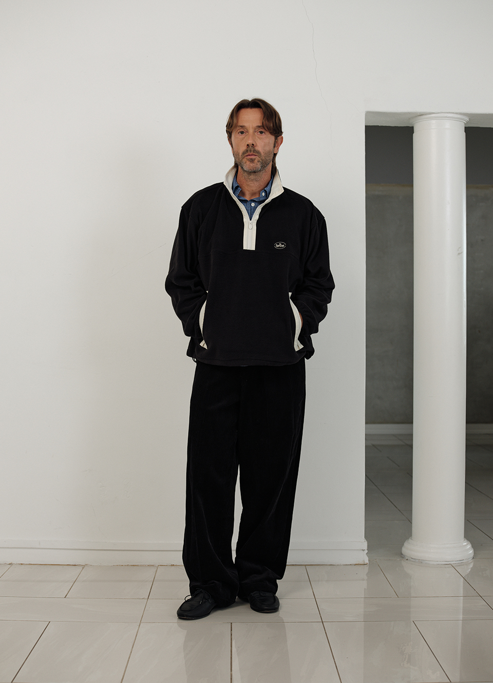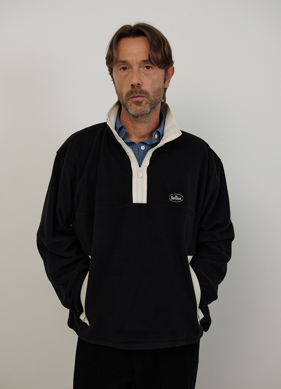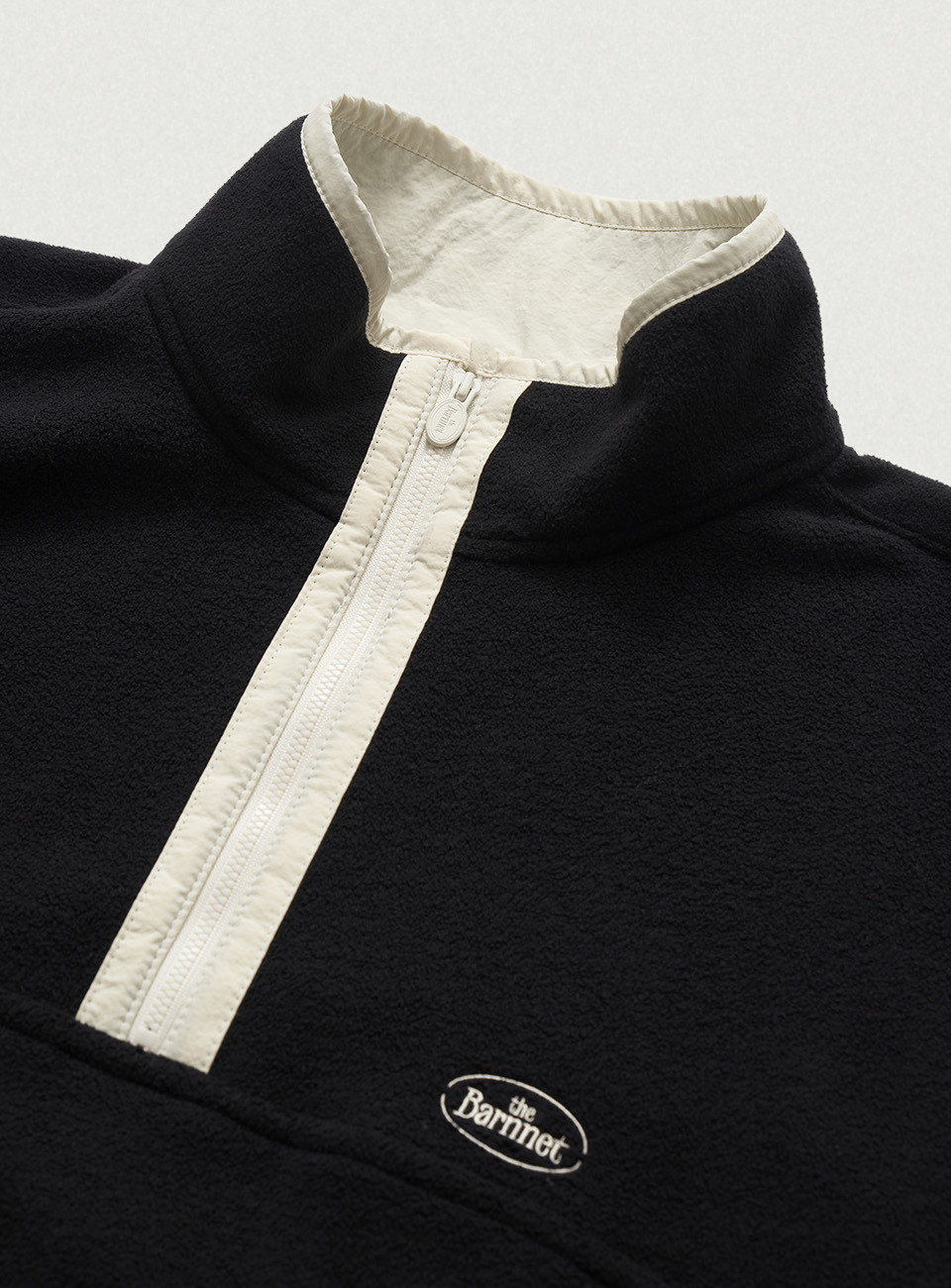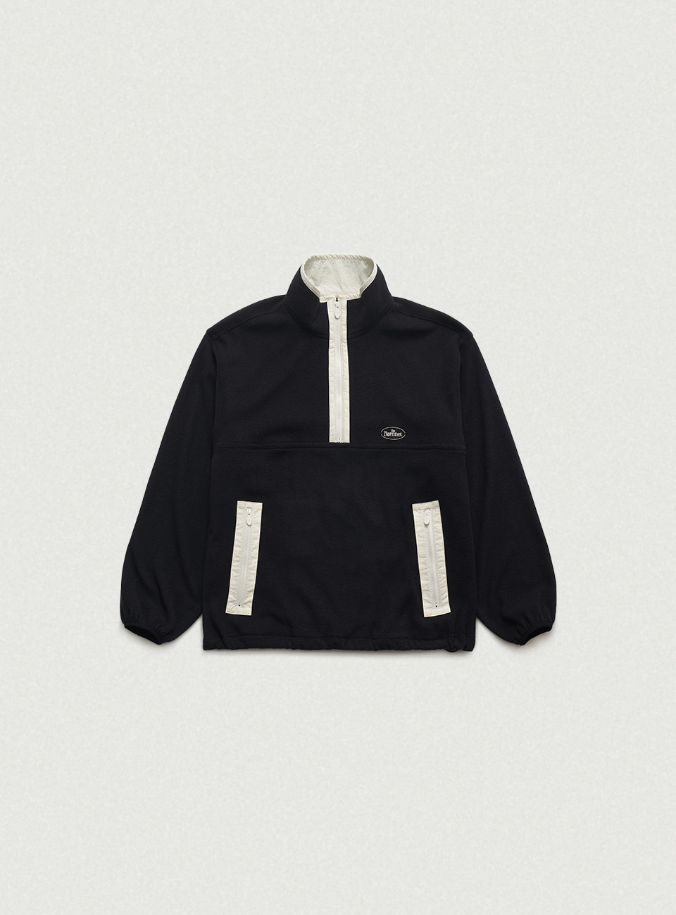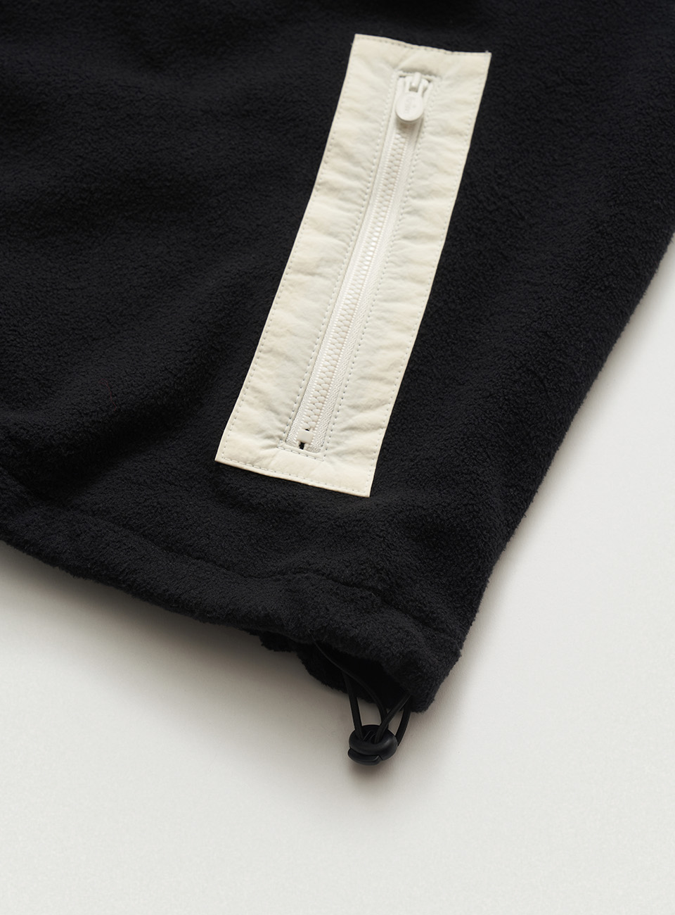 ハーフジップ、両袖口のバンディング、サイド配色ジッパーポケットなどの実用的なディテール