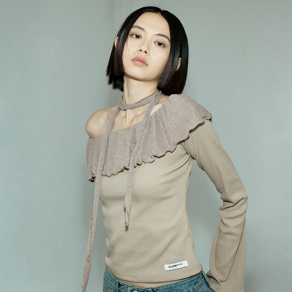 C FRILL OFF SHOULDER LONG SLEEVE T-SHIRT_BEIGE