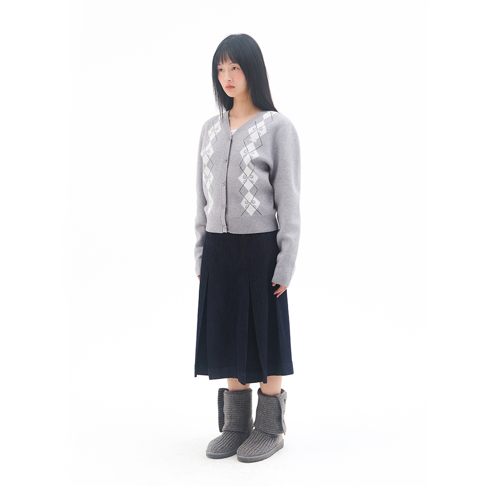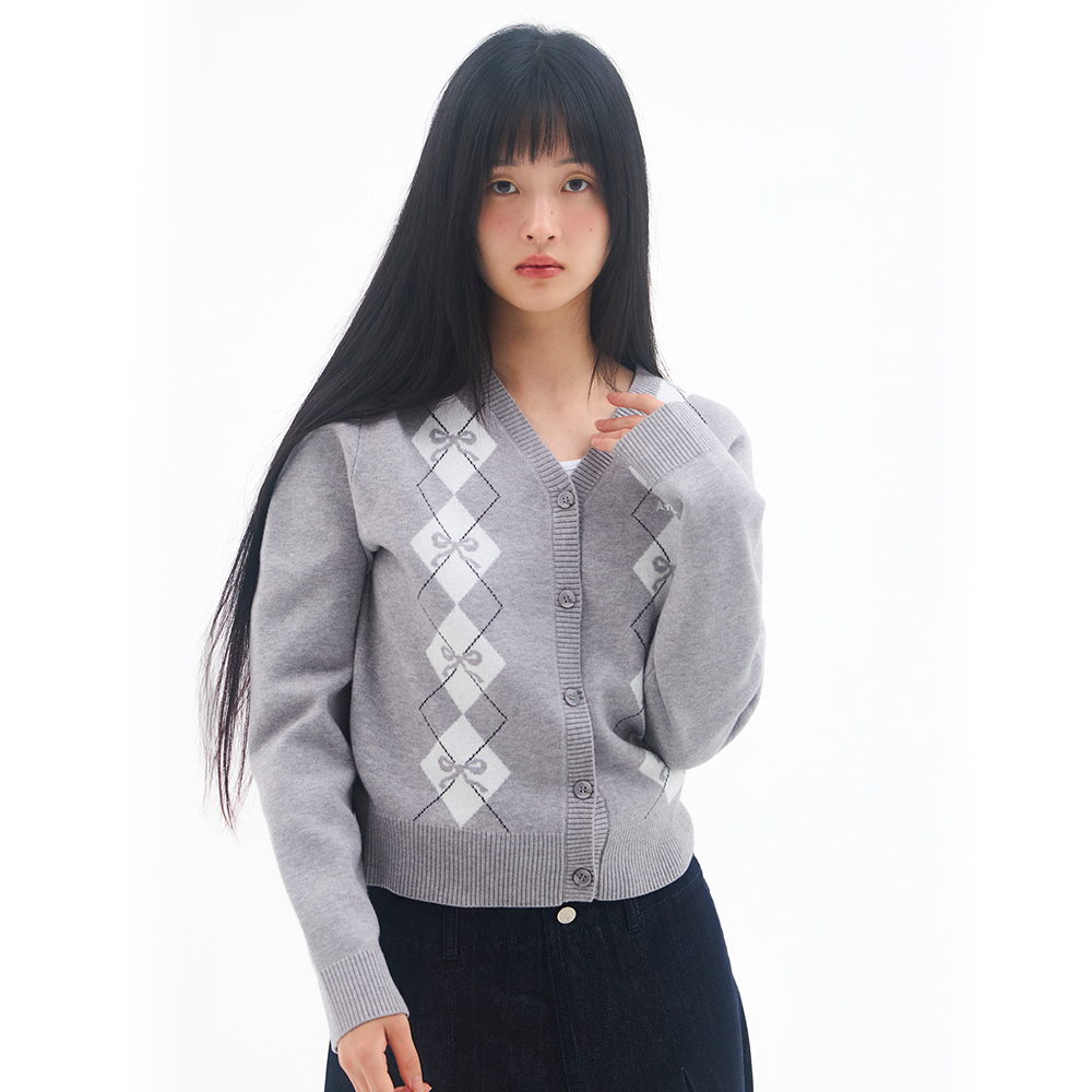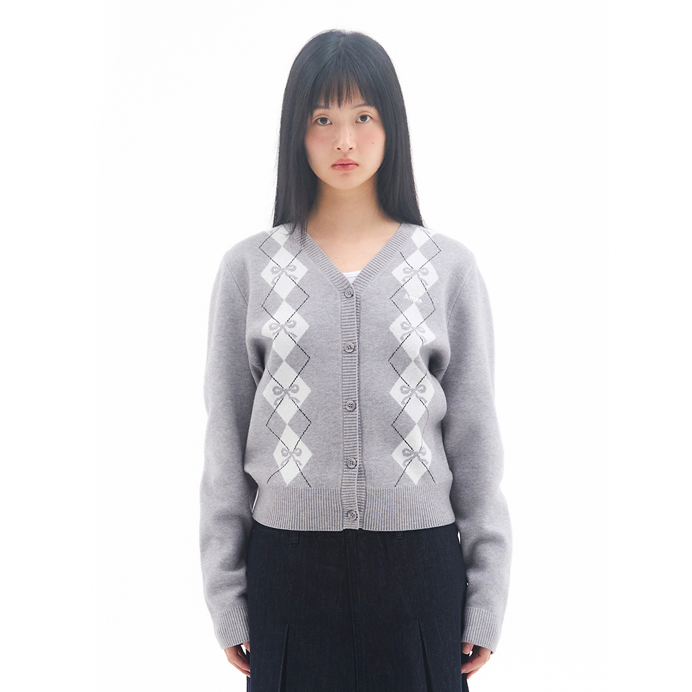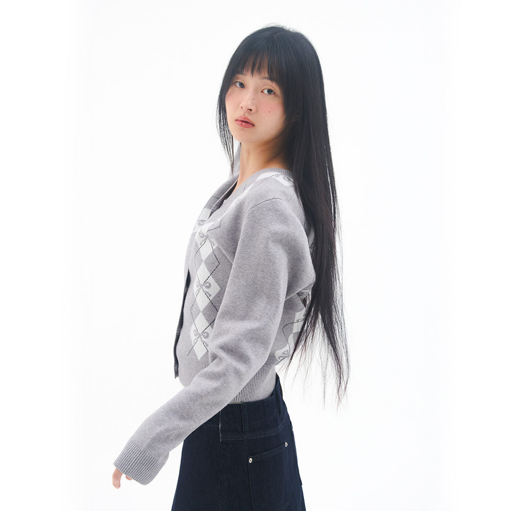 CROP V NECK ARGYLE CARDIGAN GREY