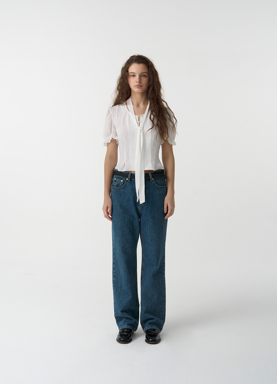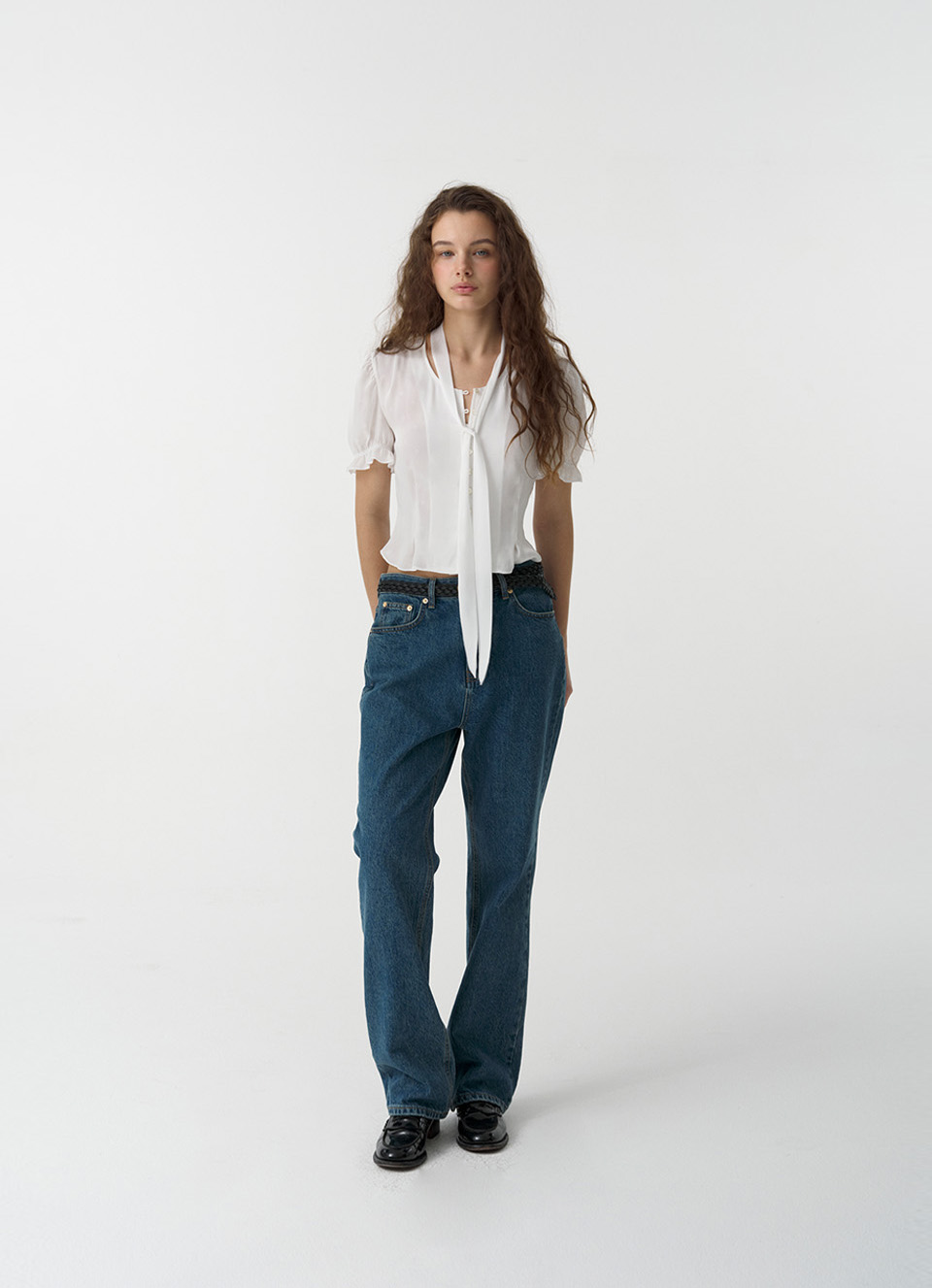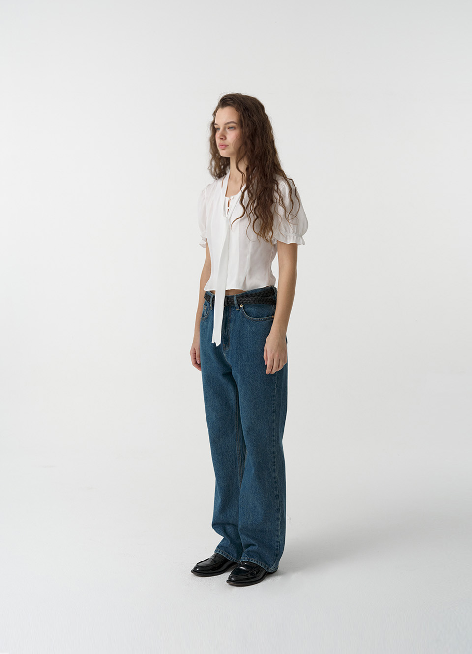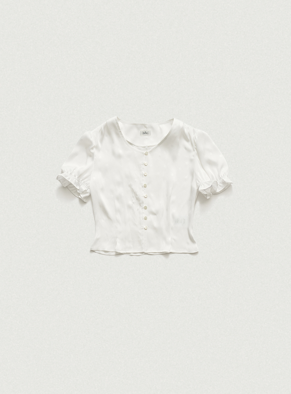 パフシャーリングとスリムなフィット感を演出するウエストラインが特徴のフェミニンなブラウスタイプ。