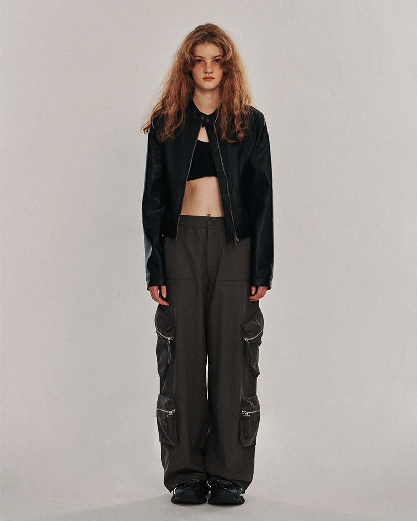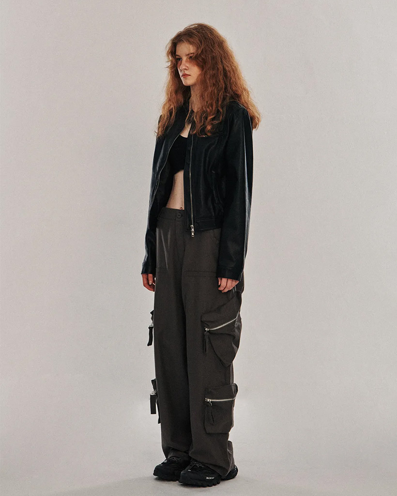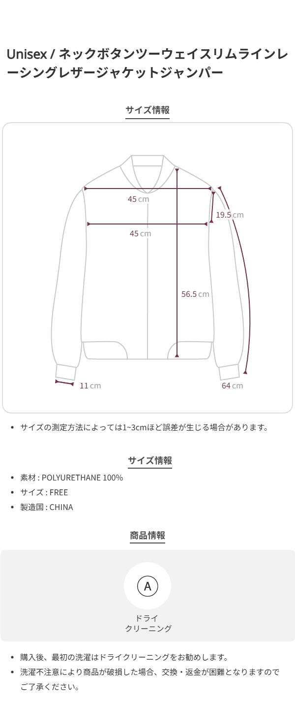 ネックボタンツーウェイスリムラインレーシングレザージャケットジャンパー
