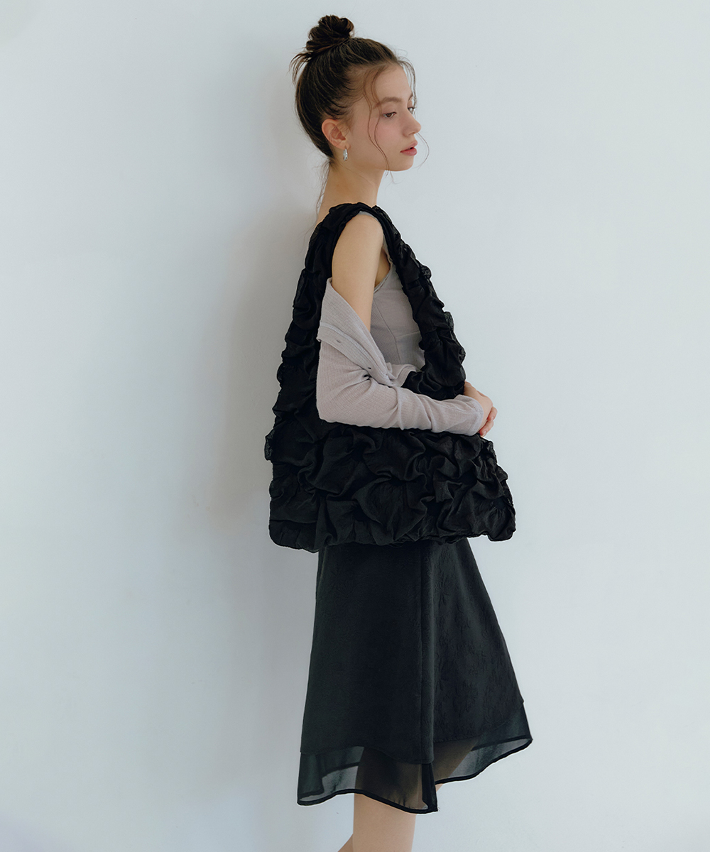 軽量感にしっかりとした耐久性を持つ生地使用で、シルエットに合わせて自然に落ちて見えず、快適で軽い着心地が特徴です。ユニークなフラワーガードパターンポイントでレイヤードや単独で様々な活用が可能です。裾シフォンレイヤードを加え、ヴィンテージムードで様々な活用が可能です。オビ部分に丸みを帯びたペンダント飾りを加え、クオリティーに仕上げました。