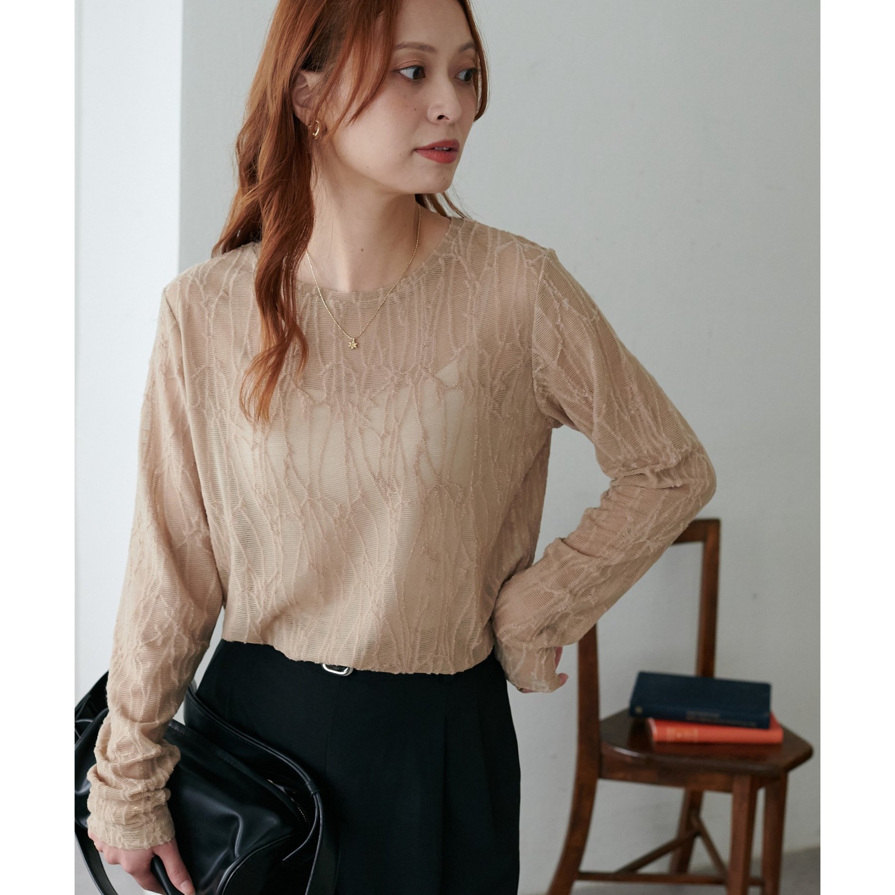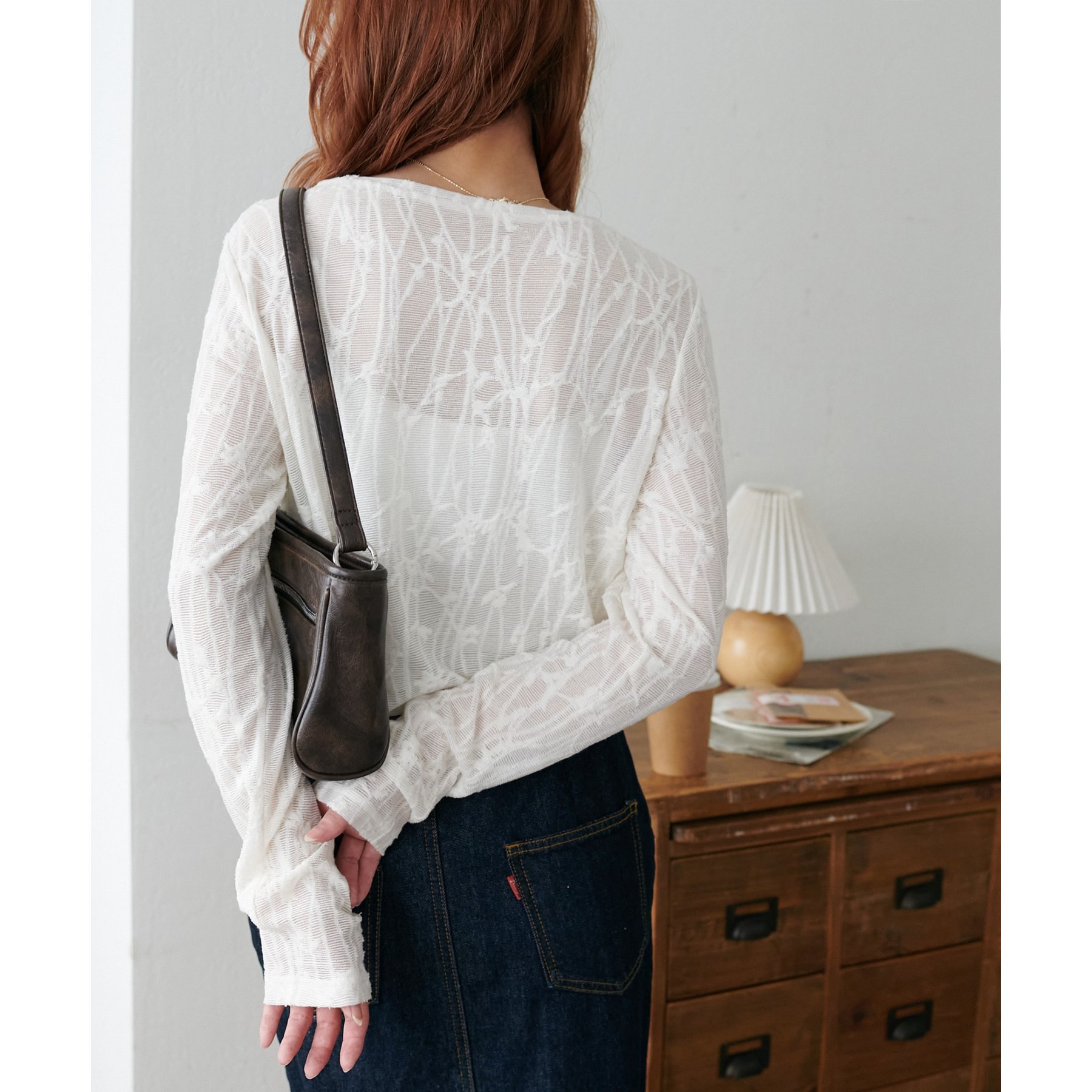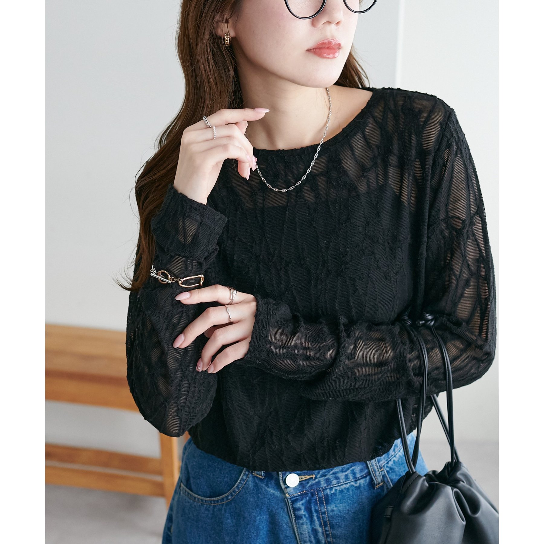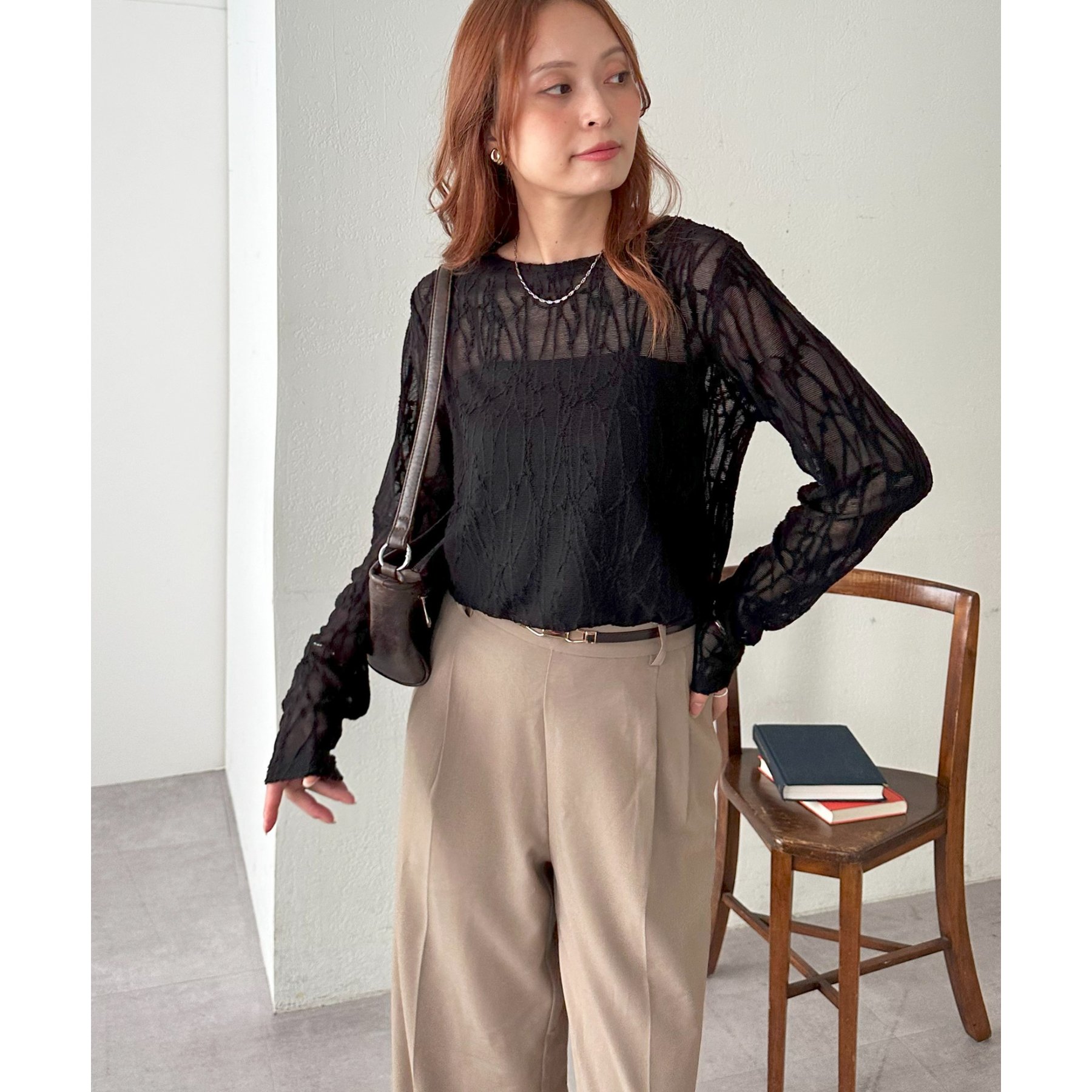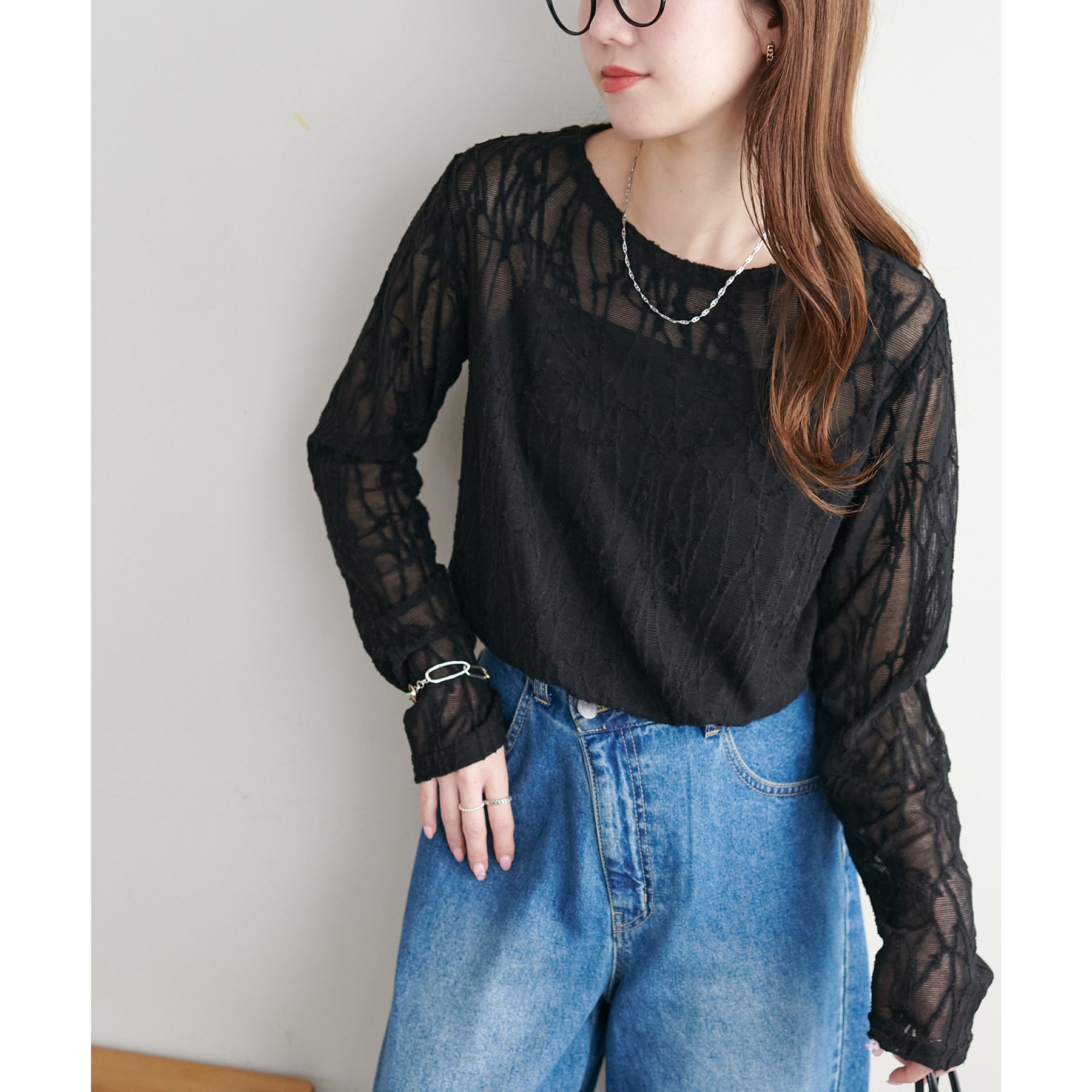 153cmスタッフ:程よい透け感があるので、夏から秋に変わっていくタイミングにぴったりのトップスです〇