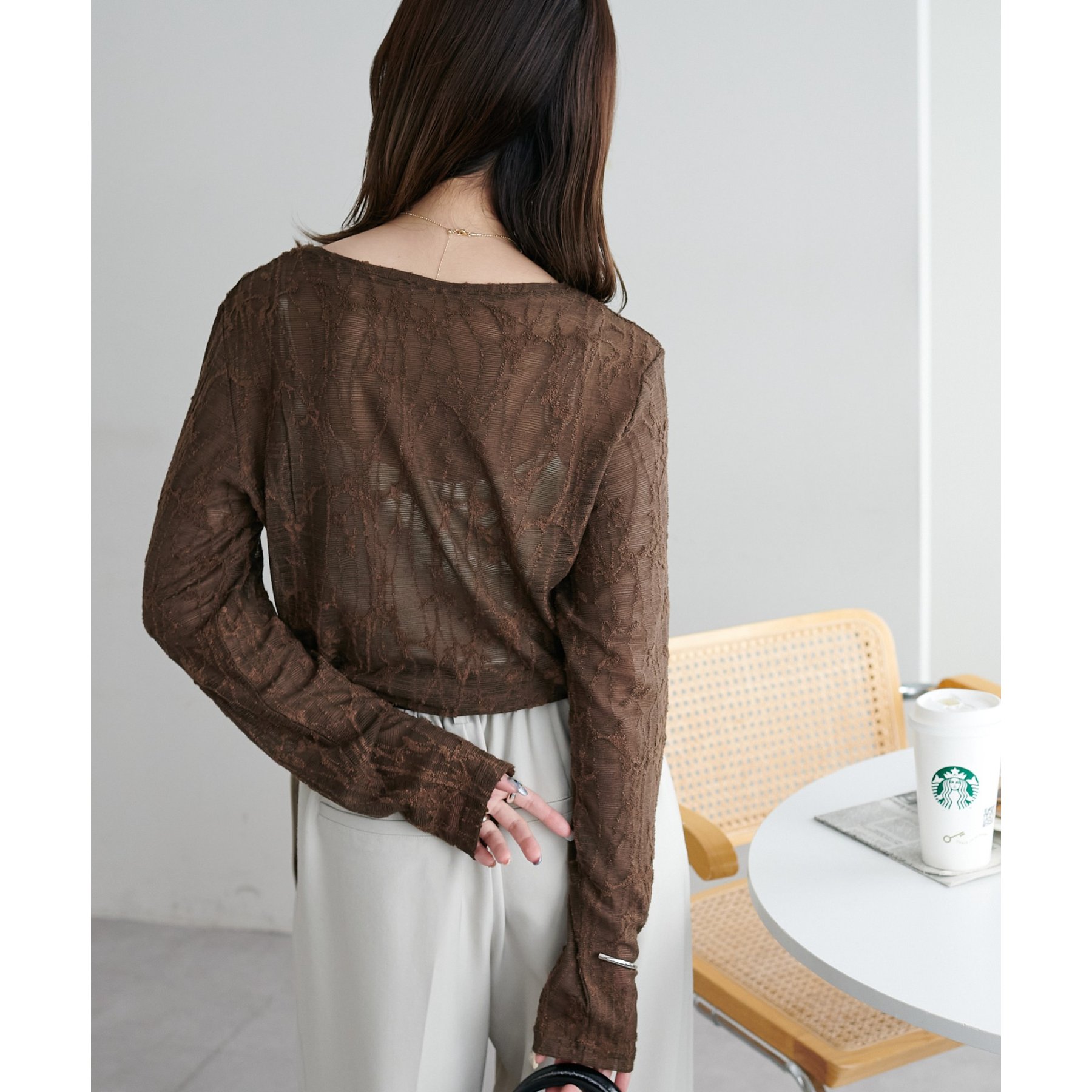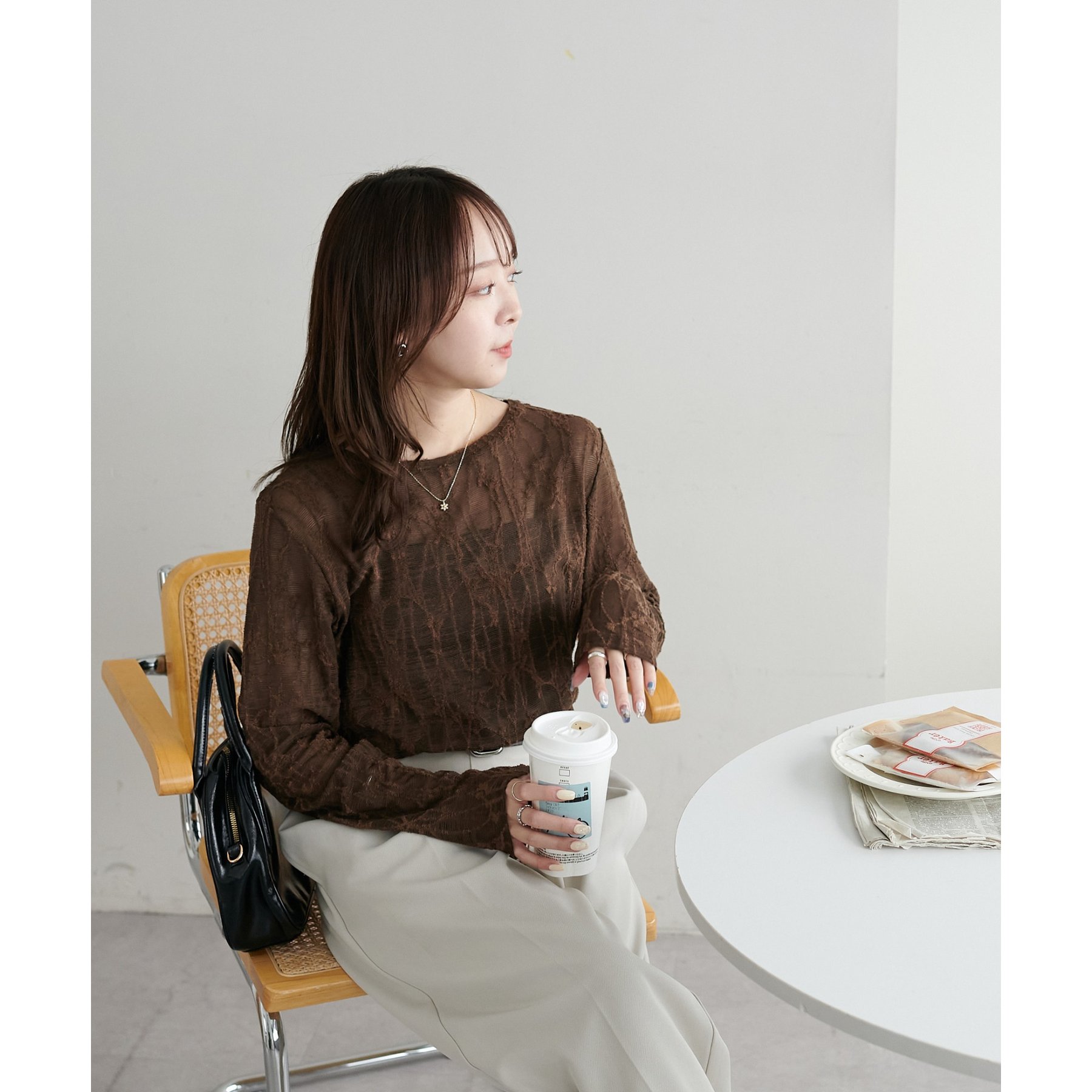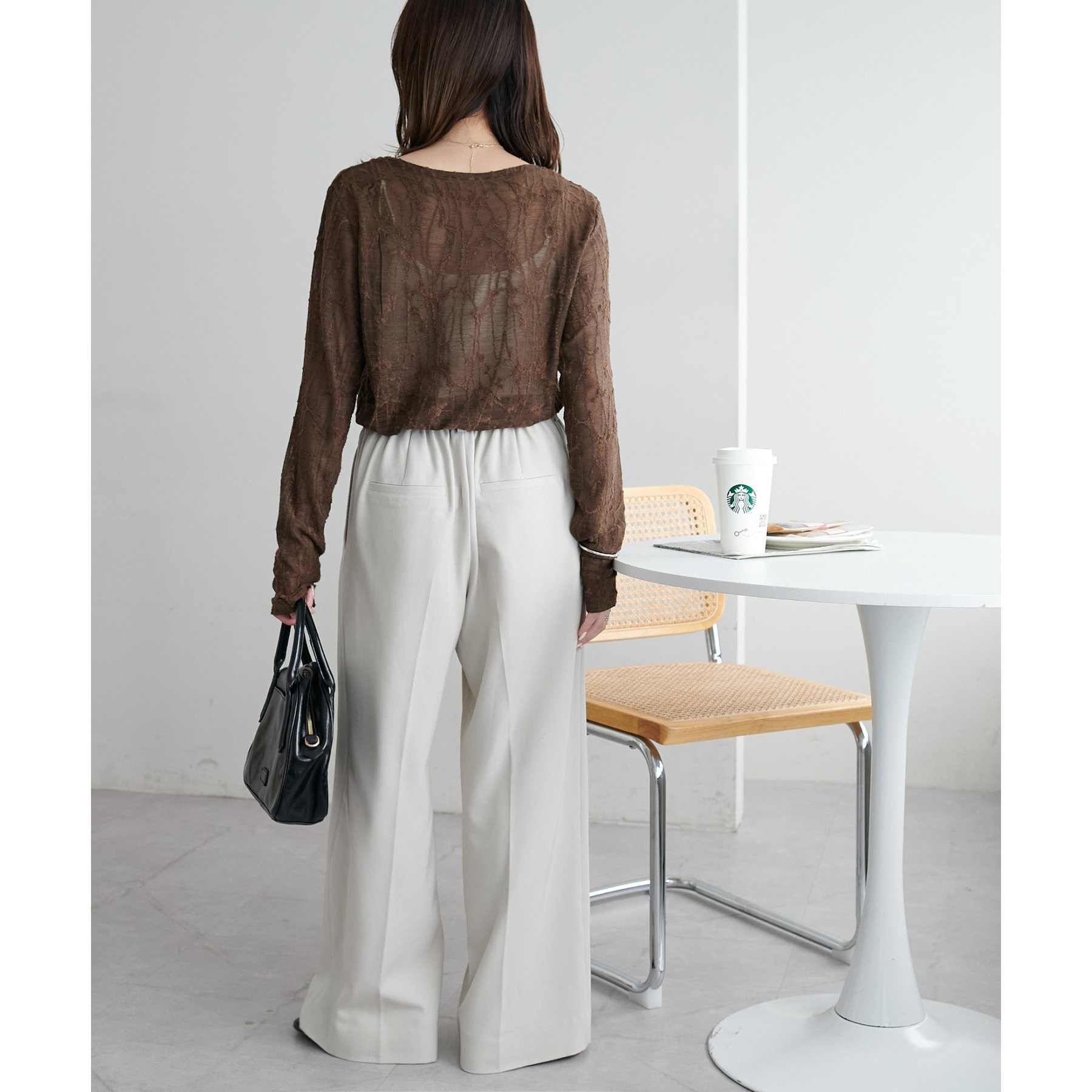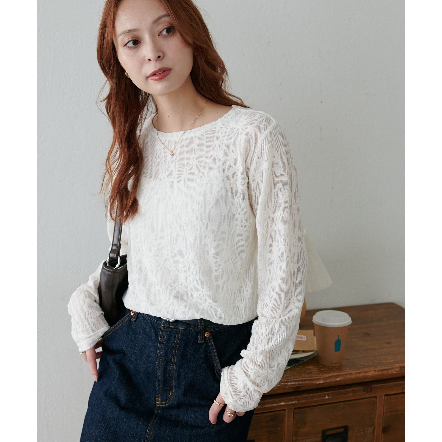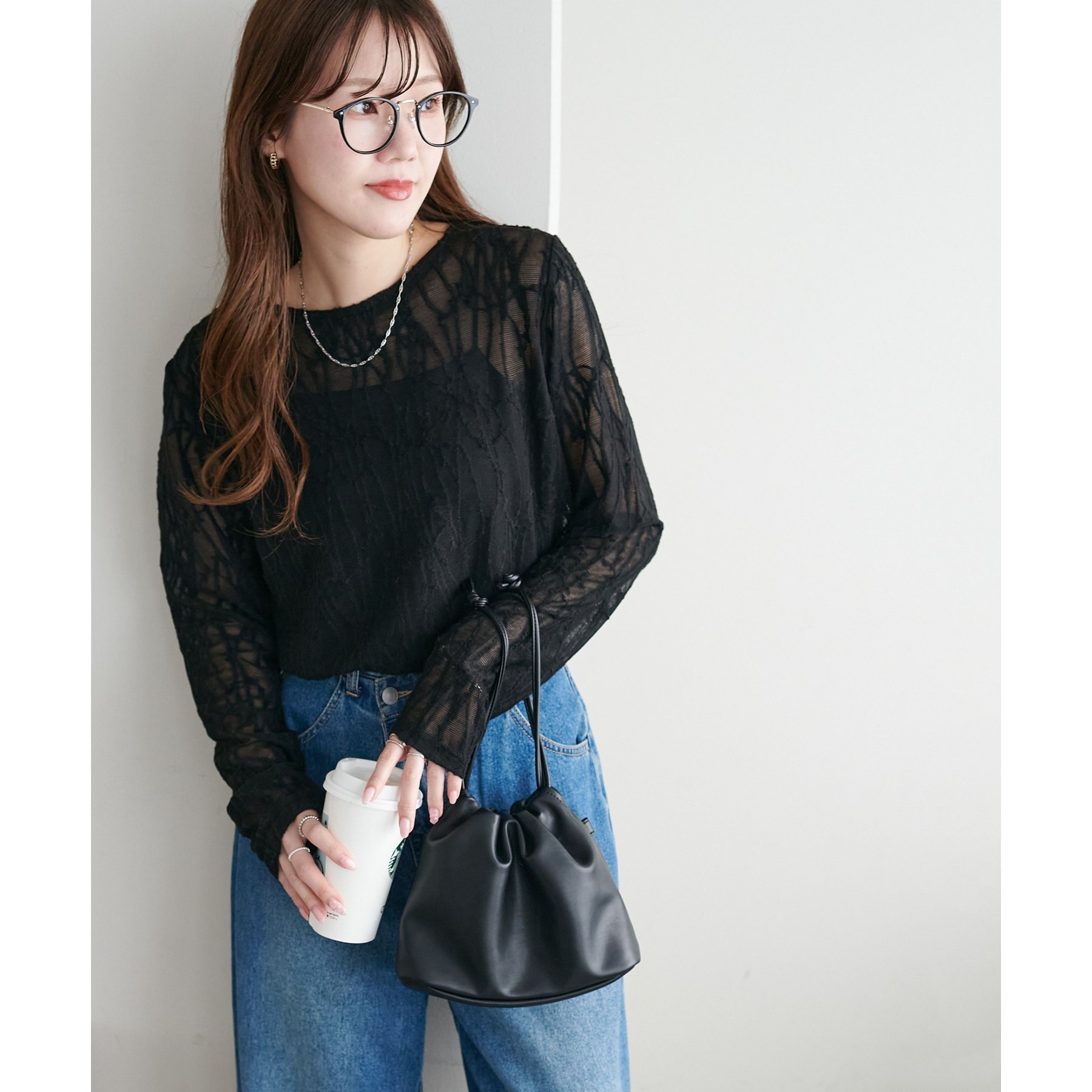 153cmスタッフ:程よい透け感があるので、夏から秋に変わっていくタイミングにぴったりのトップスです〇