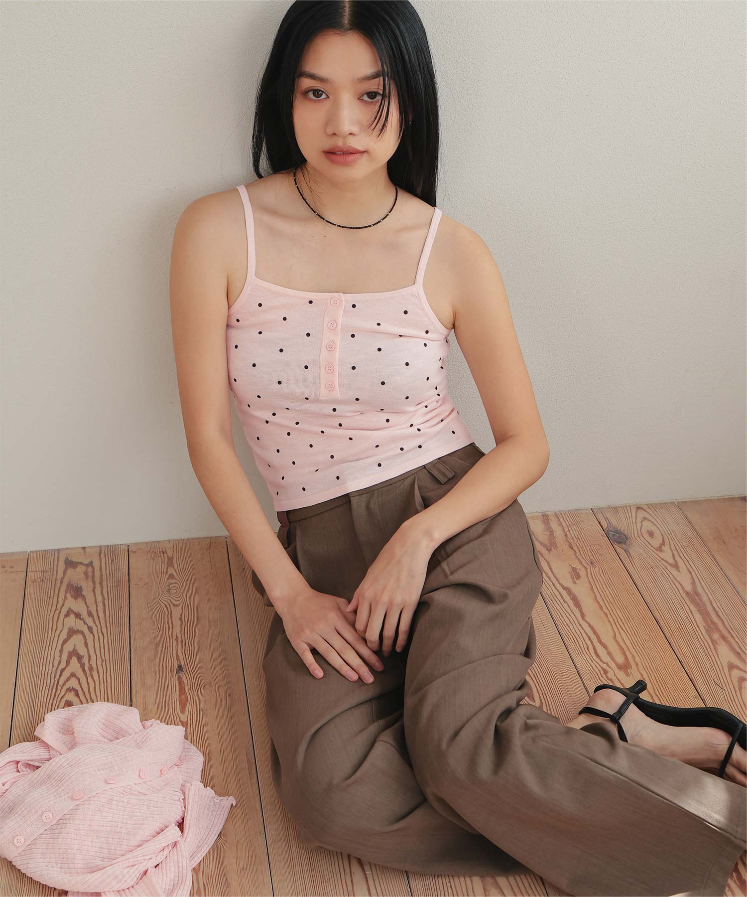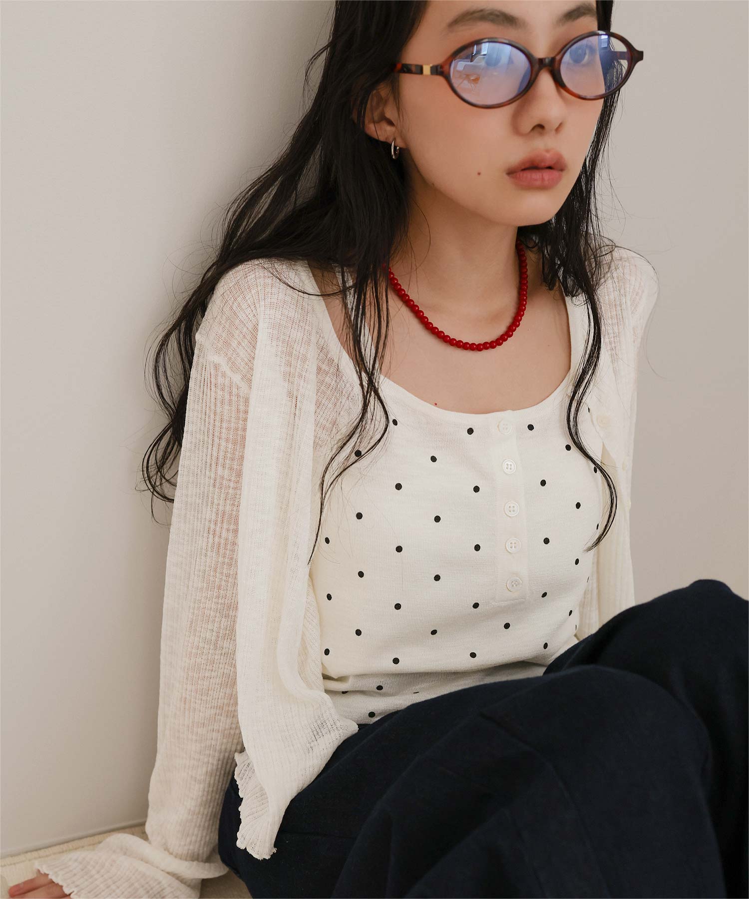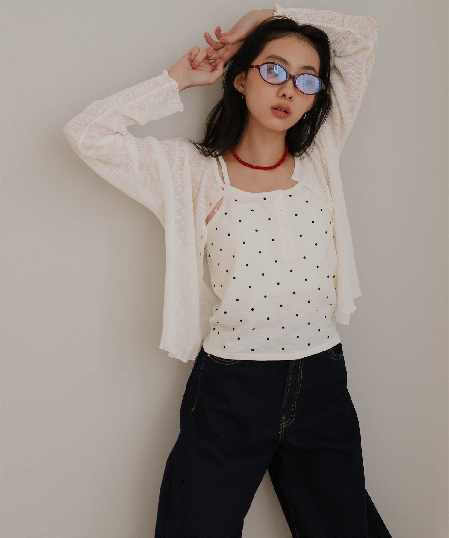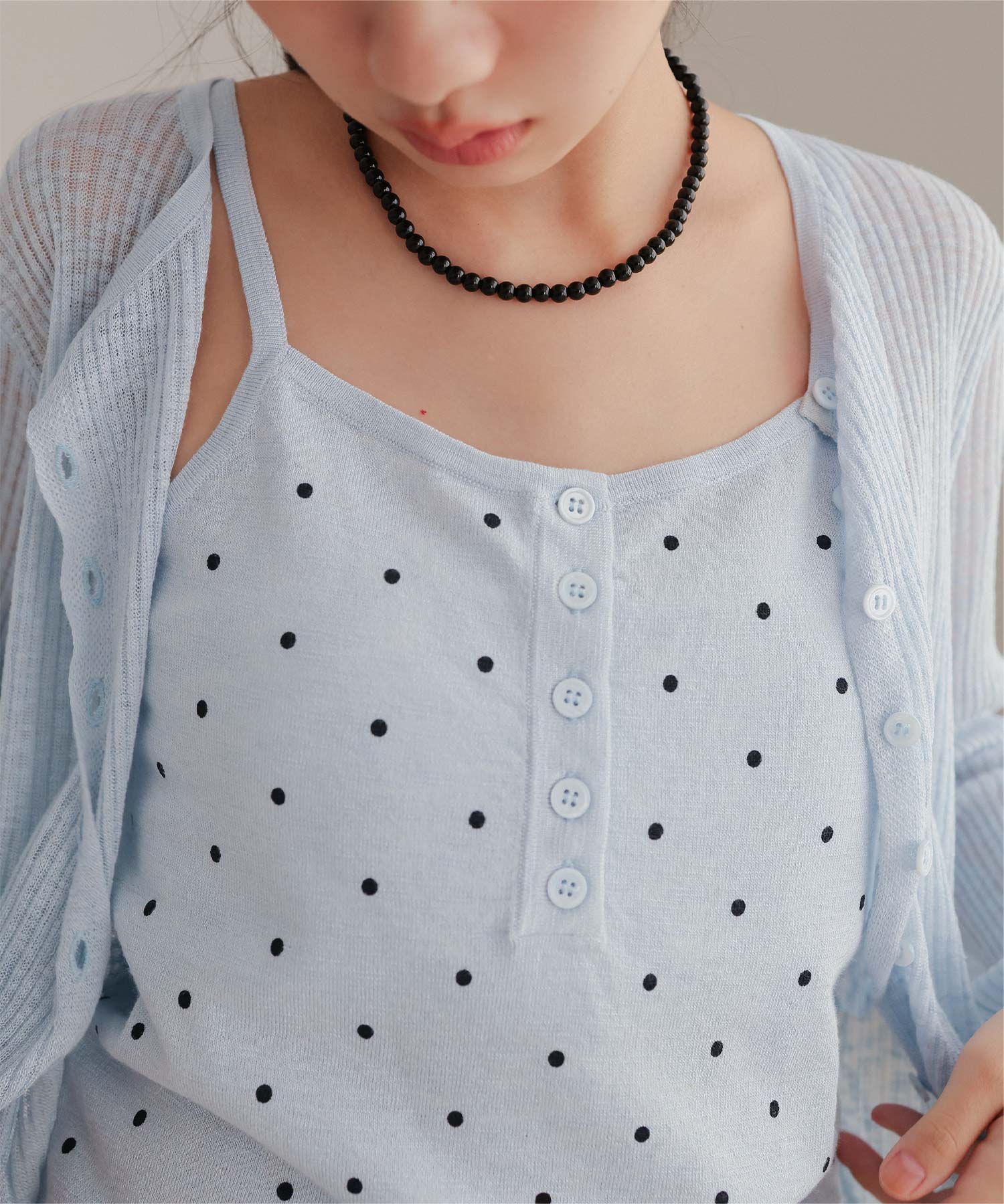 ・シアーな透け感が軽やかなカーディガンと、ドットプリントが可愛いキャミソールのセットアイテム