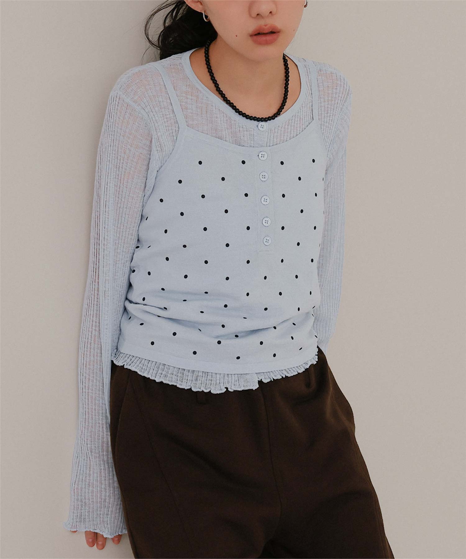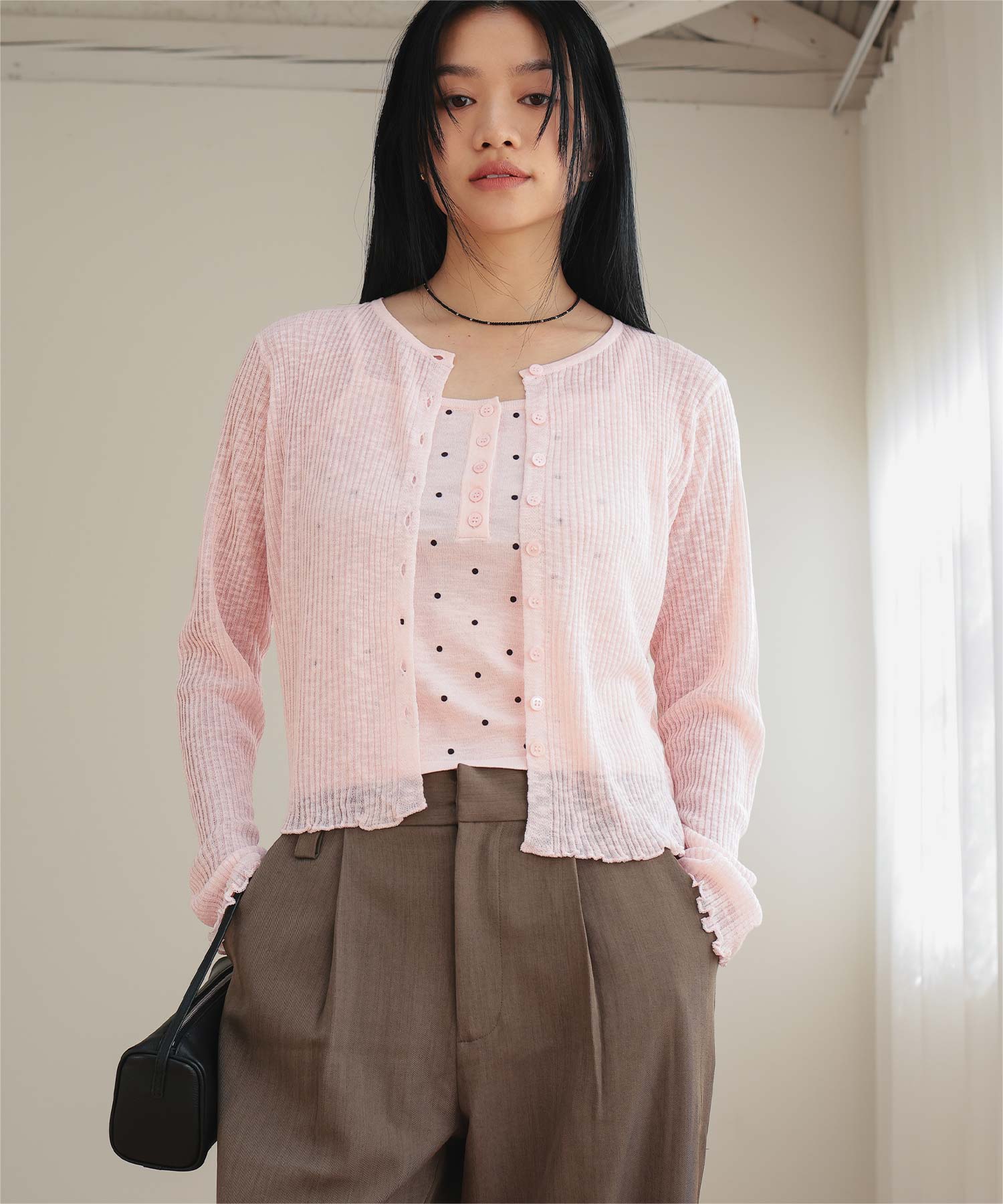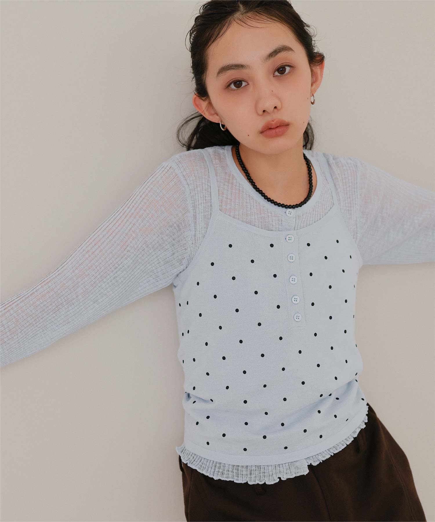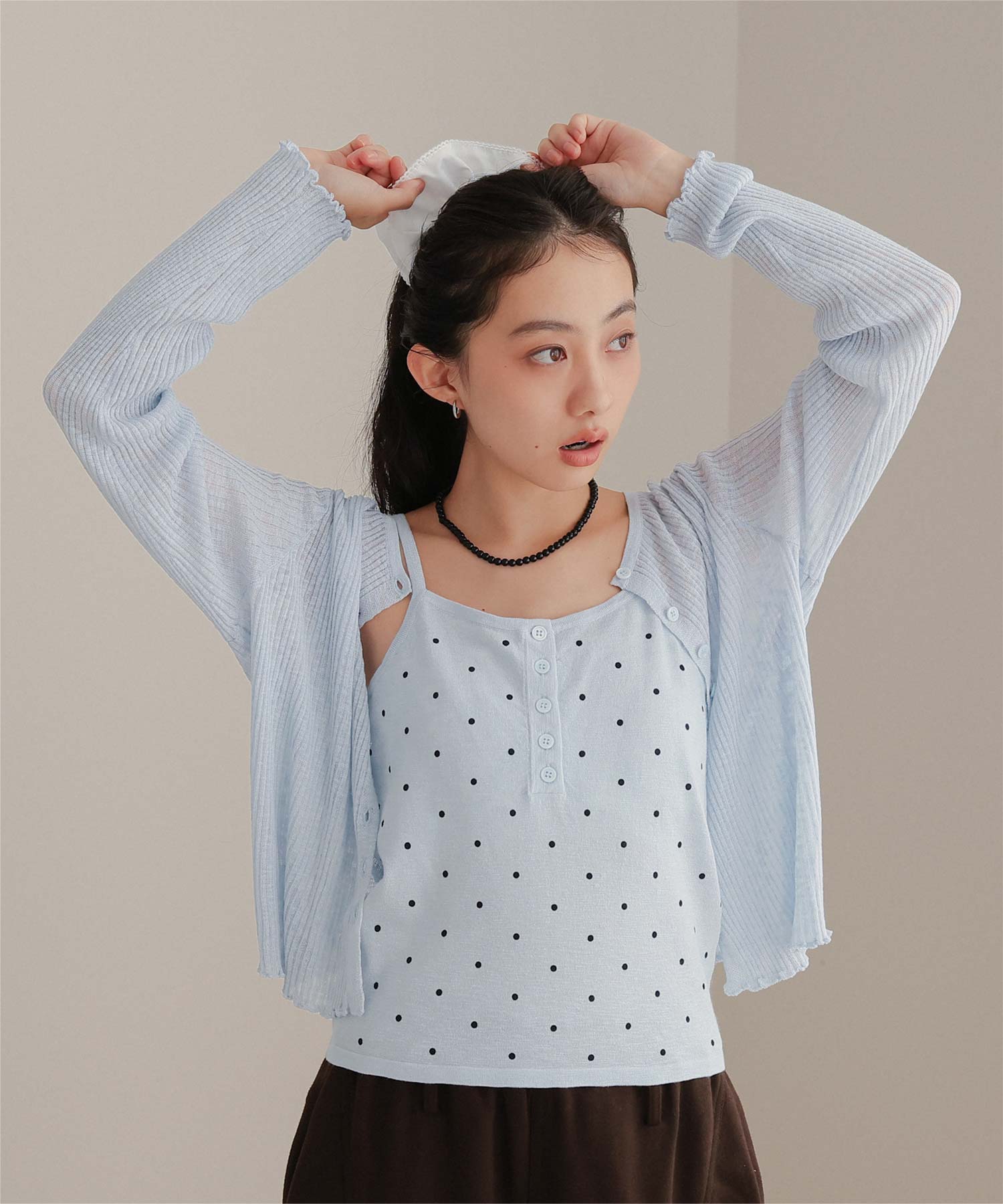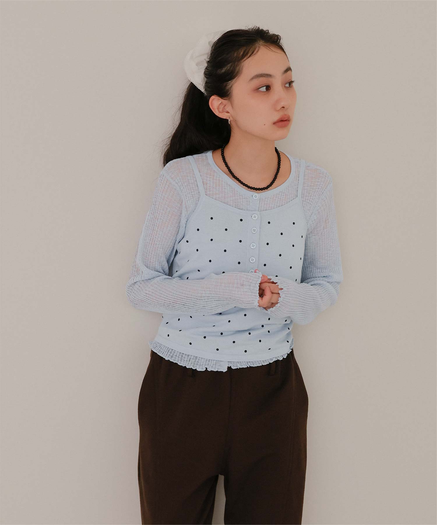 ・シアーな透け感が軽やかなカーディガンと、ドットプリントが可愛いキャミソールのセットアイテム