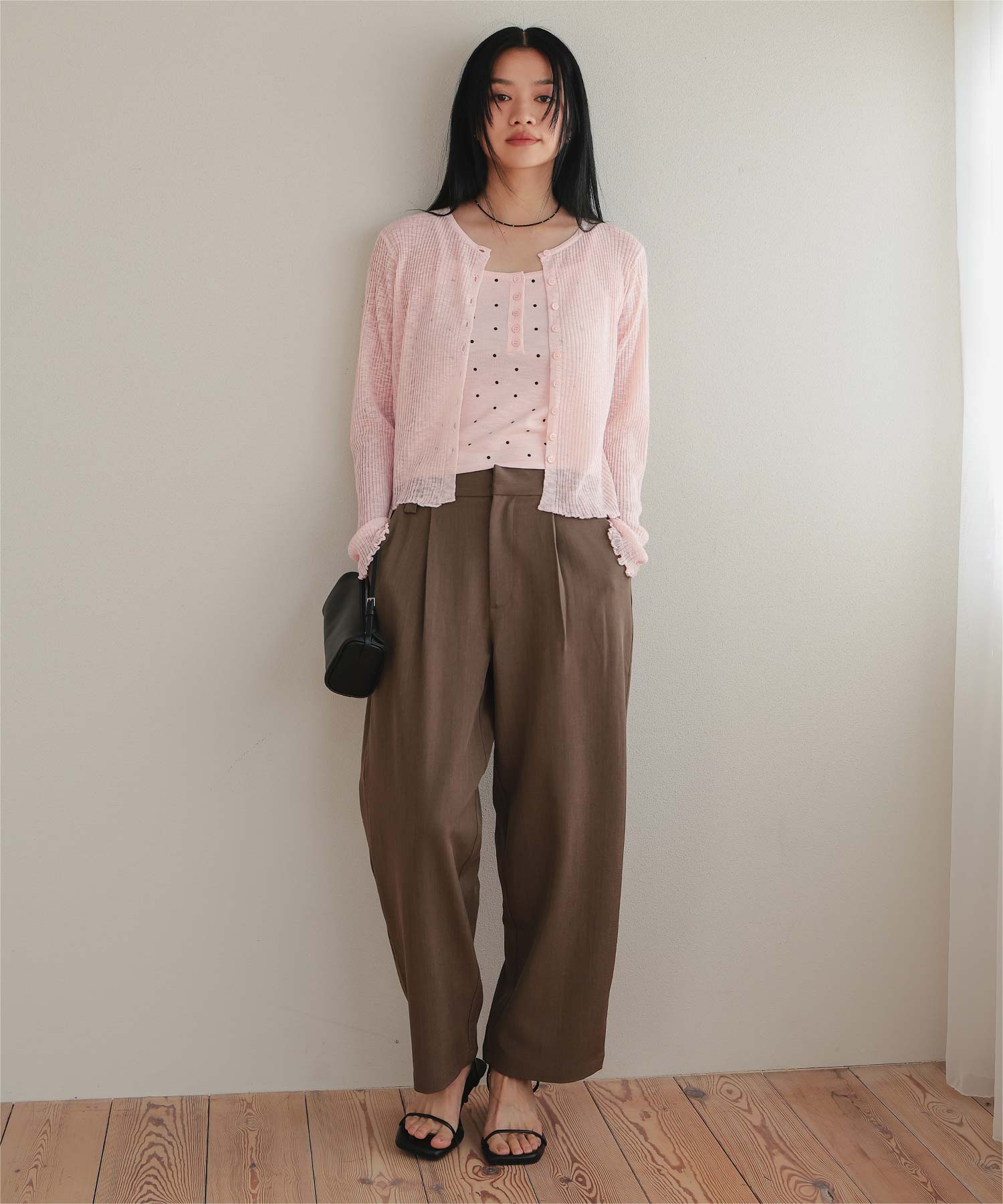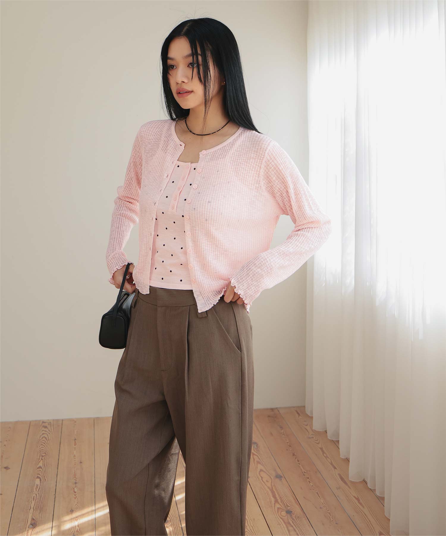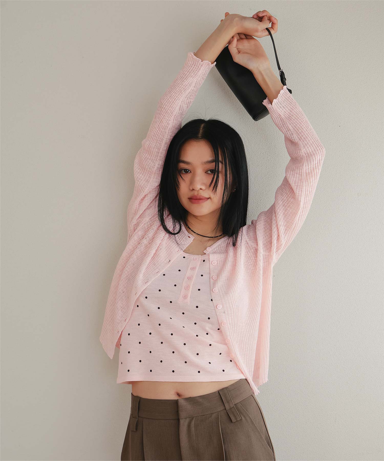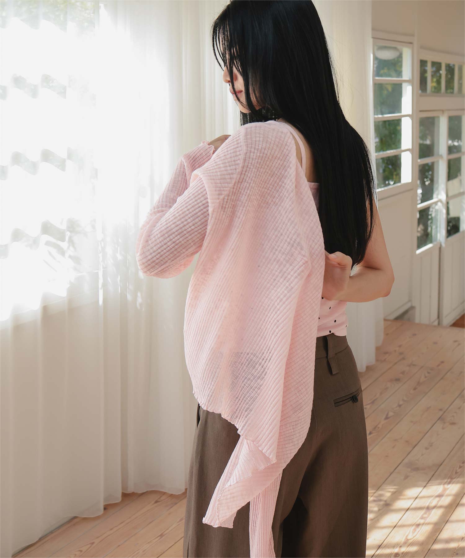 ・シアーな透け感が軽やかなカーディガンと、ドットプリントが可愛いキャミソールのセットアイテム
